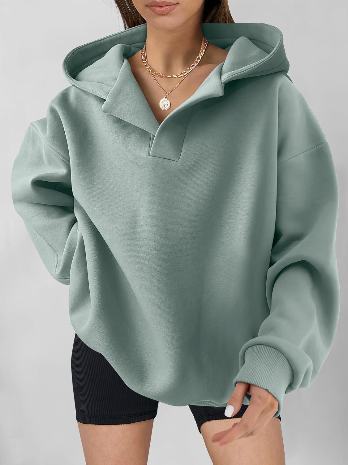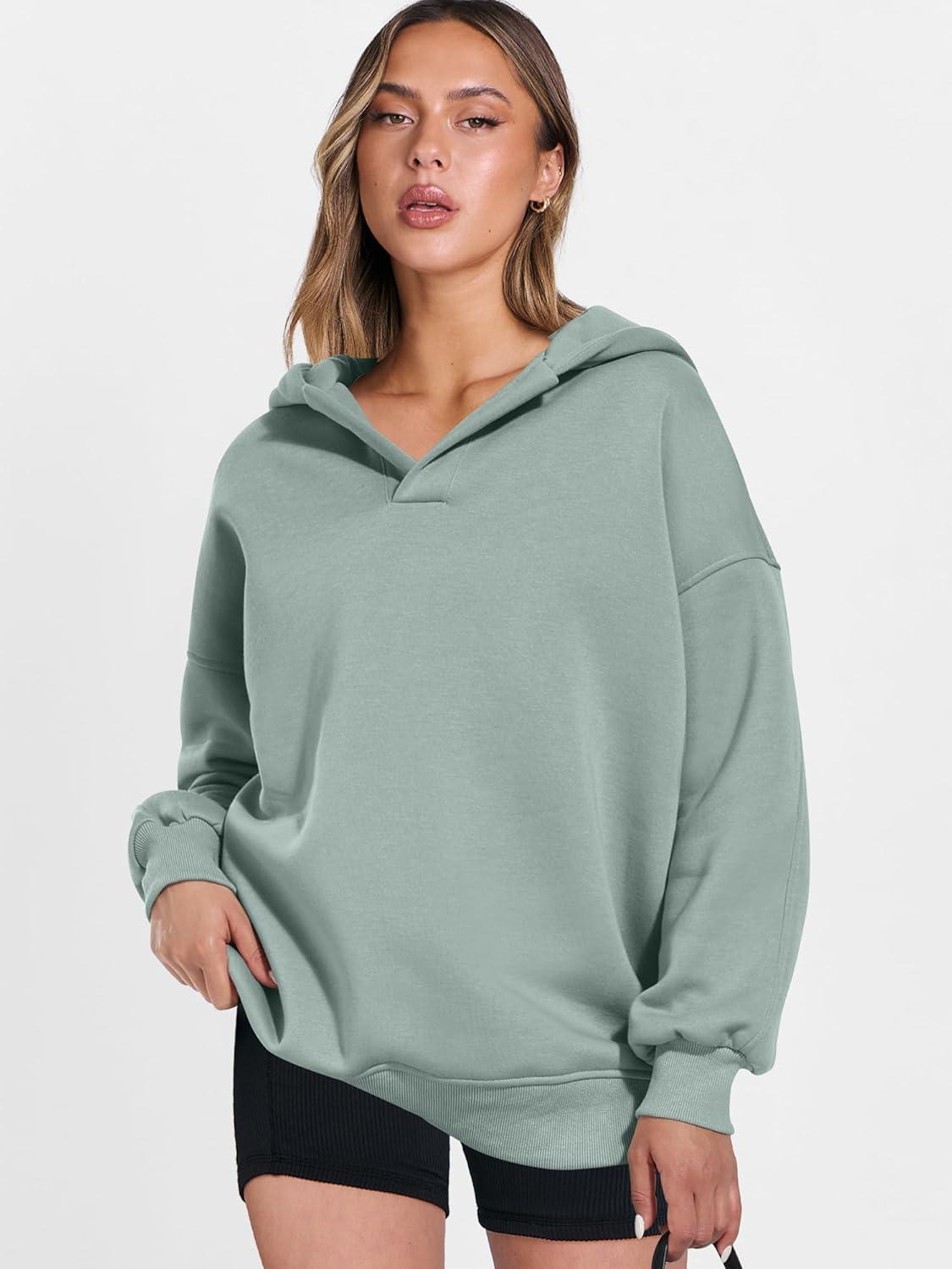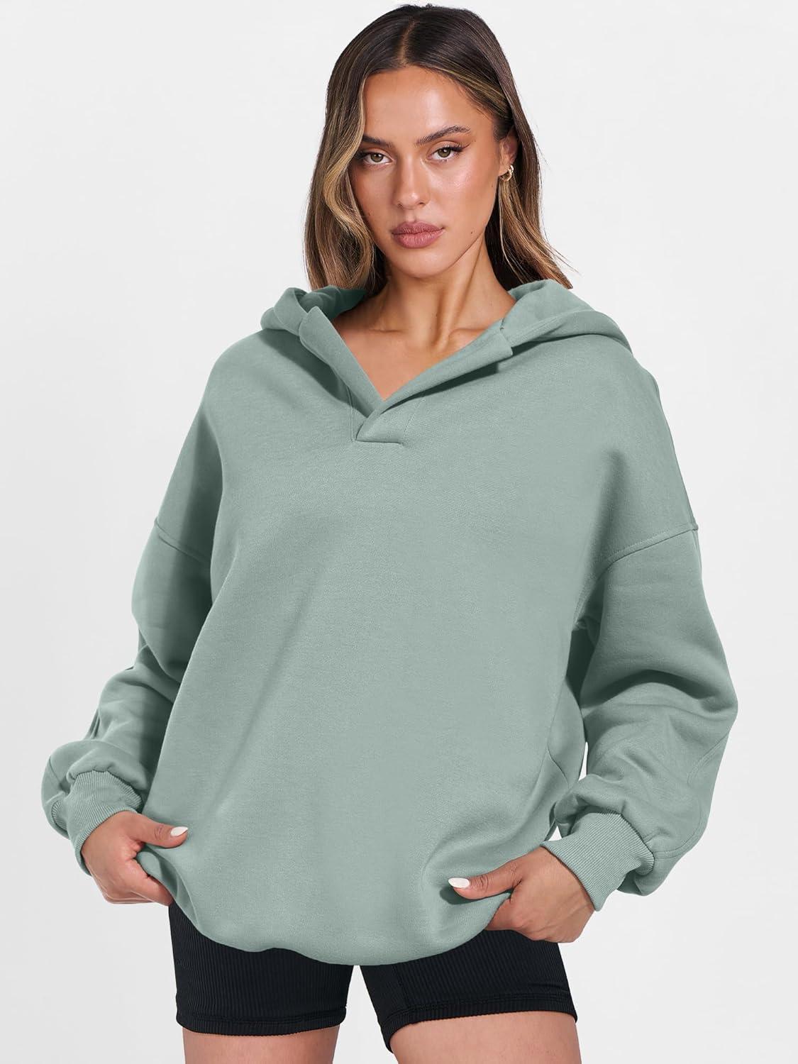 ANRABESS Womens Oversized Hoodies V Neck Sweatshirts Fleece Long Sleeve Pullover Y2K Clothes 2025 Fall Trendy Outfits(Sage Green)
