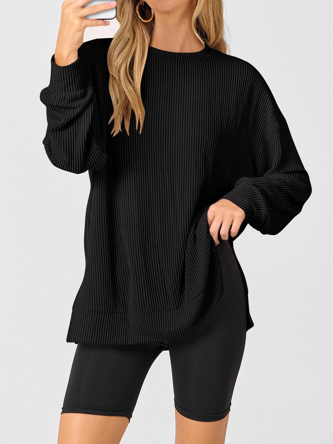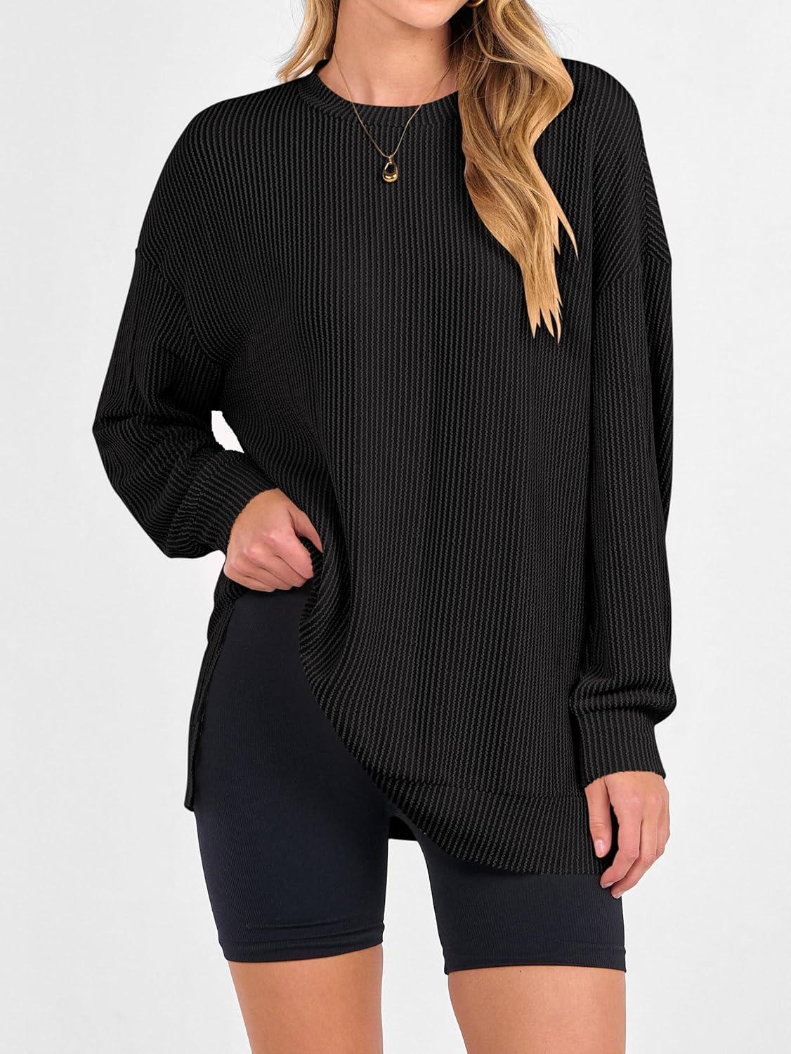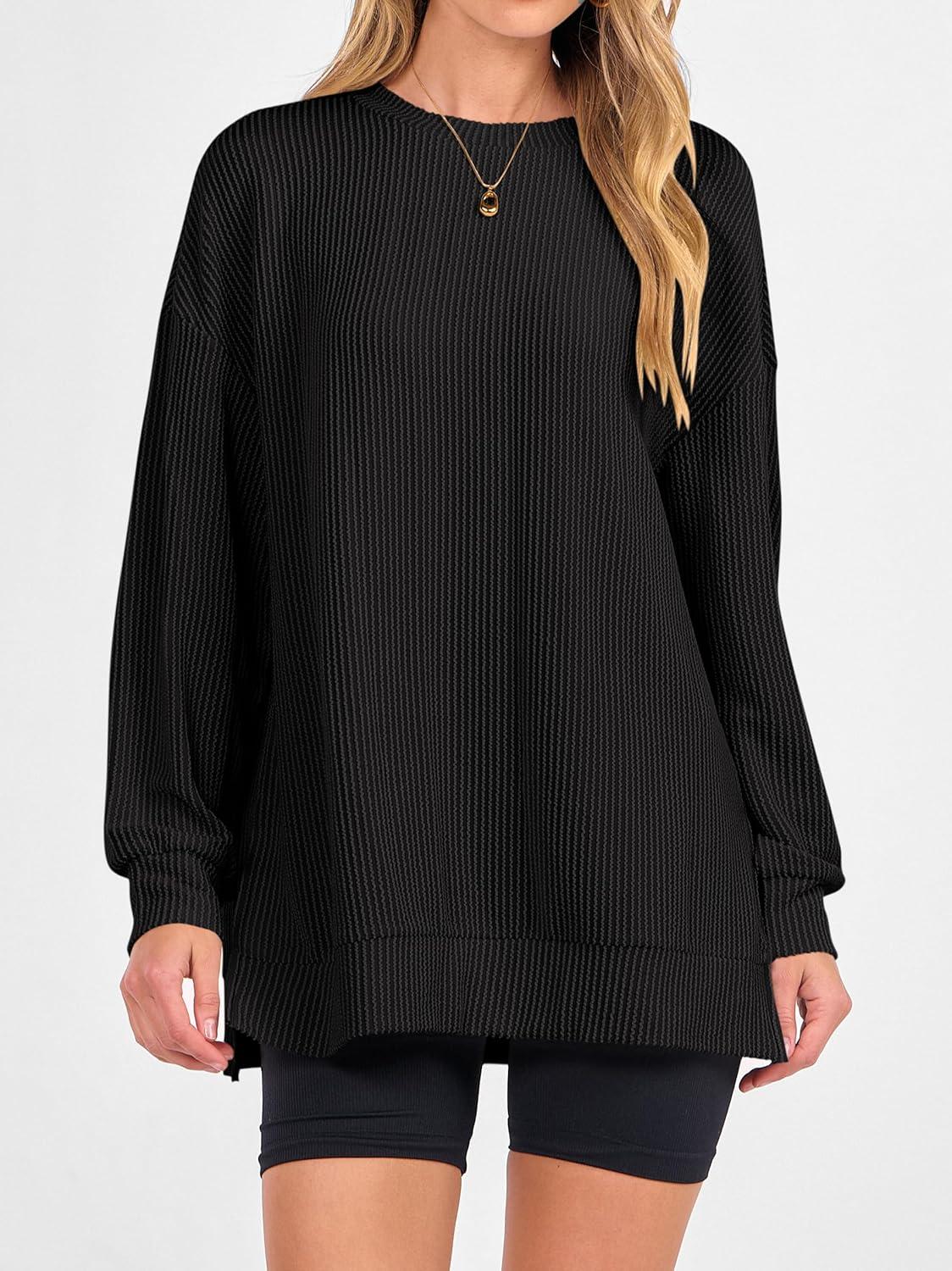 ANRABESS Womens Oversized Long Sleeve Shirts Ribbed Knit Tunic Tops Side Spilt Casual 2025 Fall Outfits(Black)