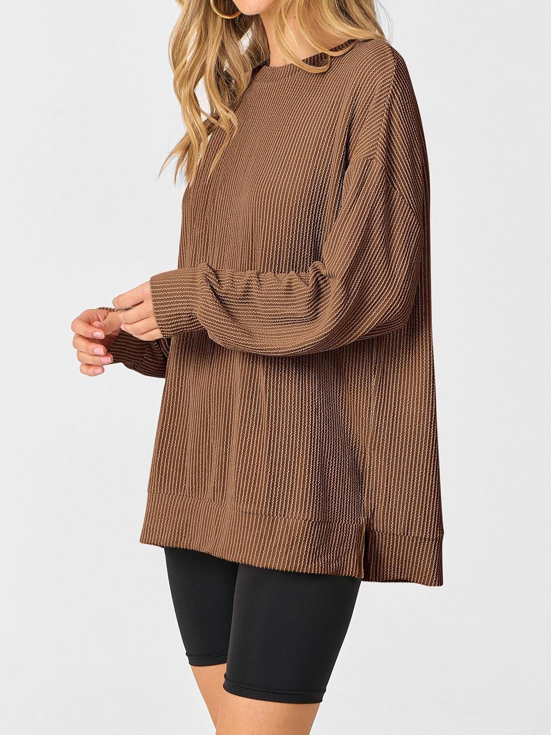 ANRABESS Womens Oversized Long Sleeve Shirts Ribbed Knit Tunic Tops Side Spilt Casual 2025 Fall Outfits(Brown)