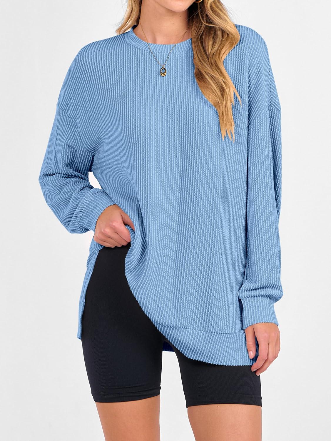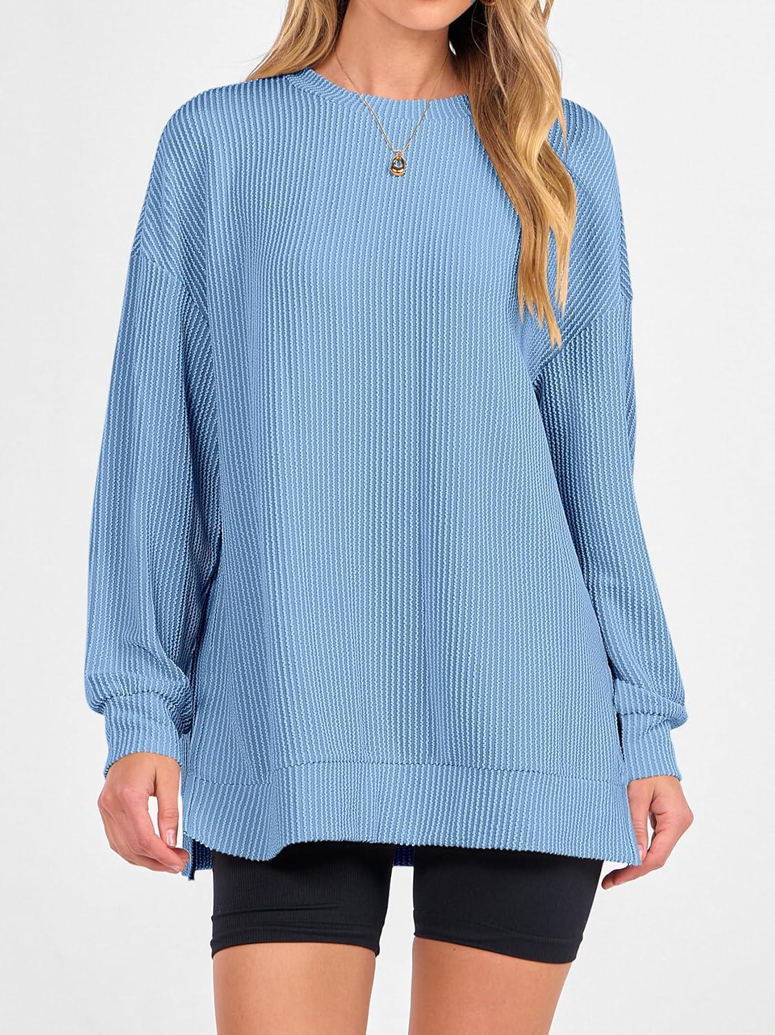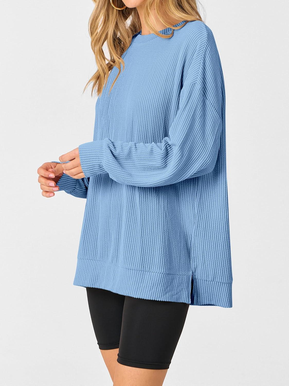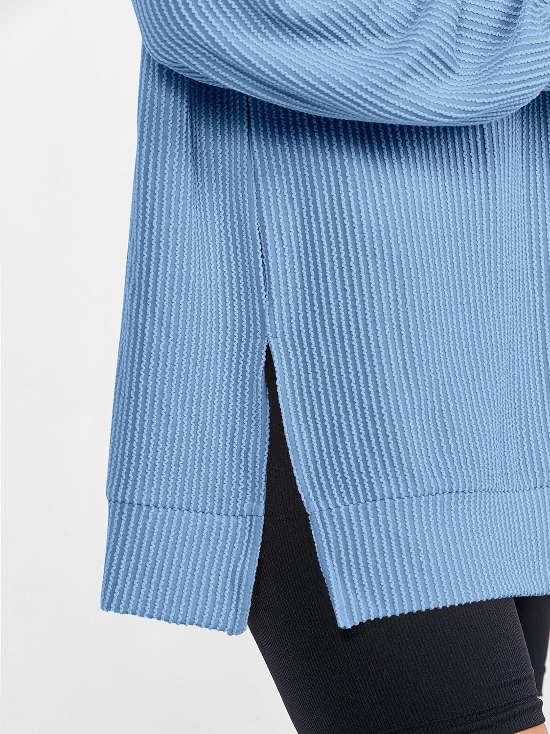 ANRABESS Womens Oversized Long Sleeve Shirts Ribbed Knit Tunic Tops Side Spilt Casual 2025 Fall Outfits(Light Blue)