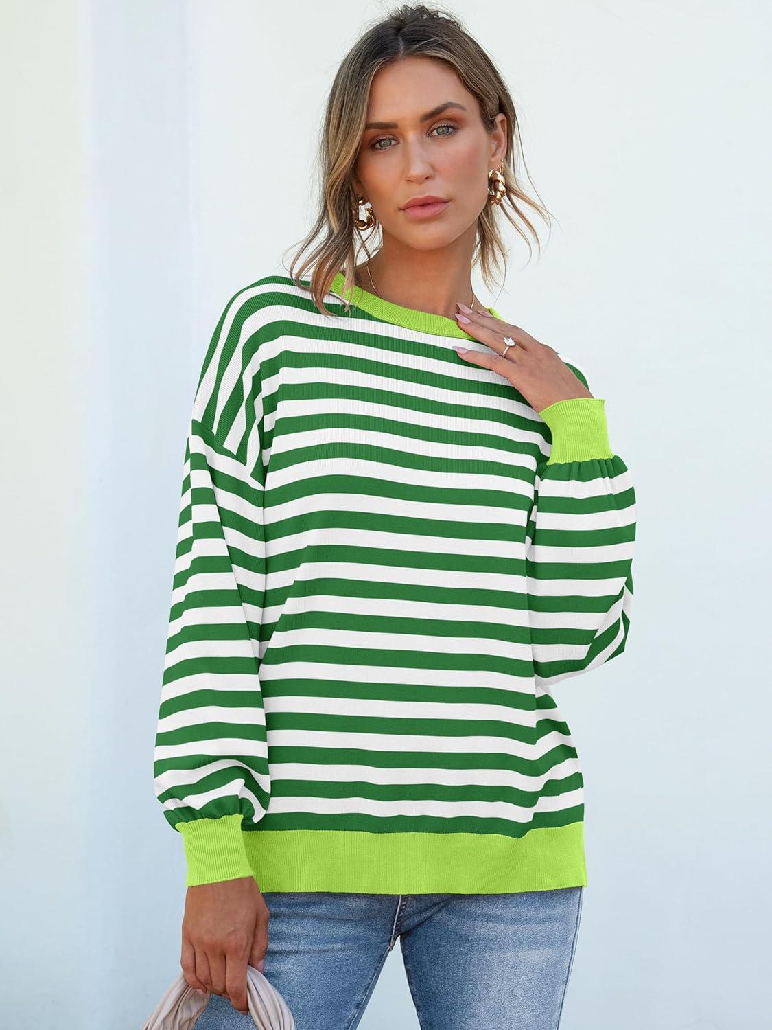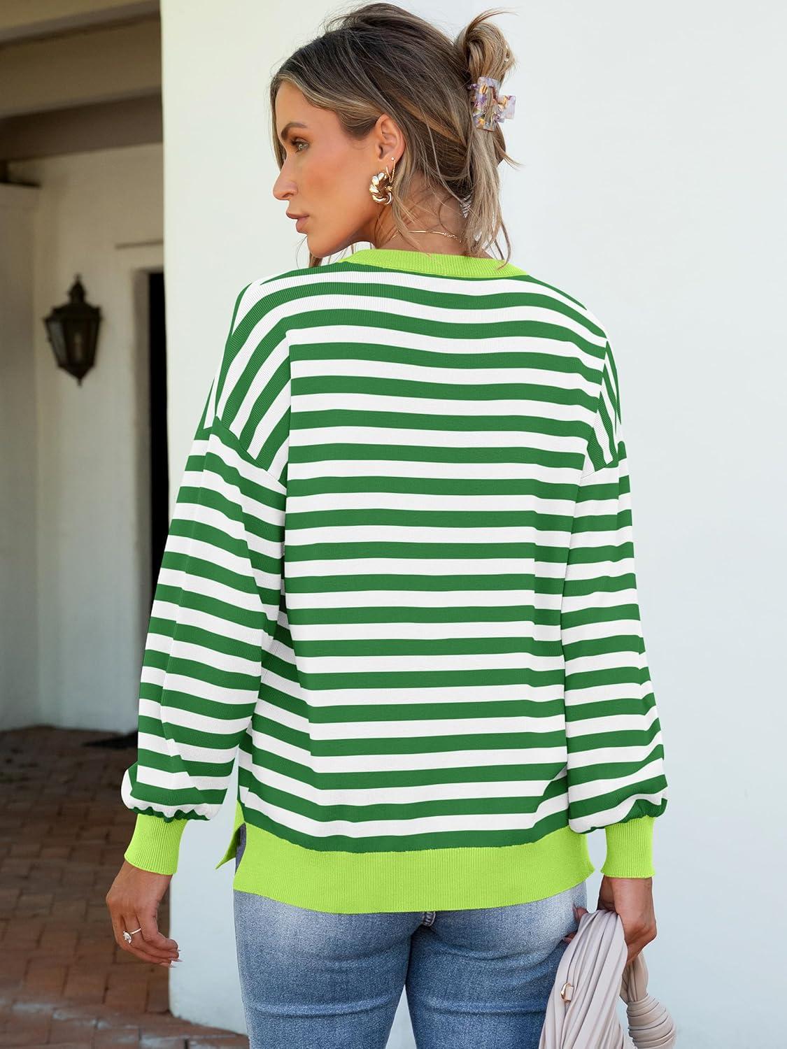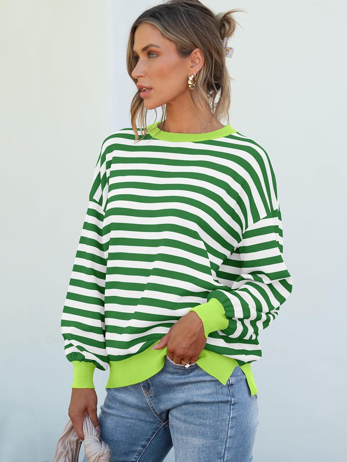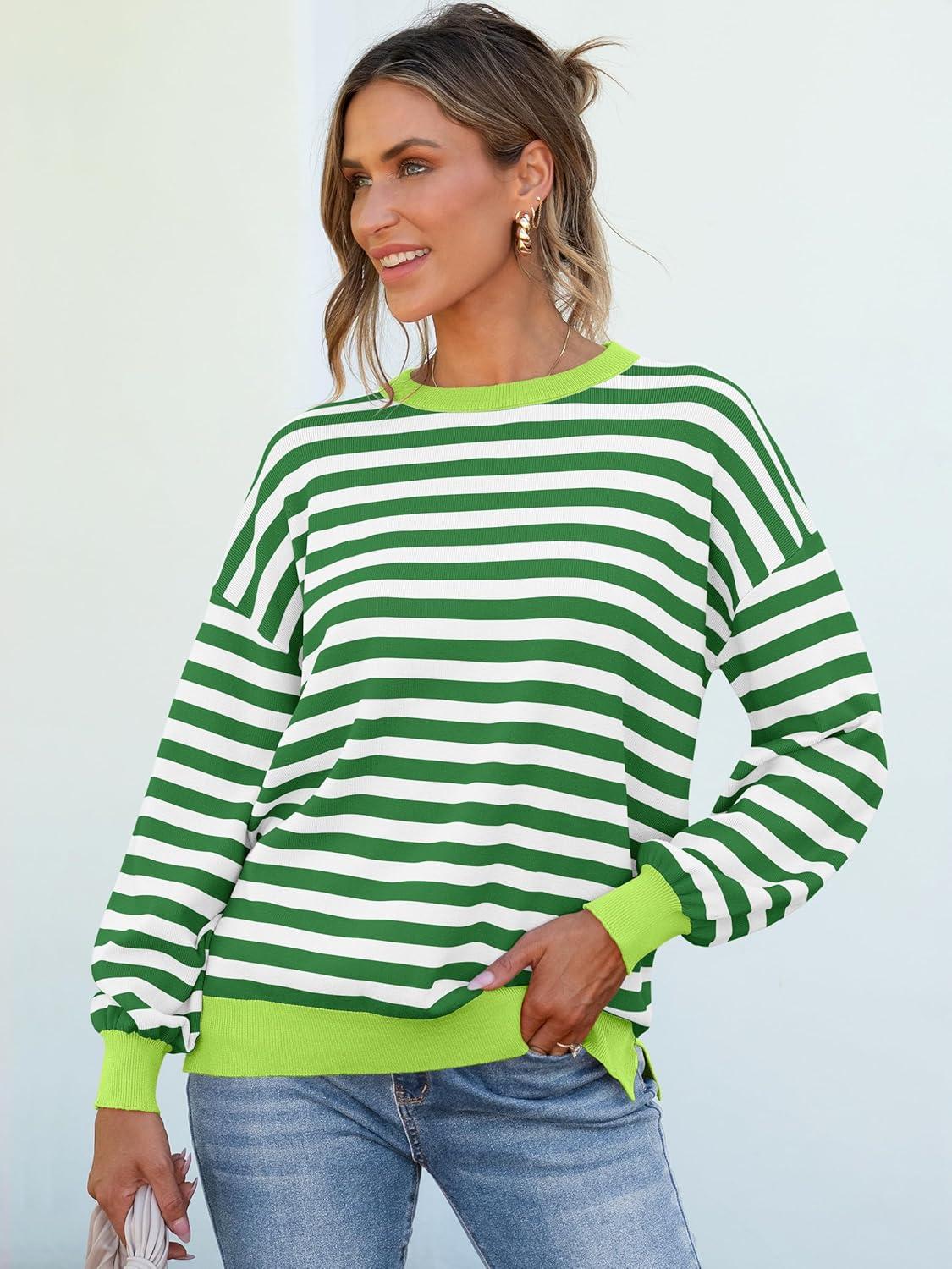 ANRABESS Womens Oversized Striped Sweaters Long Sleeve Crewneck Casual Side Slit Pullover Tops 2025 Fall Trendy Outfits(Green White)