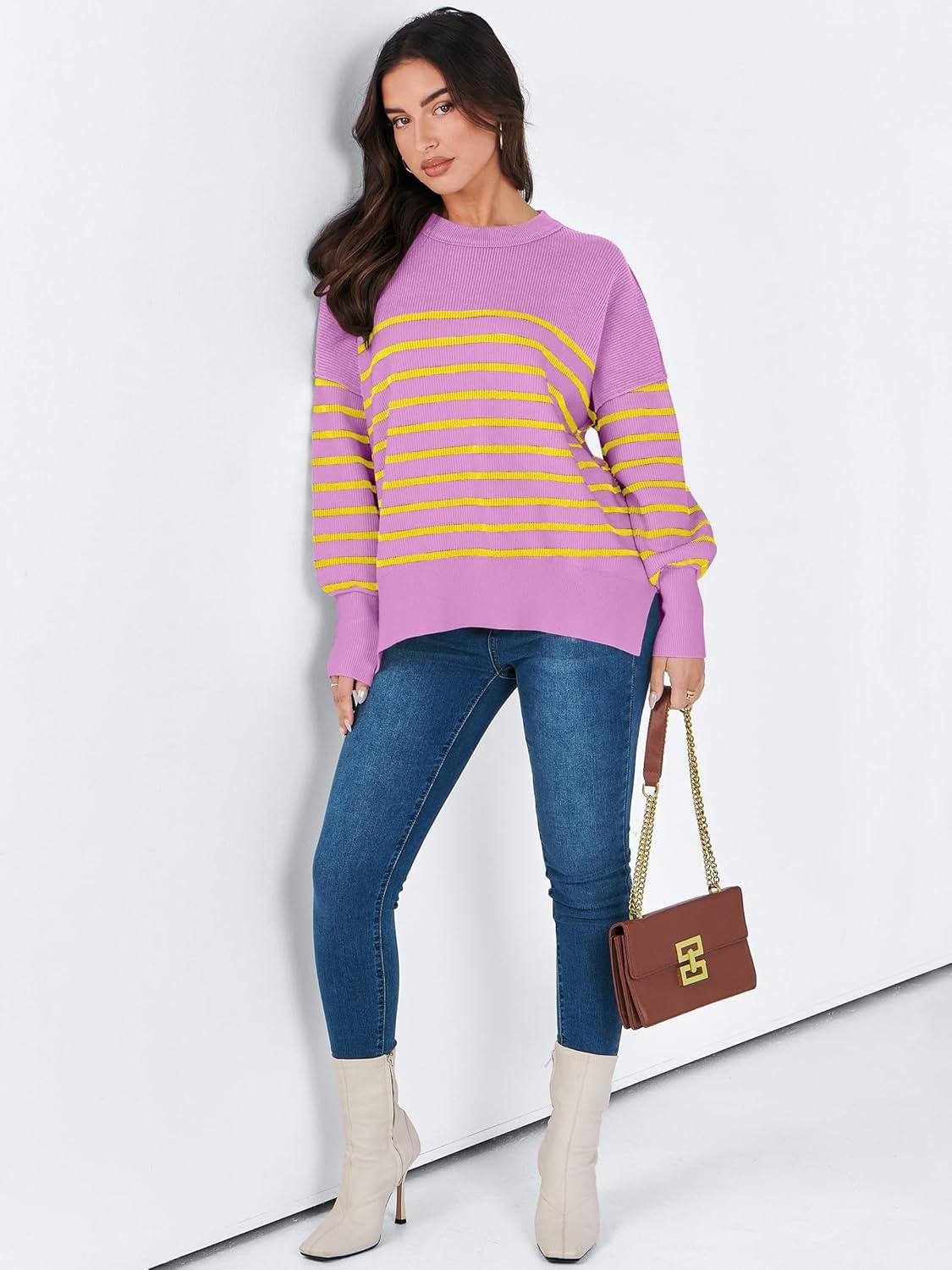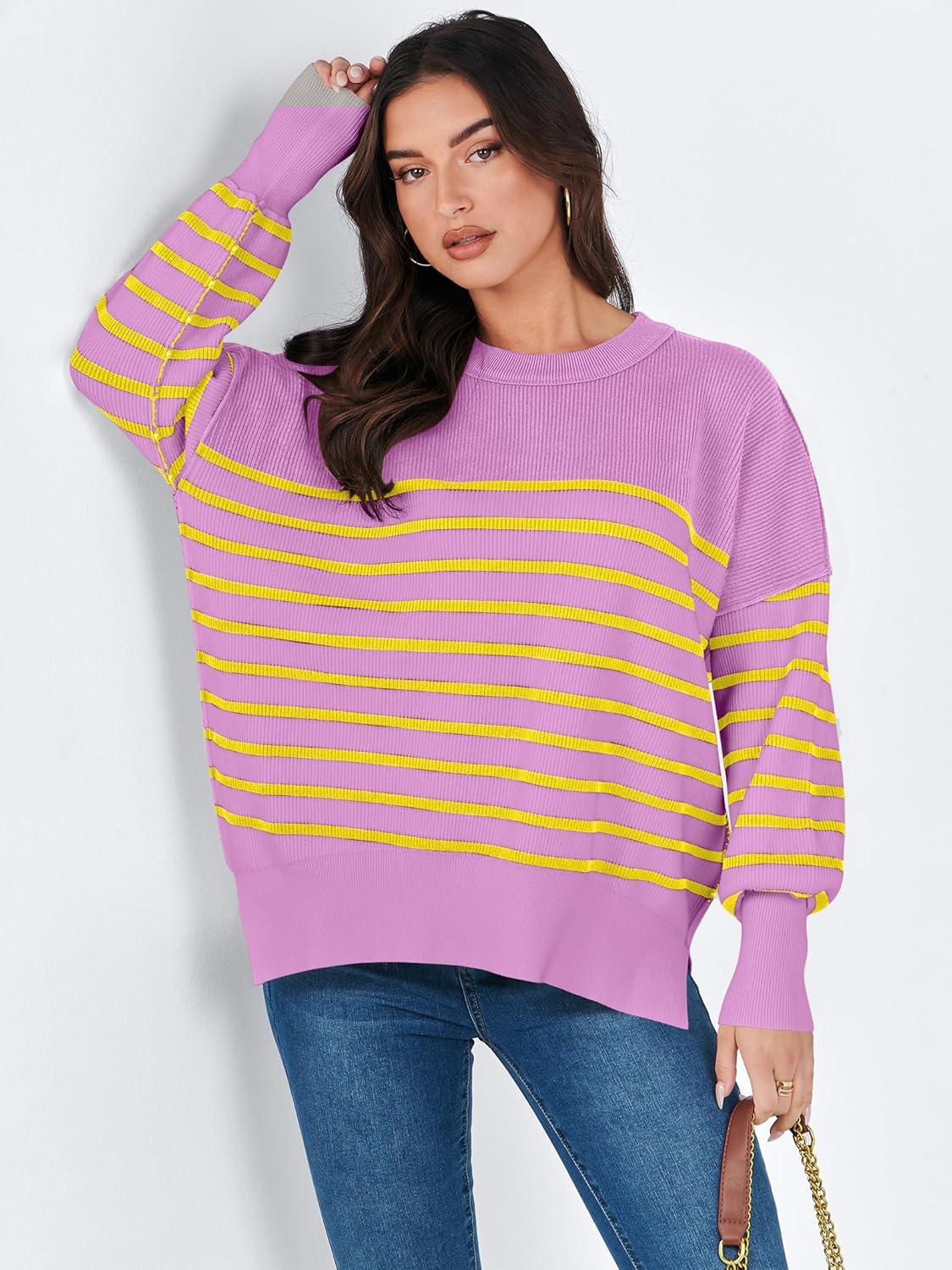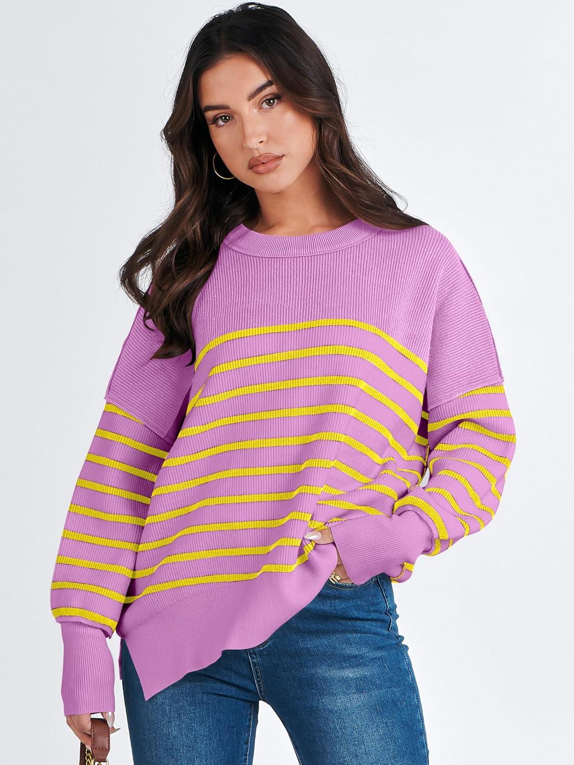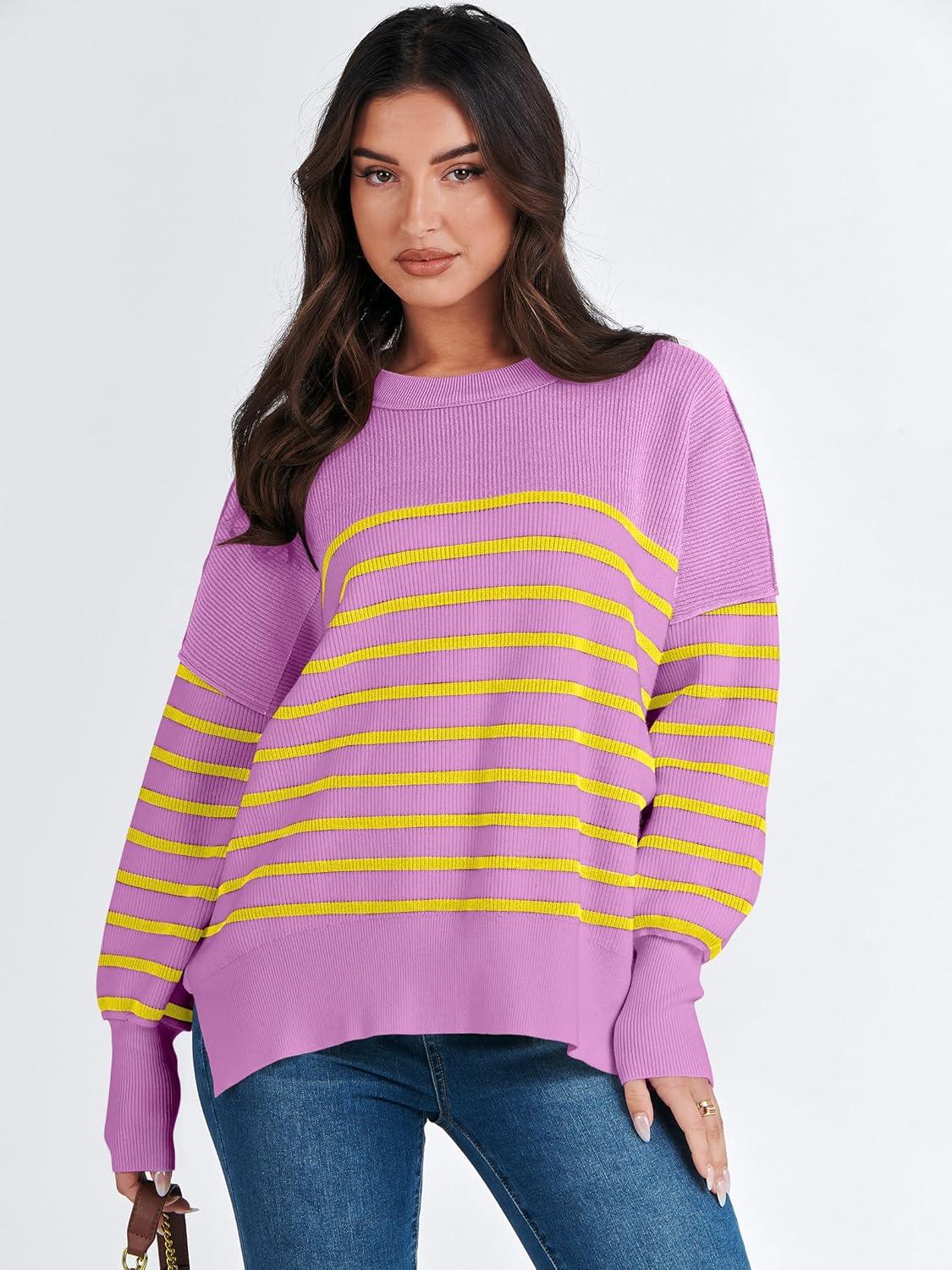ANRABESS Womens Oversized Sweaters Fall 2025 Fashion Crewneck Batwing Long Sleeve Side Slit Knit Pullover Sweater Tops(Double Stripe Black)