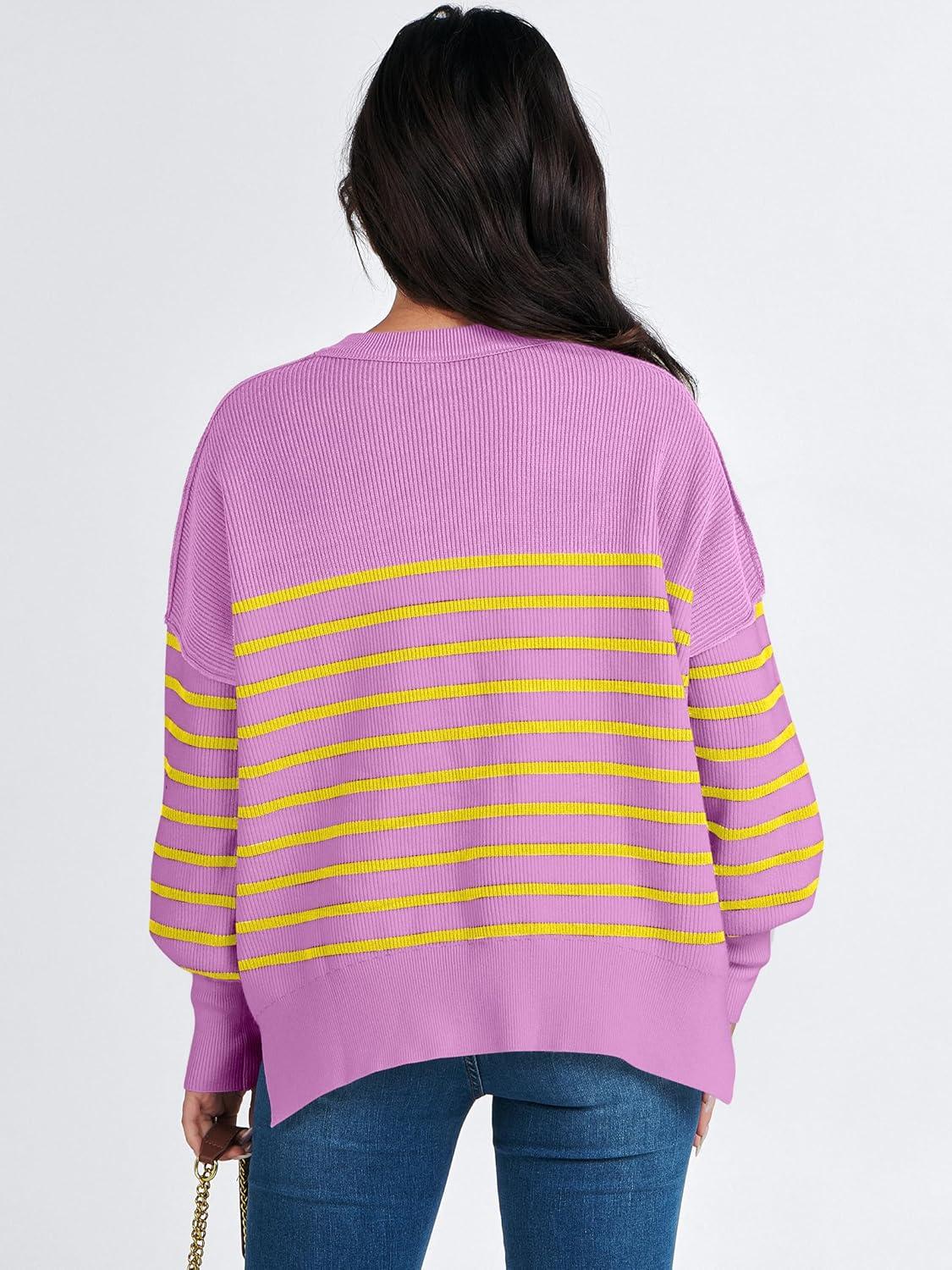imageANRABESS Womens Oversized Sweaters Fall 2025 Fashion Crewneck Batwing Long Sleeve Side Slit Knit Pullover Sweater TopsStripe Khaki Black