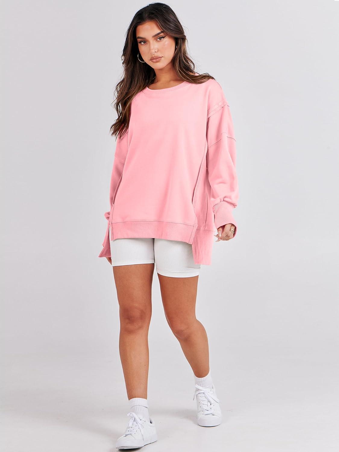 ANRABESS Womens Oversized Sweatshirts Crew Neck Long Sleeve Shirts Casual Loose Slit 2025 Fall Outfits Y2K Teen Girls Clothes(Pink)