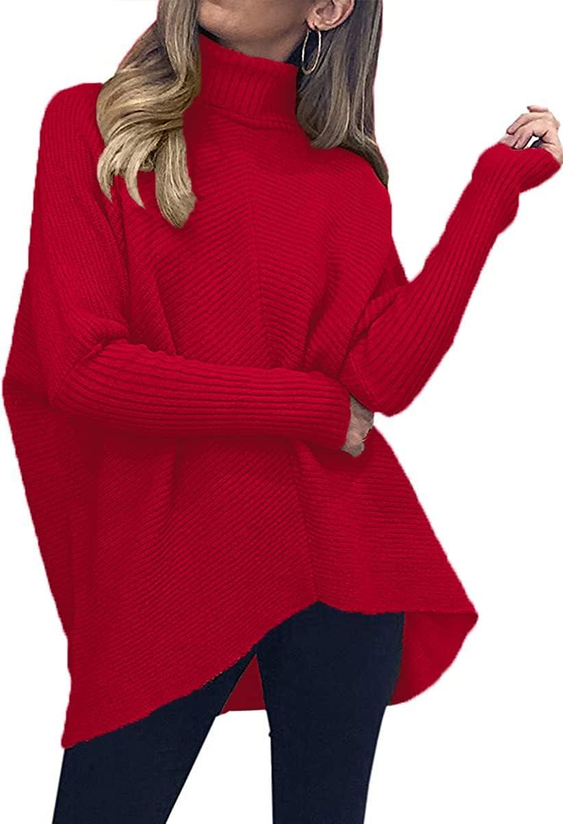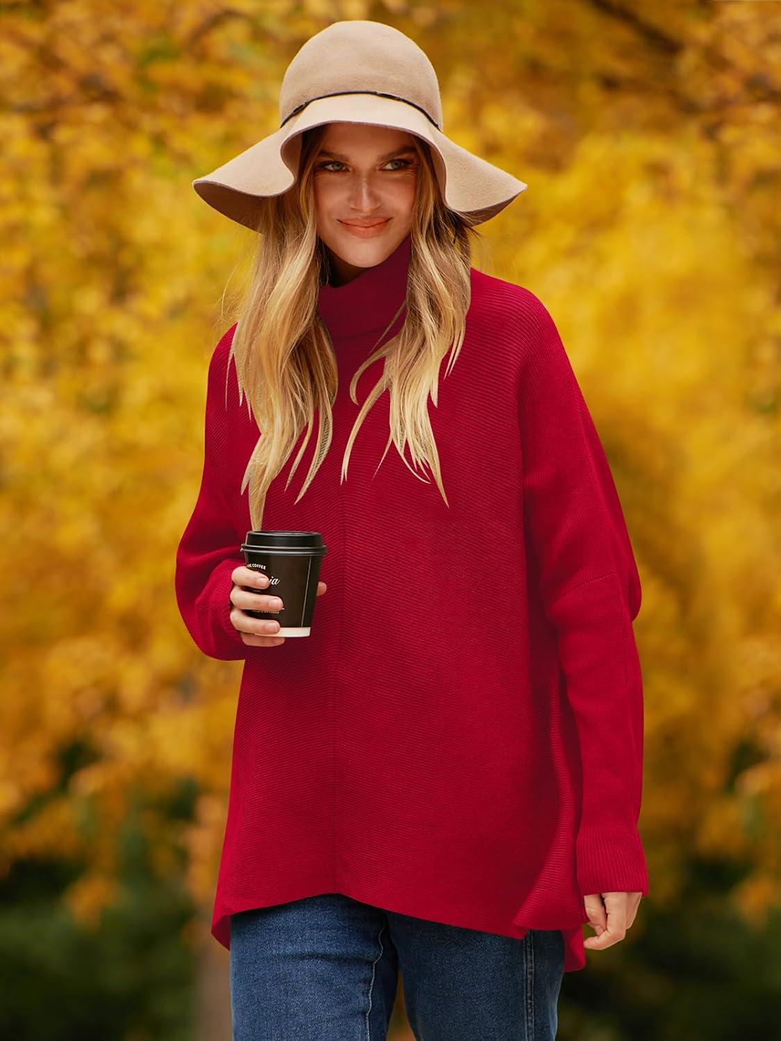 ANRABESS Womens Oversized Turtleneck Batwing Long Sleeve Casual Cozy Baggy Knit Pullover Tunic Sweater 2025 Fall Outfits(Red)