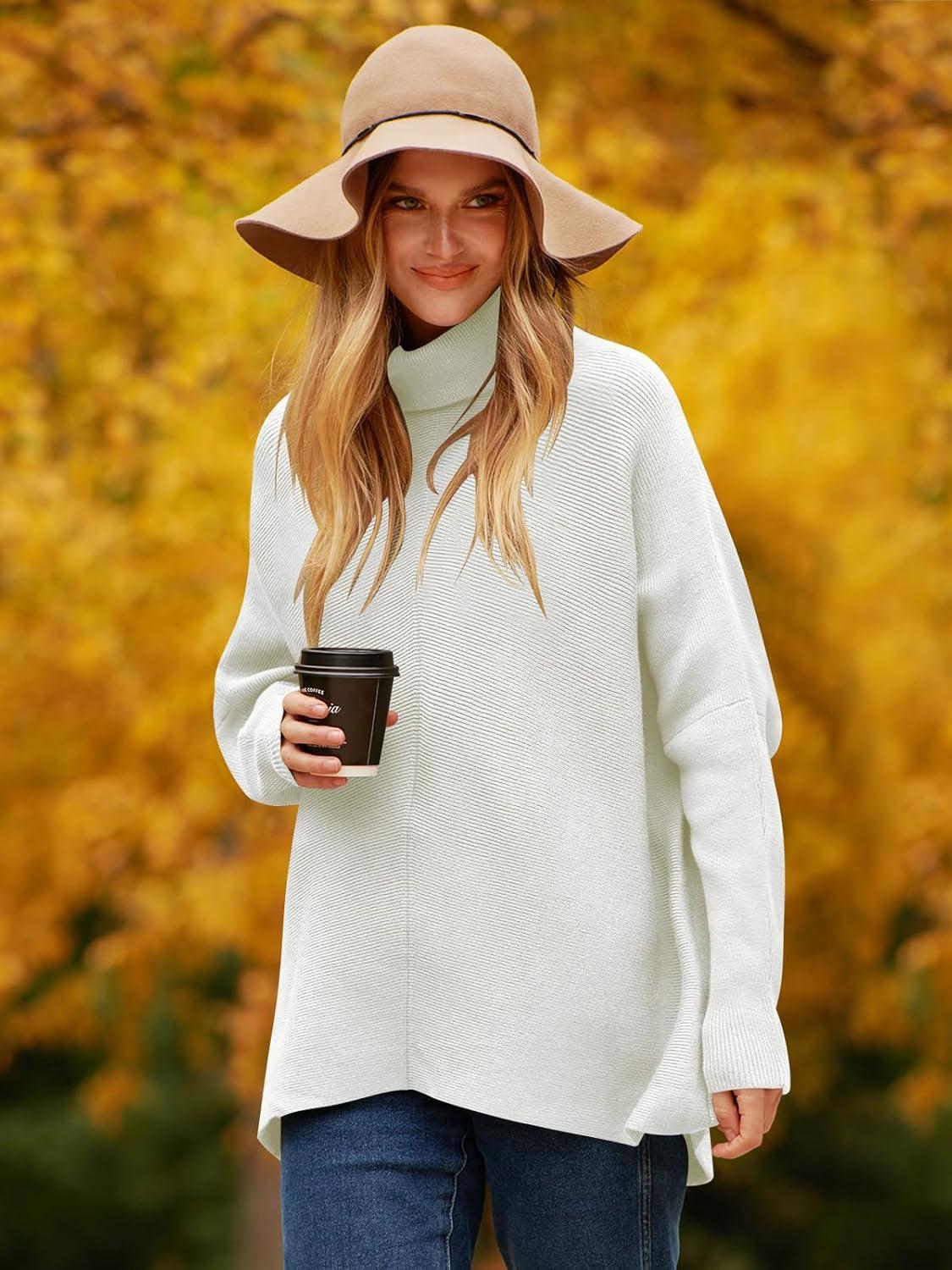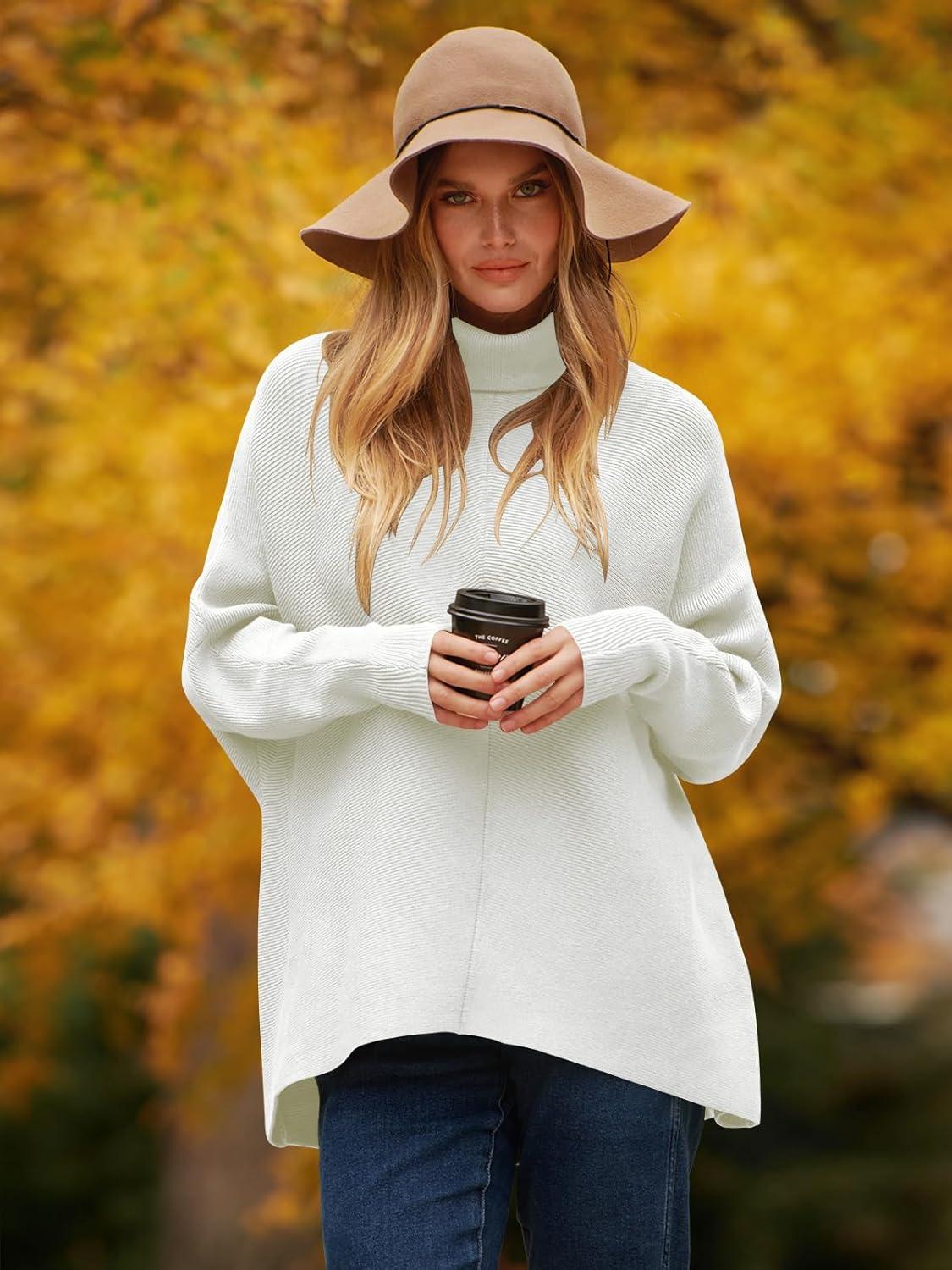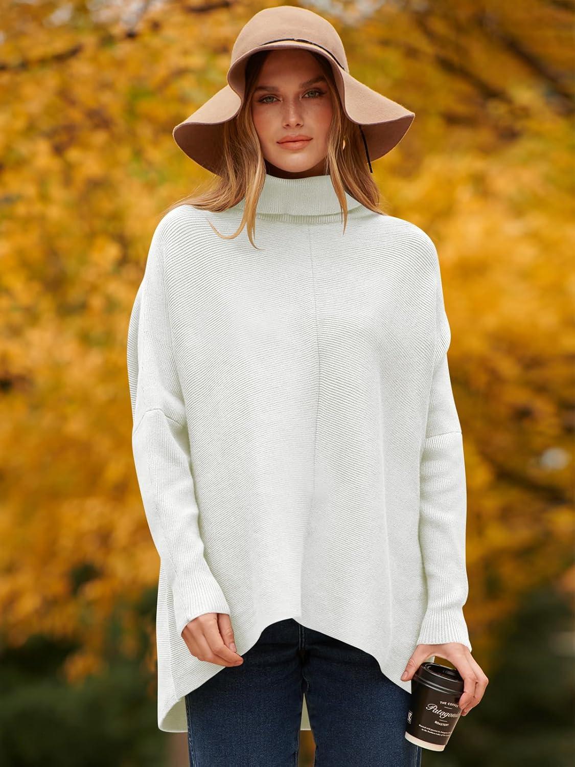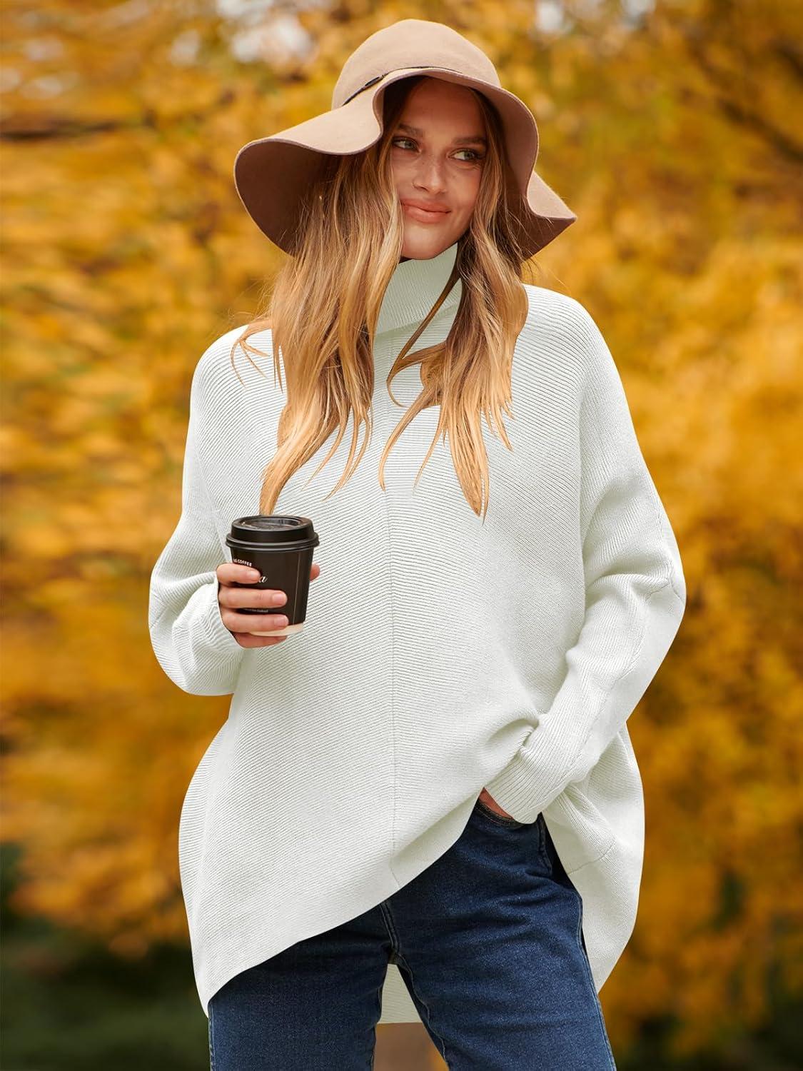ANRABESS Womens Oversized Turtleneck Batwing Long Sleeve Casual Cozy Baggy Knit Pullover Tunic Sweater 2025 Fall Outfits(White)