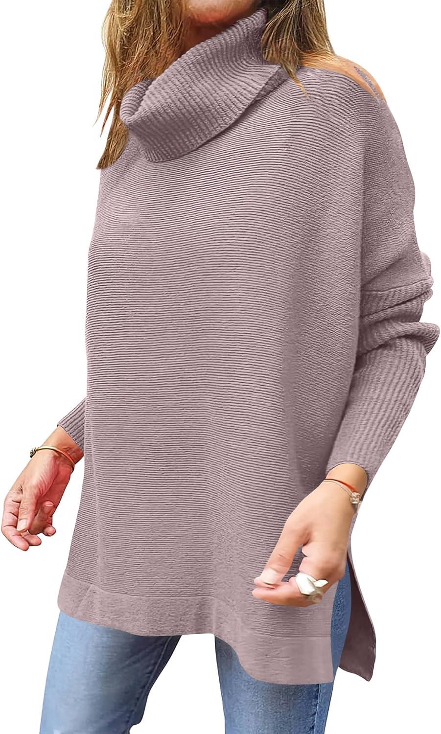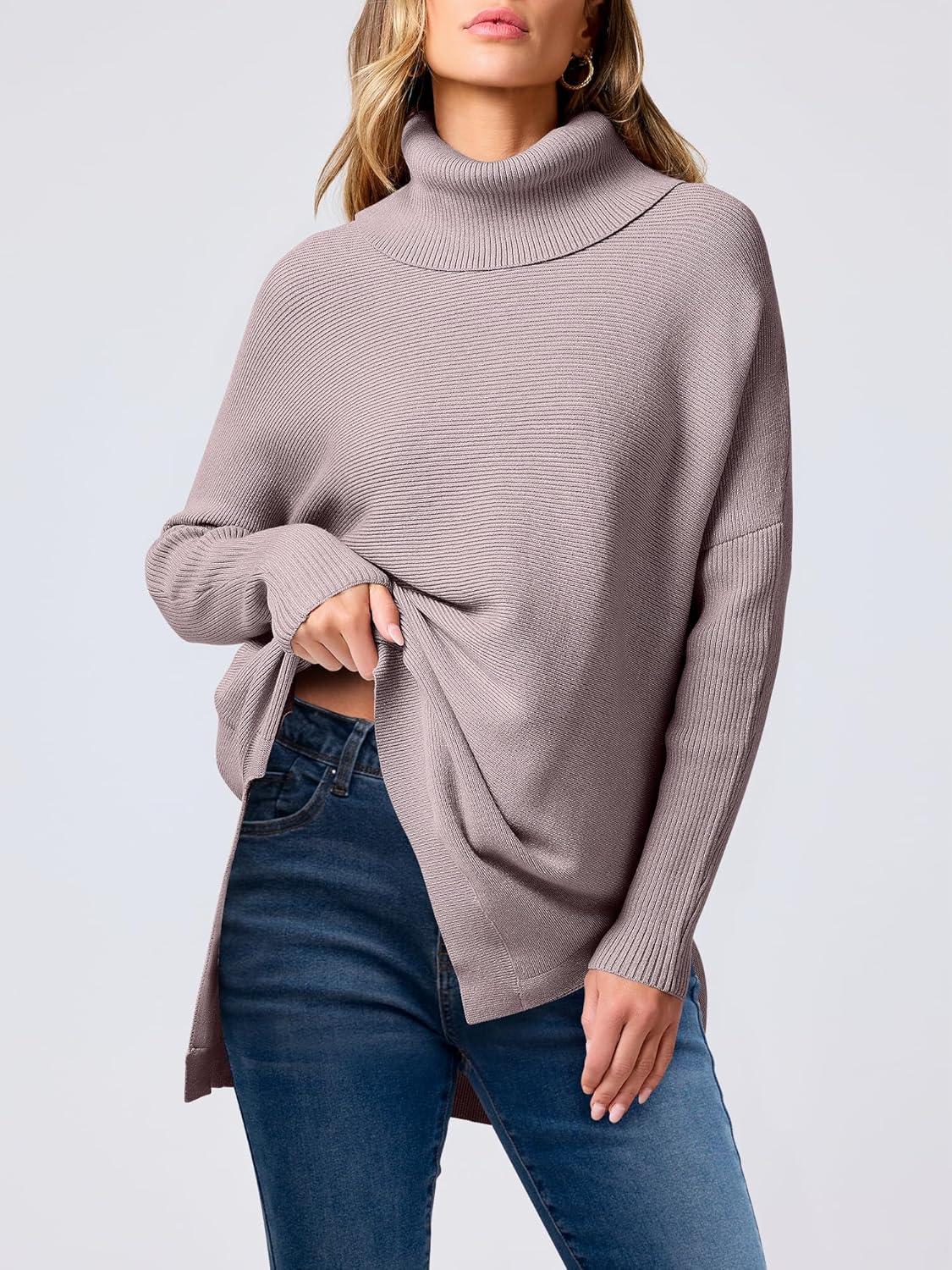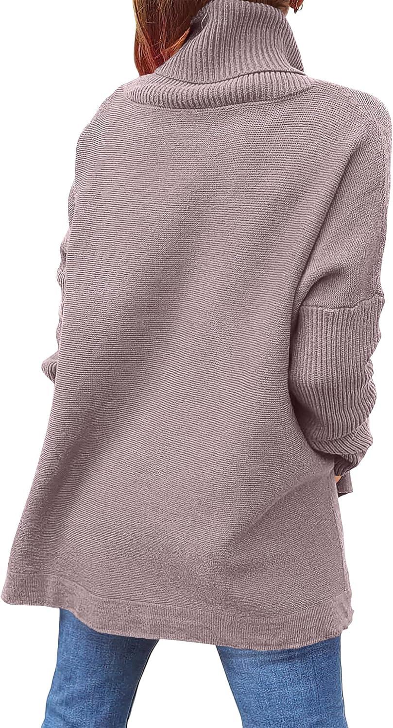 imageANRABESS Womens Oversized Turtleneck Batwing Sleeve Spilt Casual Loose Knit Tunic Pullover Sweater Tops 2025 Fall OutfitsAlmond
