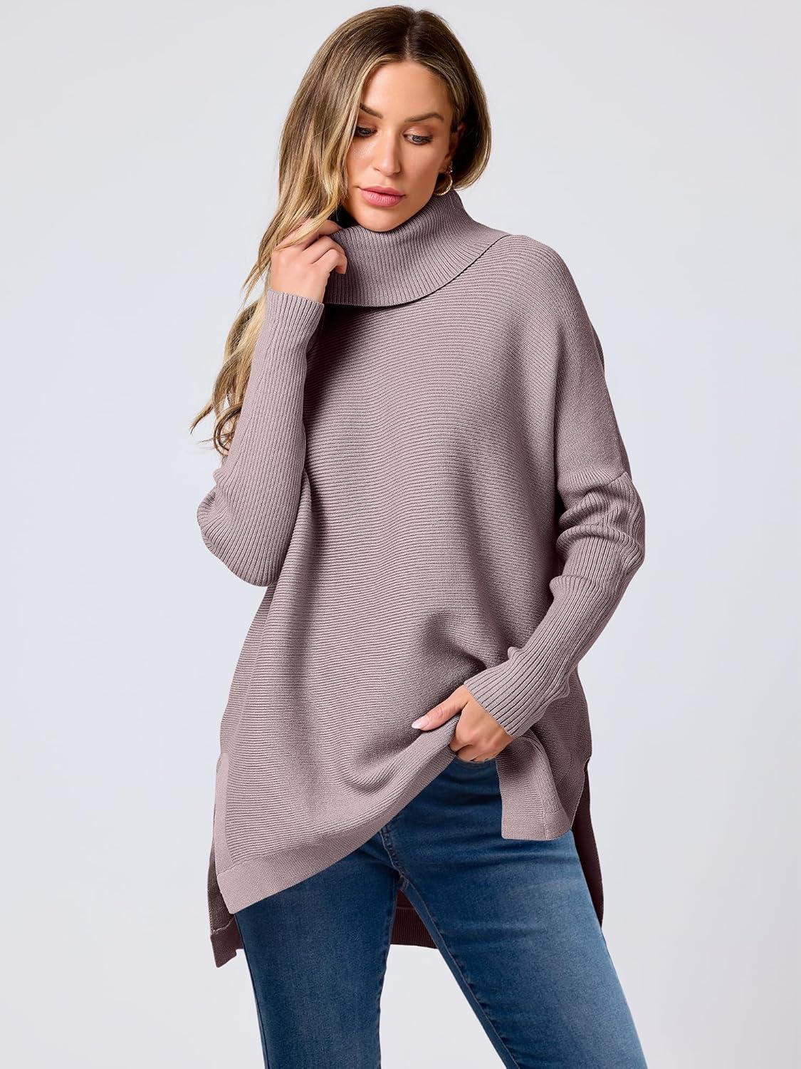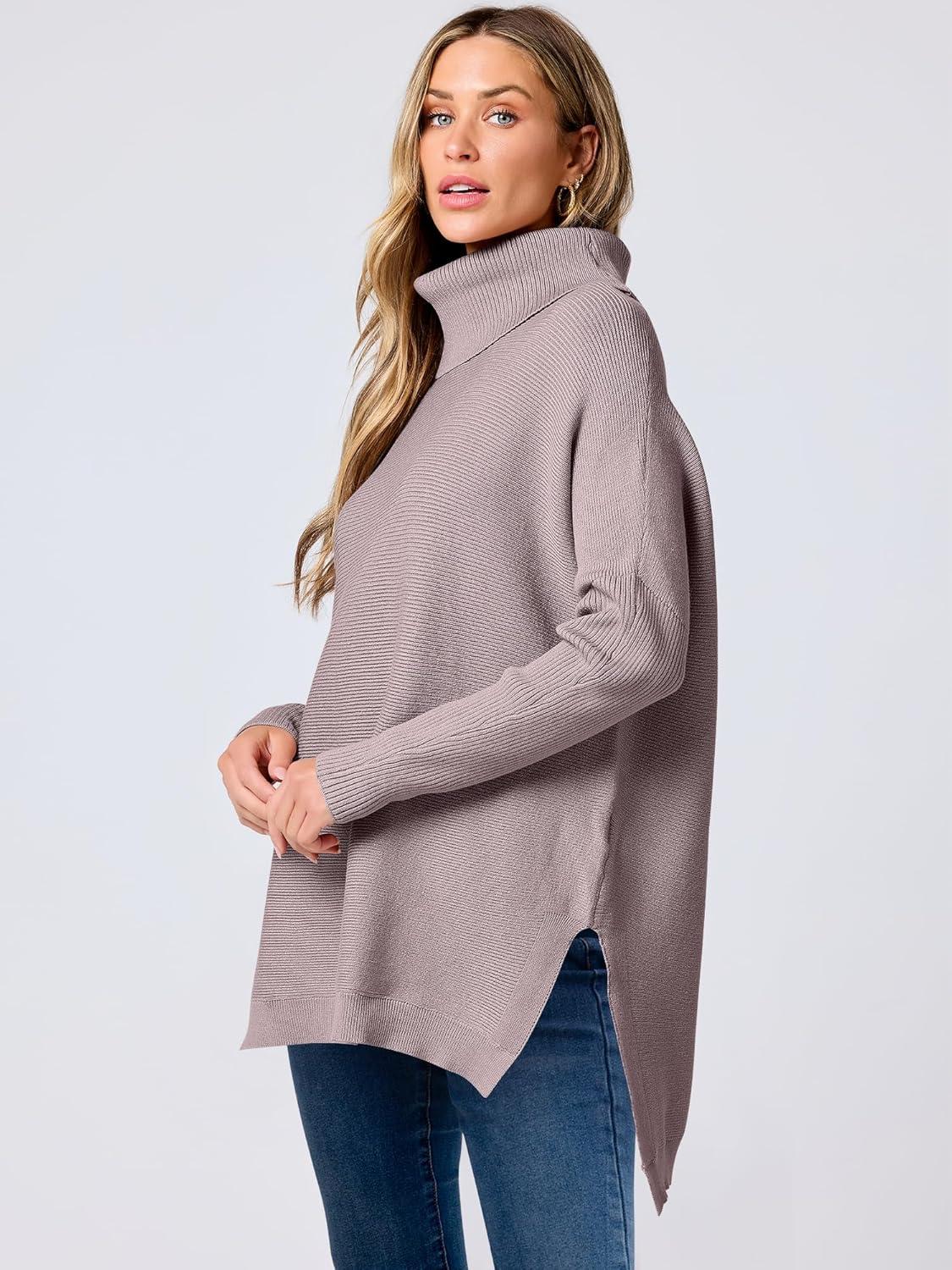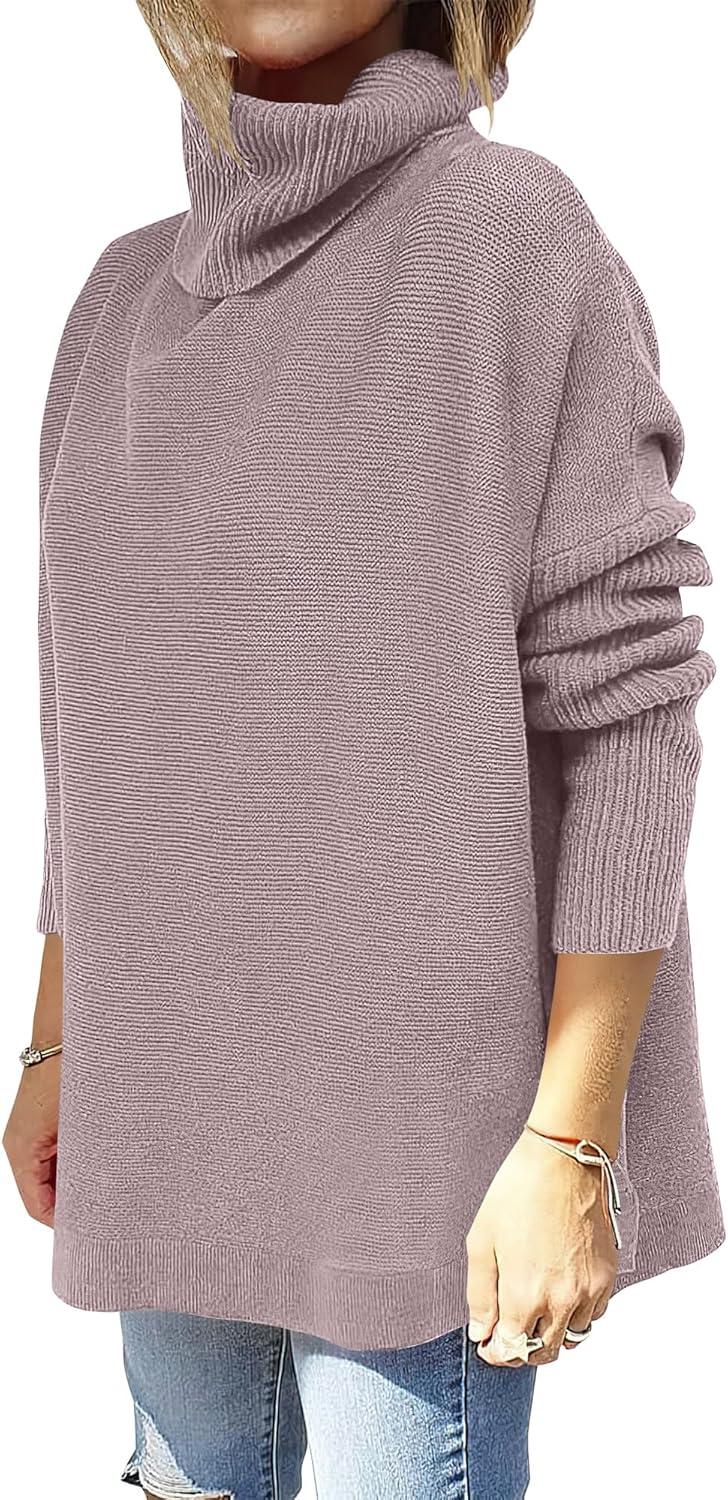 imageANRABESS Womens Oversized Turtleneck Batwing Sleeve Spilt Casual Loose Knit Tunic Pullover Sweater Tops 2025 Fall OutfitsAlmond