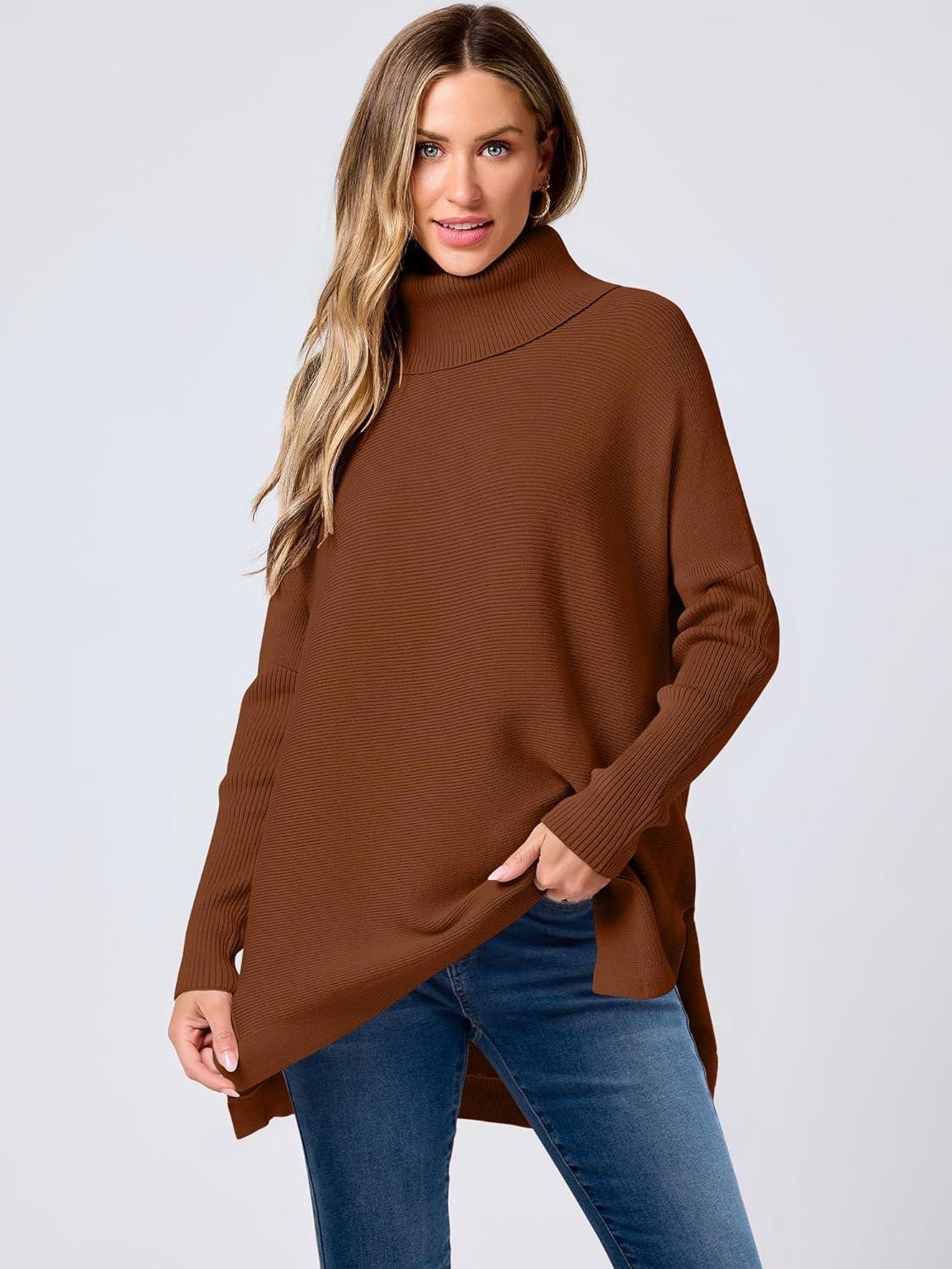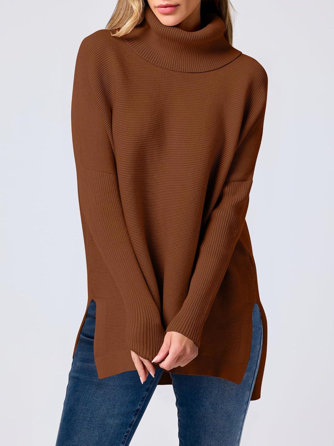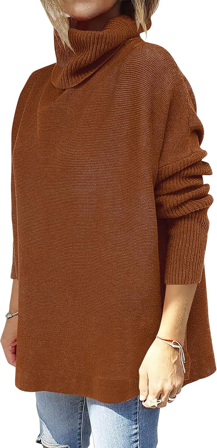 ANRABESS Women’s Oversized Turtleneck Batwing Sleeve Spilt Casual Loose Knit Tunic Pullover Sweater Tops 2025 Fall Outfits(Auburn)