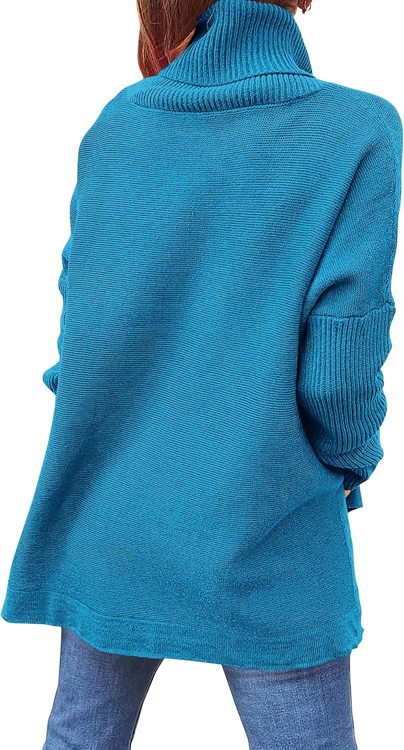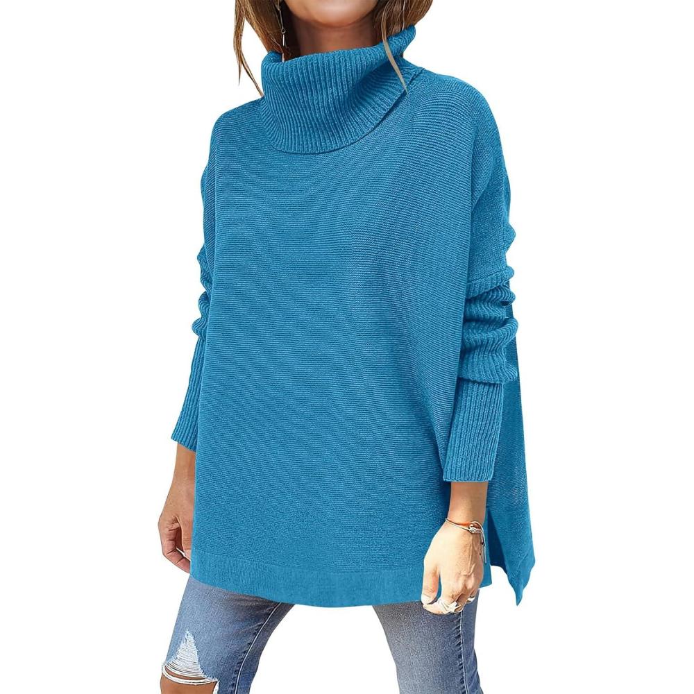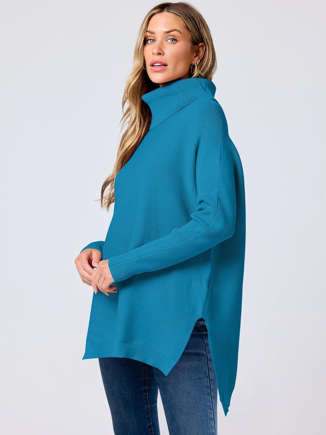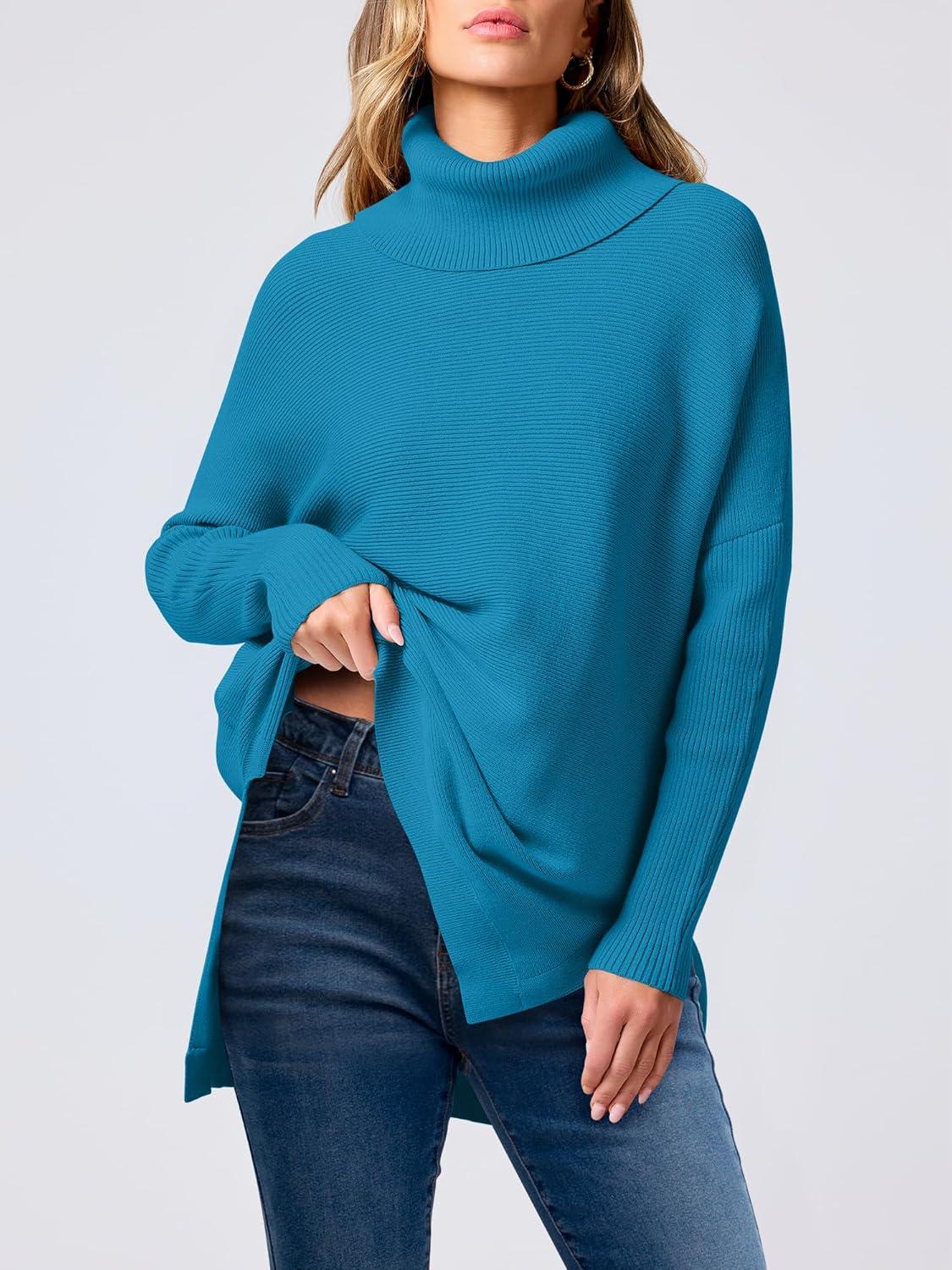 ANRABESS Women's Oversized Turtleneck Batwing Sleeve Spilt Casual Loose Knit Tunic Pullover Sweater Tops 2025 Fall Outfits(Lake)