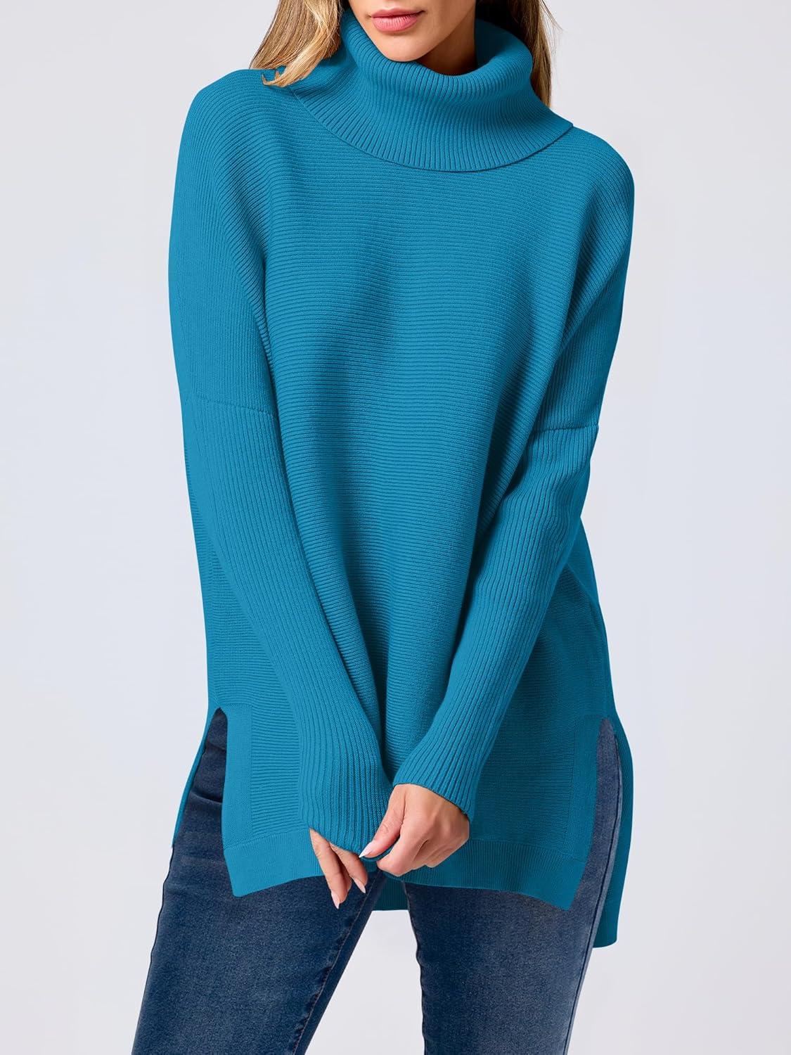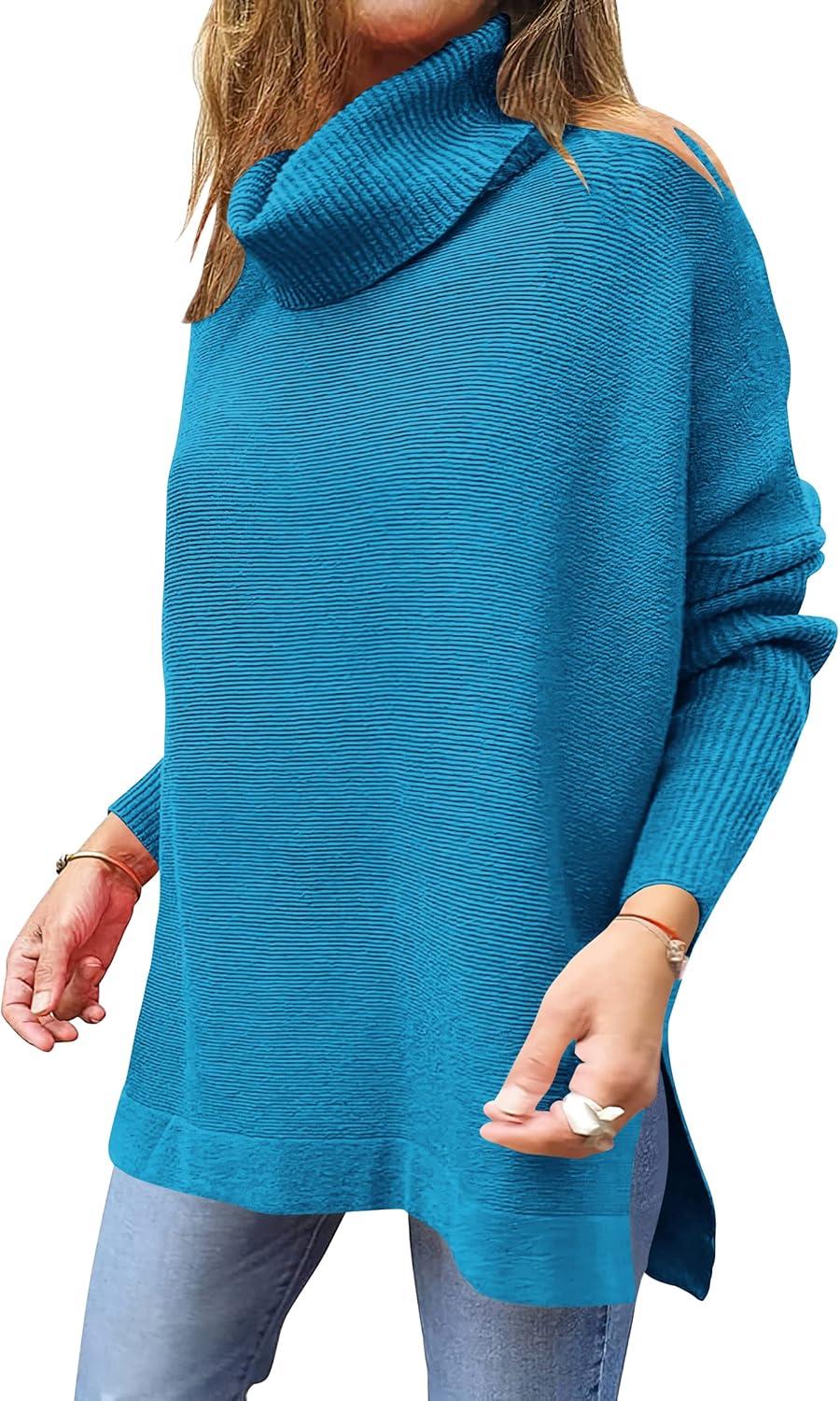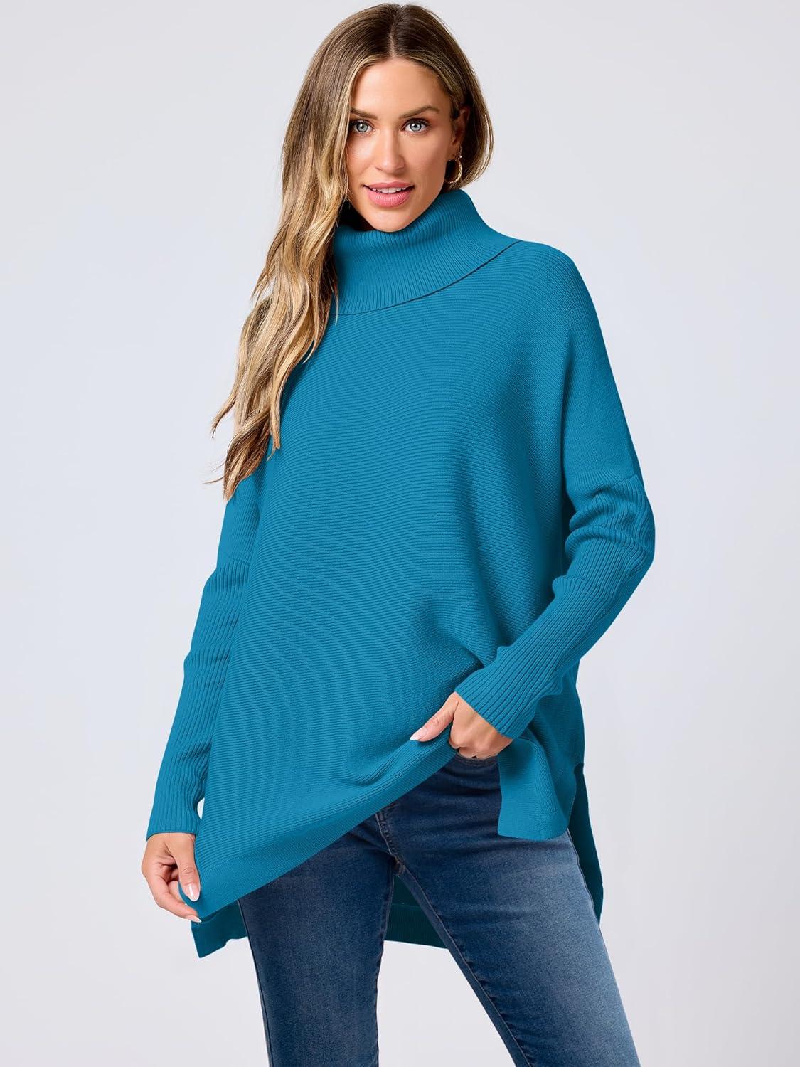 ANRABESS Women's Oversized Turtleneck Batwing Sleeve Spilt Casual Loose Knit Tunic Pullover Sweater Tops 2025 Fall Outfits(Lake)