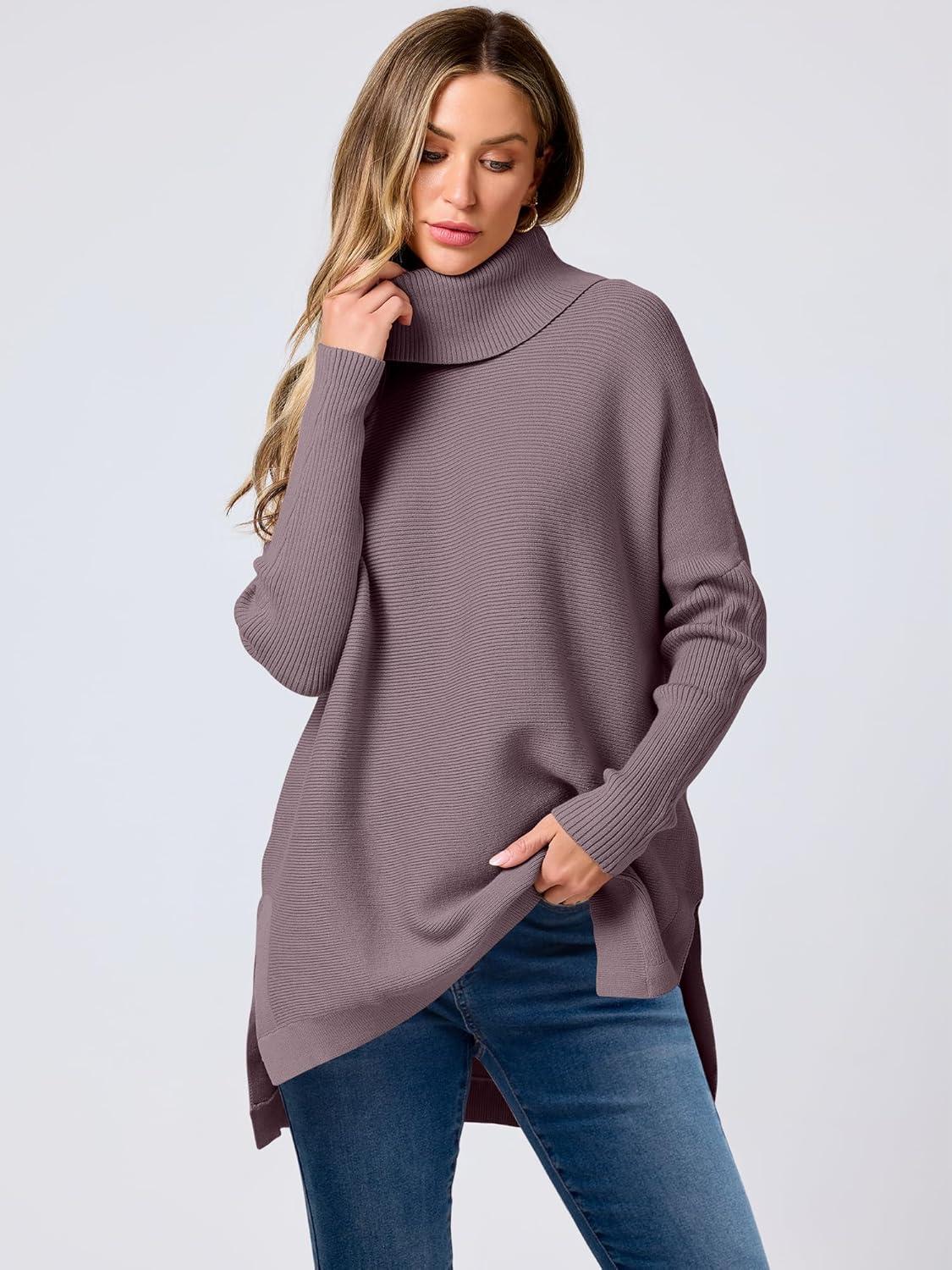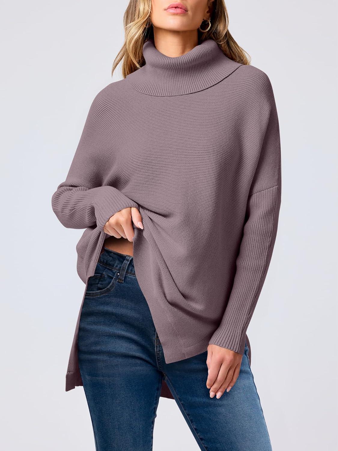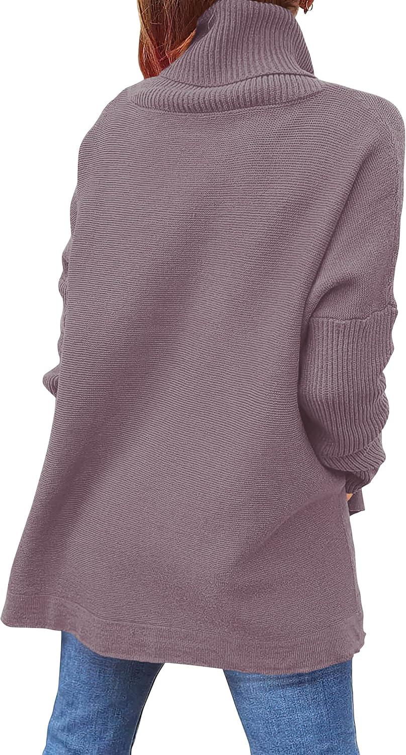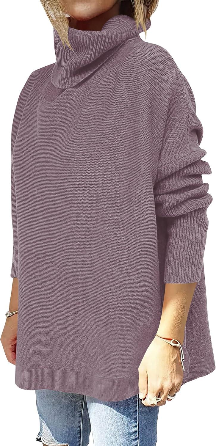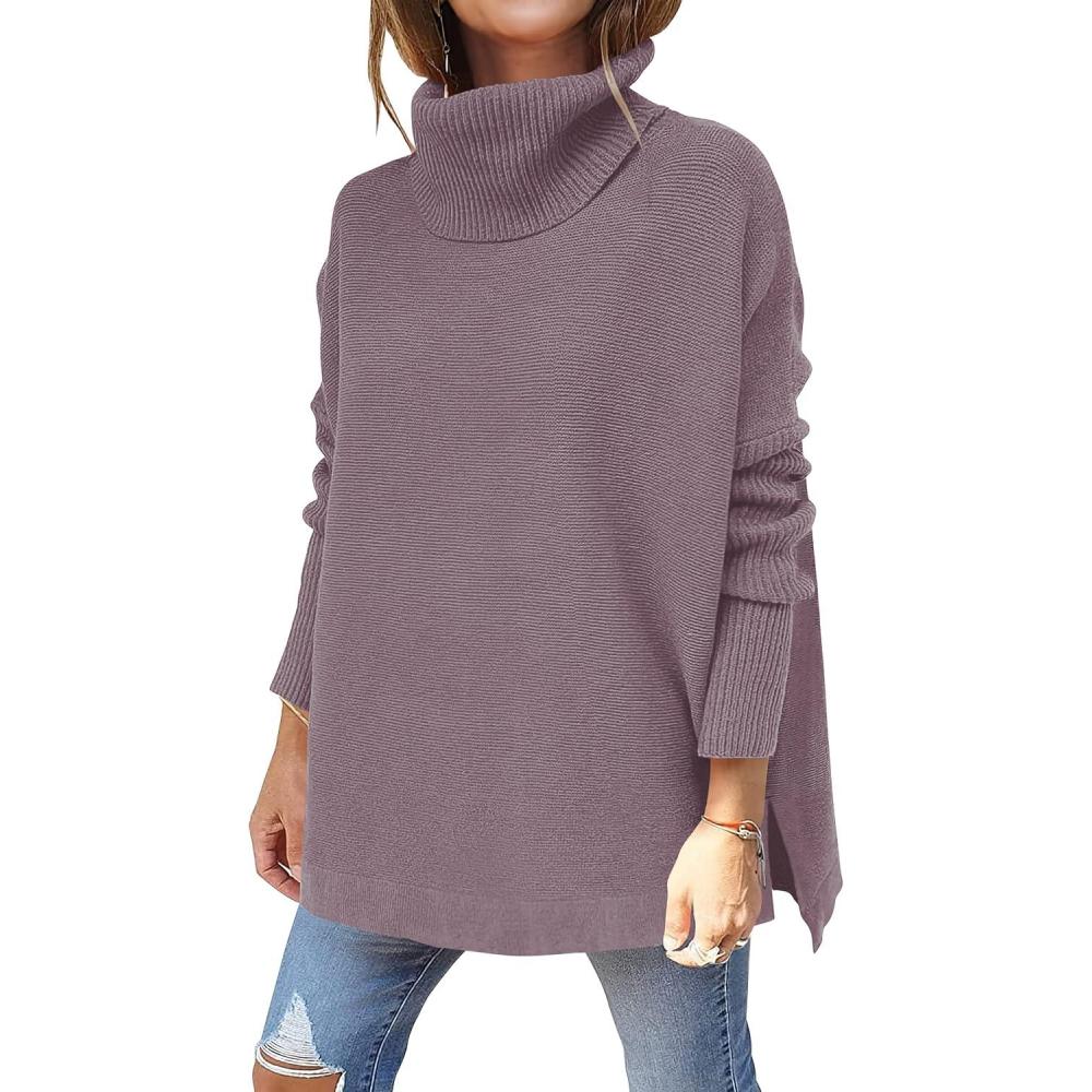 imageANRABESS Womens Oversized Turtleneck Batwing Sleeve Spilt Casual Loose Knit Tunic Pullover Sweater Tops 2025 Fall OutfitsPurple