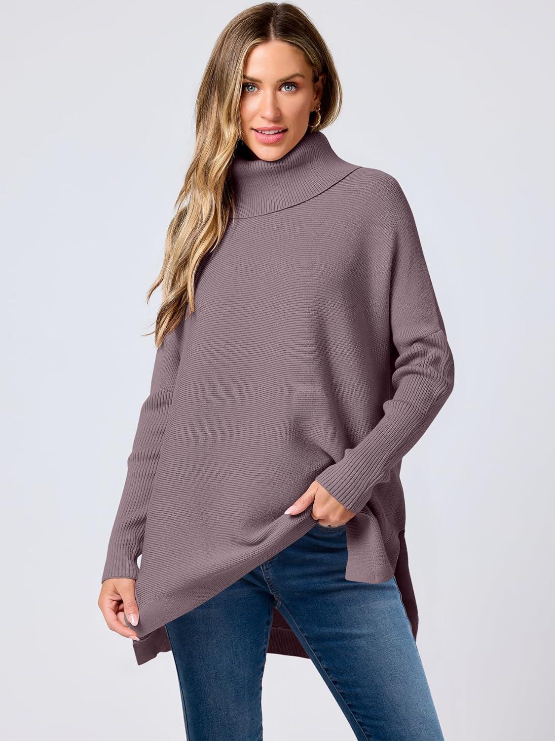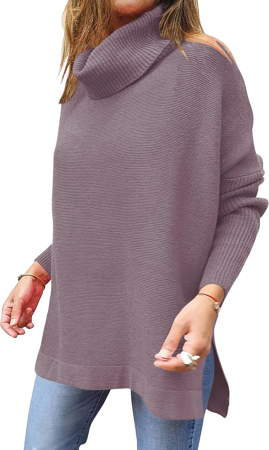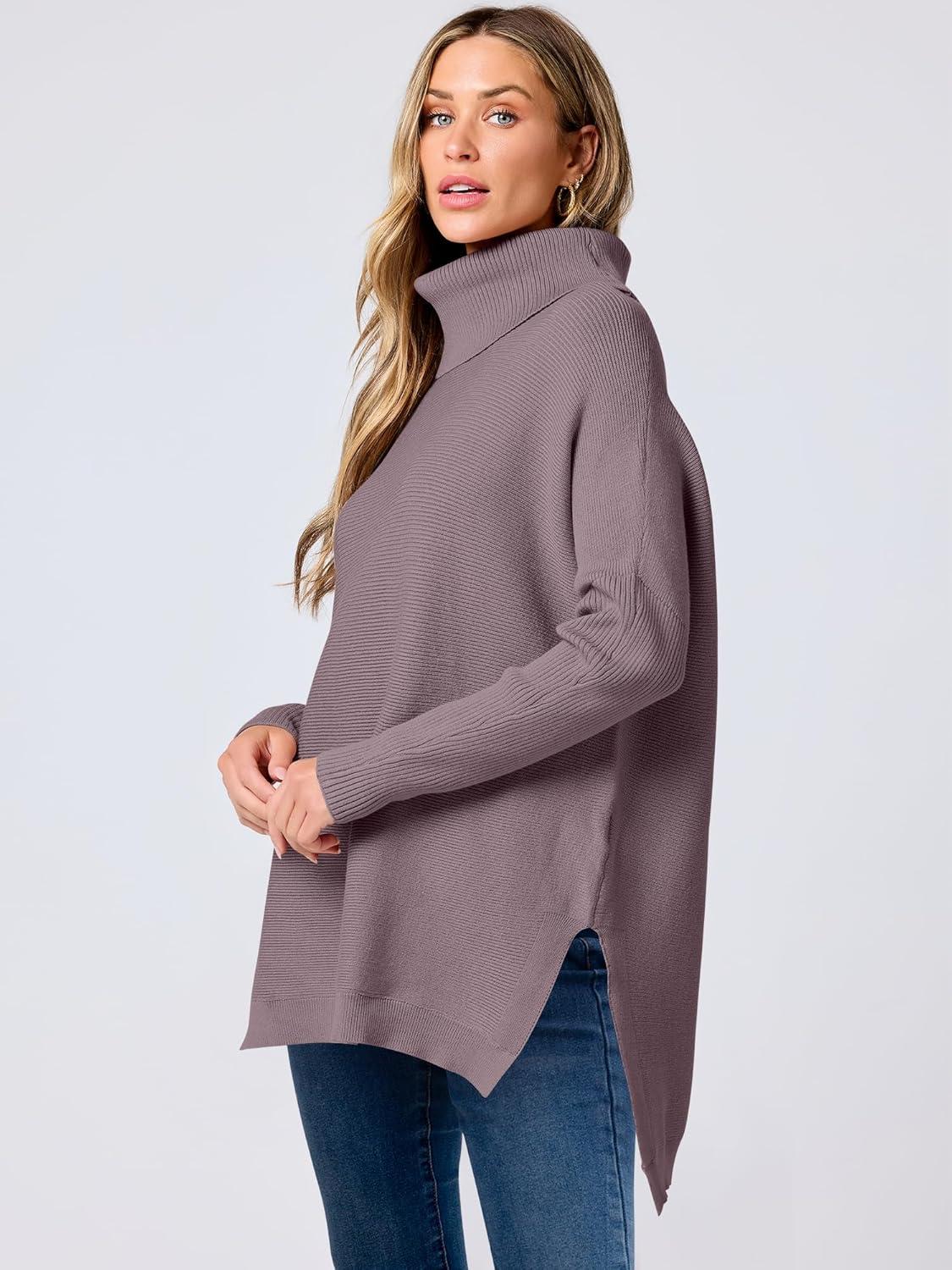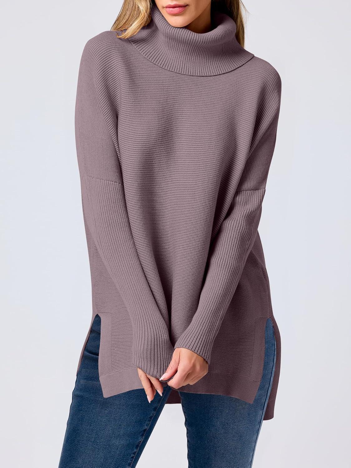 imageANRABESS Womens Oversized Turtleneck Batwing Sleeve Spilt Casual Loose Knit Tunic Pullover Sweater Tops 2025 Fall OutfitsPurple