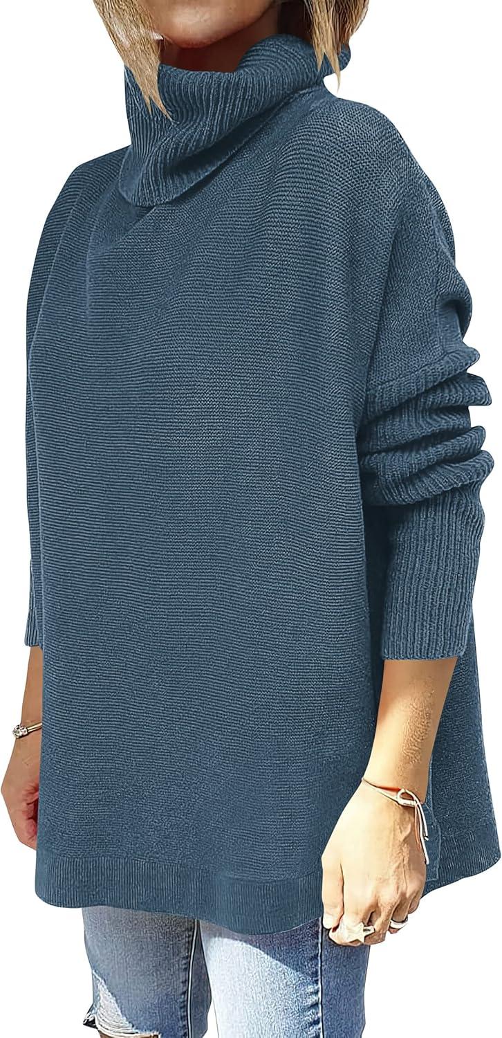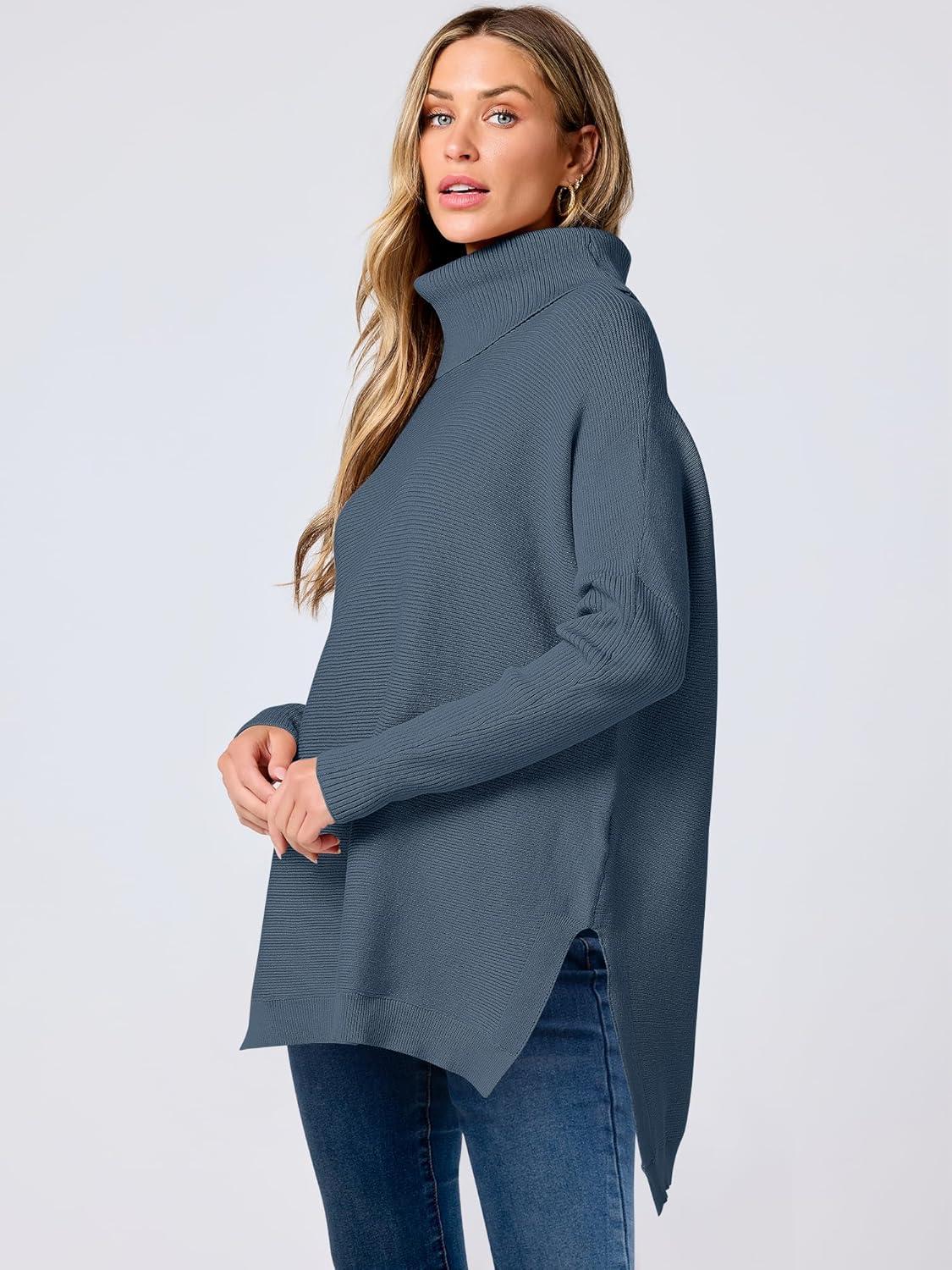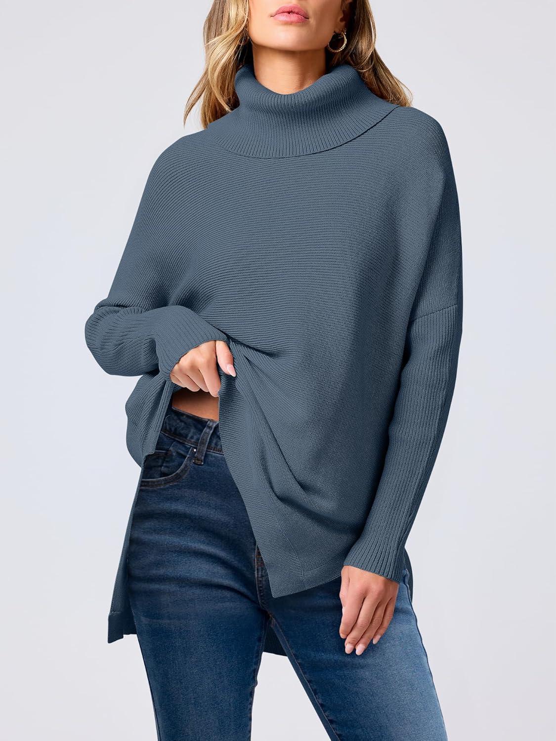 ANRABESS Women’s Oversized Turtleneck Batwing Sleeve Spilt Casual Loose Knit Tunic Pullover Sweater Tops 2025 Fall Outfits(Sky)