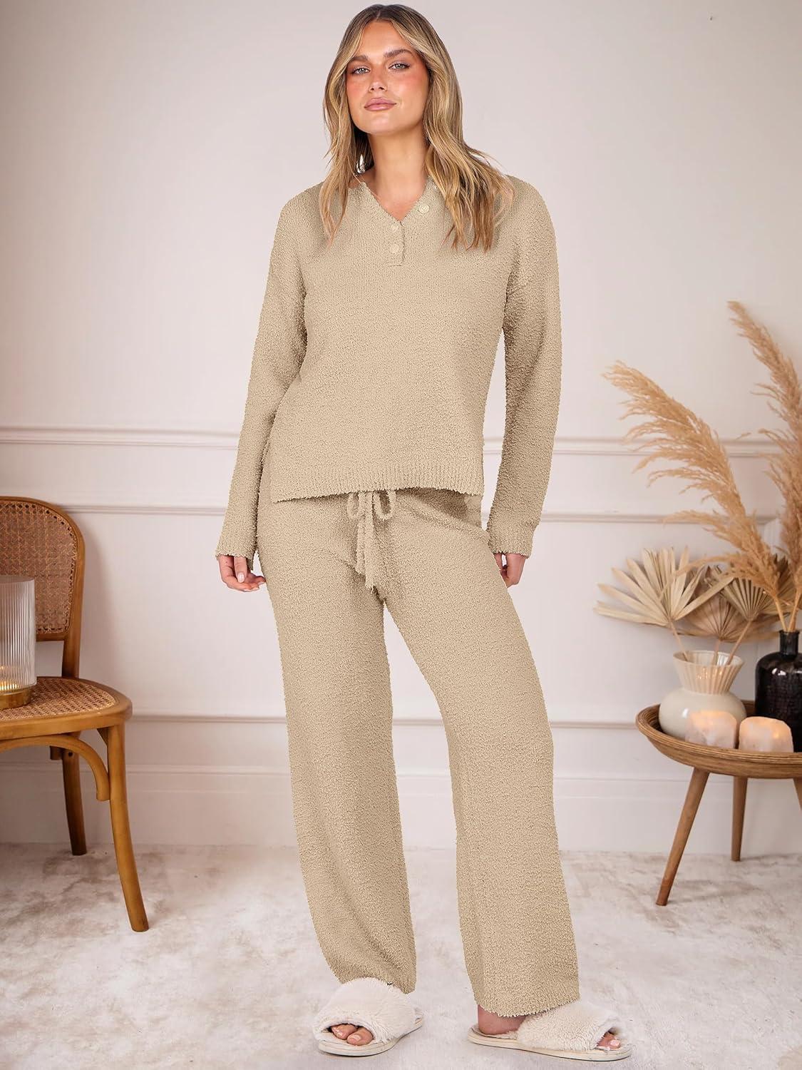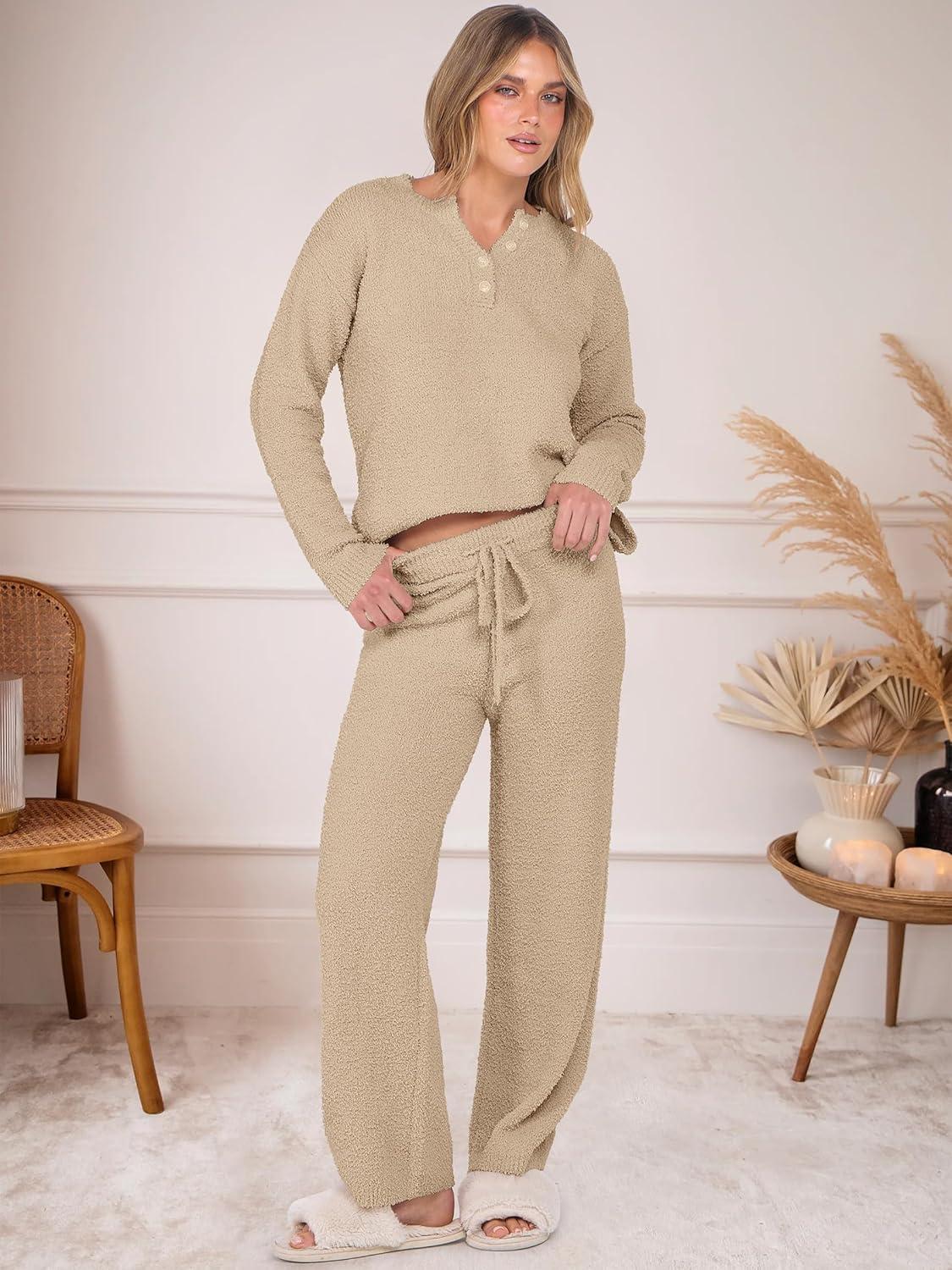 imageANRABESS Womens Pajama Fuzzy Fleece 2 Piece Long Sleeve Top Wide Leg Pants Lounge Matching Pj Sets 2025 Fall Winter OutfitsLight Khaki