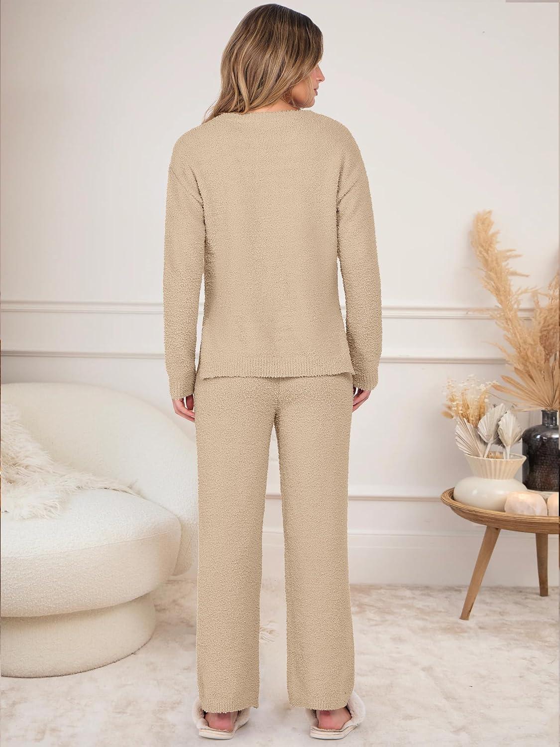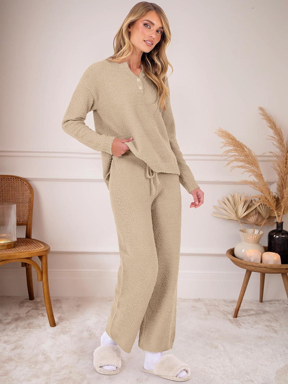 ANRABESS Womens Pajama Fuzzy Fleece 2 Piece Long Sleeve Top Wide Leg Pants Lounge Matching Pj Sets 2025 Fall Winter Outfits(Light Khaki)
