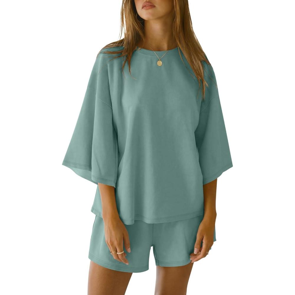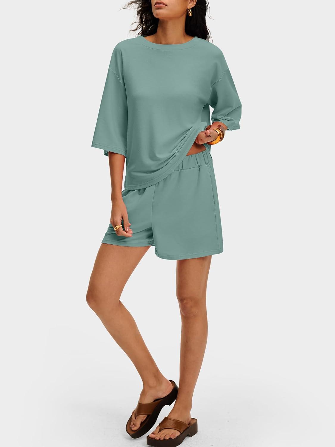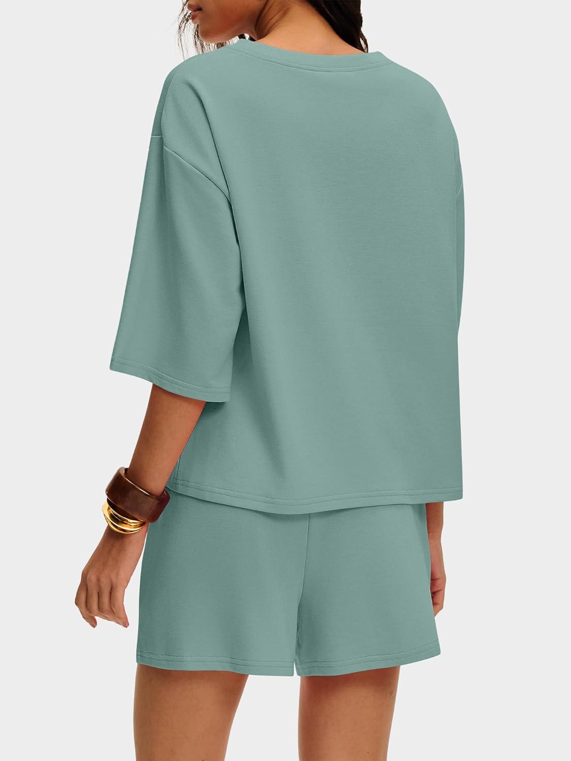 ANRABESS Womens Pajama Sets 3/4 Sleeve Oversized Tops and Elastic Waist Shorts Lounge Sets Loungewear(Sage Green)