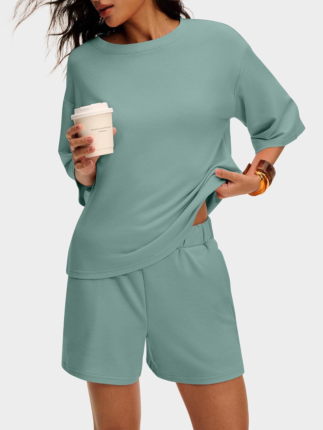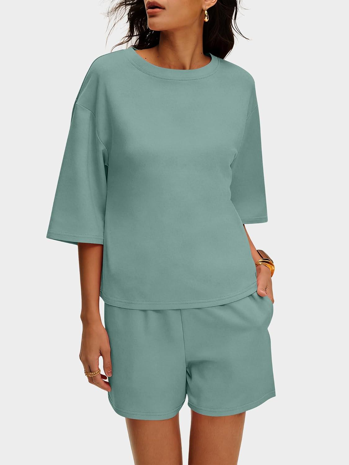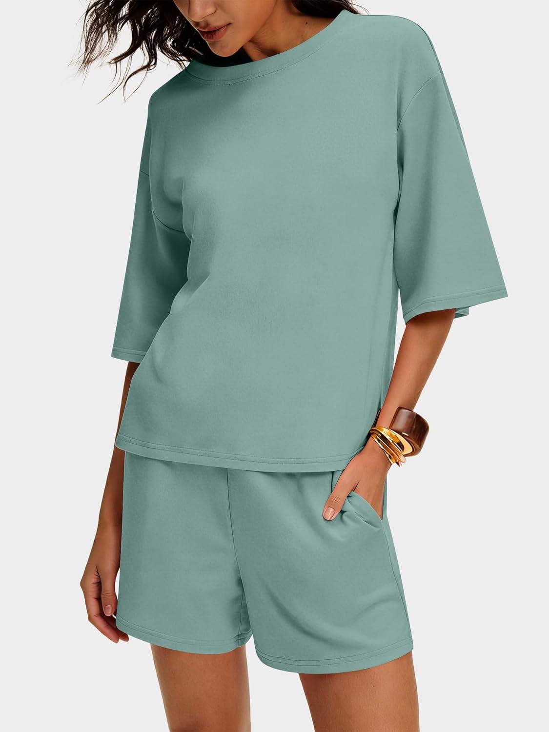 ANRABESS Womens Pajama Sets 3/4 Sleeve Oversized Tops and Elastic Waist Shorts Lounge Sets Loungewear(Sage Green)