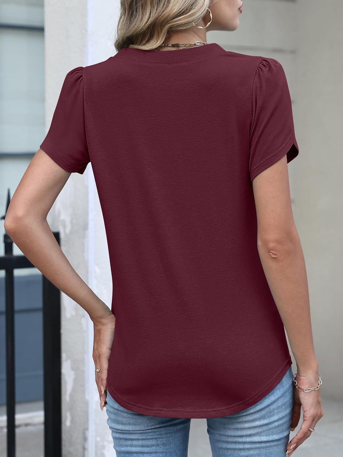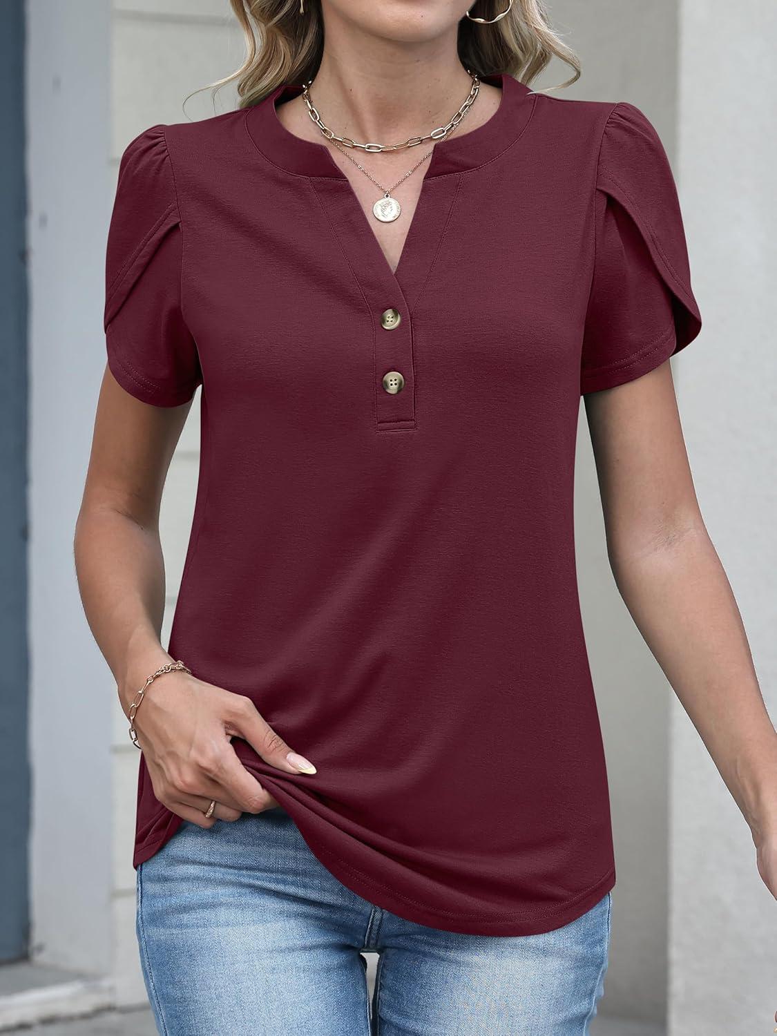 ANRABESS Womens Petal Short Sleeve Henley Shirts Summer 2026 V Neck Dressy Casual Blouses Spring Business Work Tunic Tops(Burgundy)