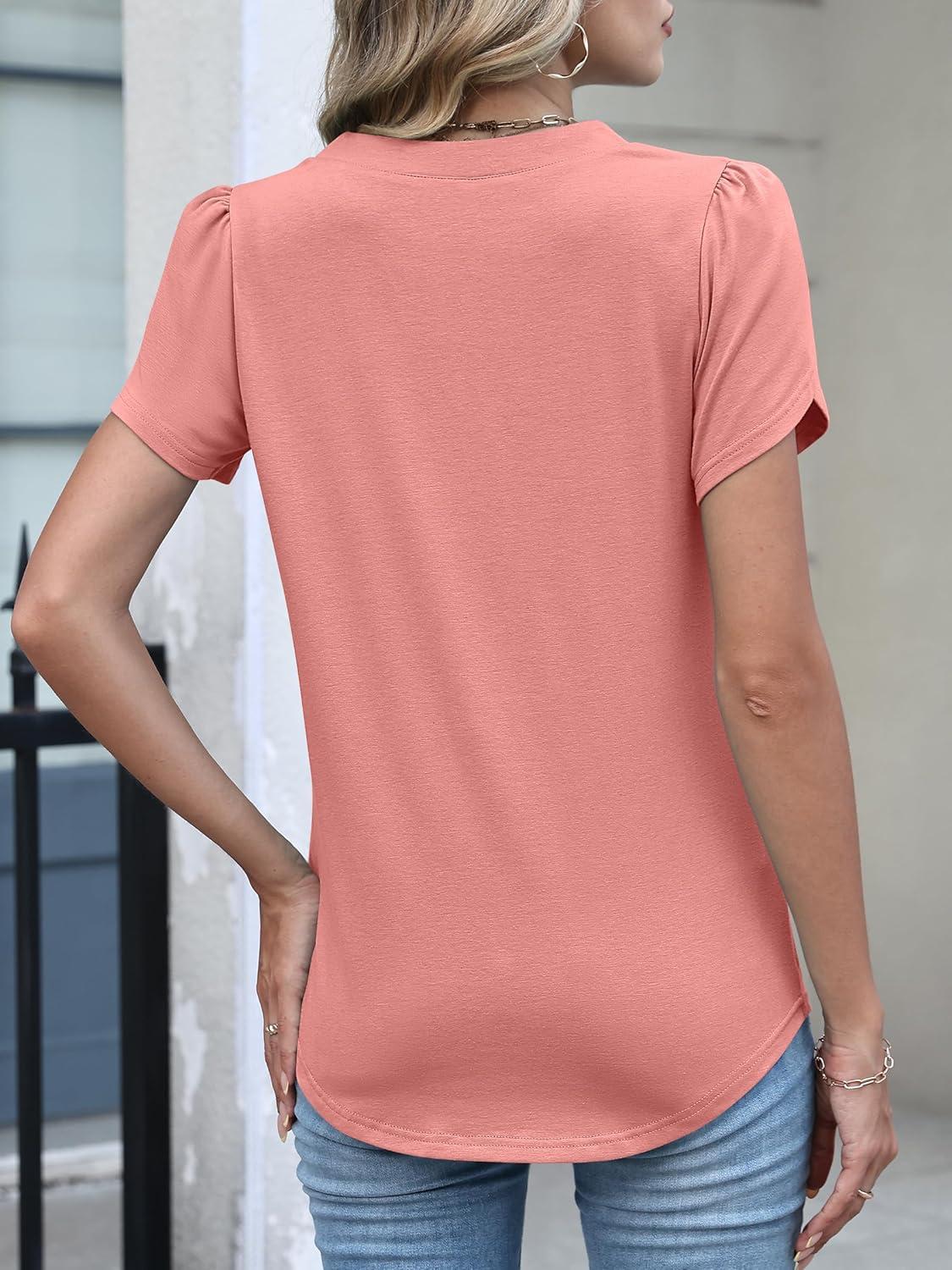 ANRABESS Womens Petal Short Sleeve Henley Shirts Summer 2026 V Neck Dressy Casual Blouses Spring Business Work Tunic Tops(Coral)