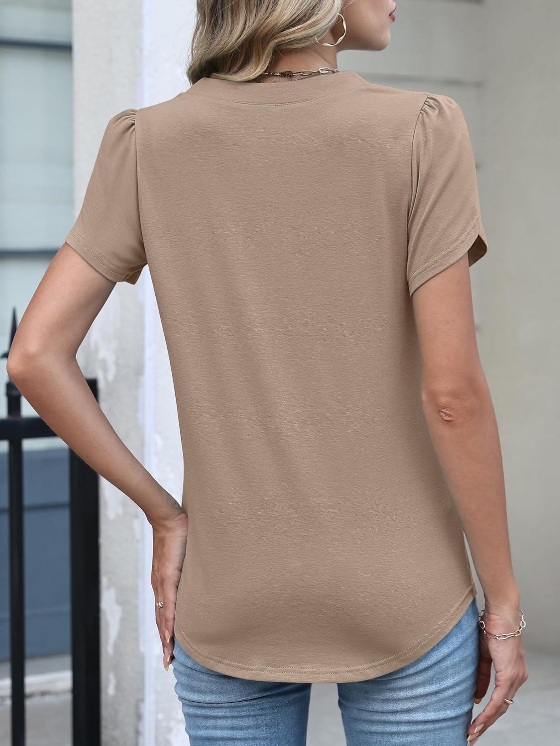ANRABESS Womens Petal Short Sleeve Henley Shirts Summer 2026 V Neck Dressy Casual Blouses Spring Business Work Tunic Tops(Khaki)