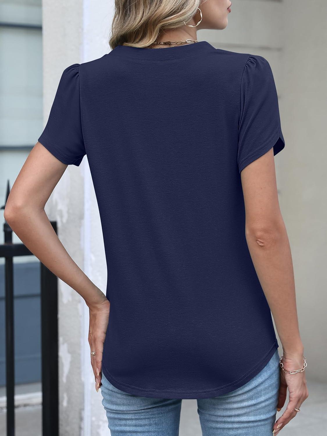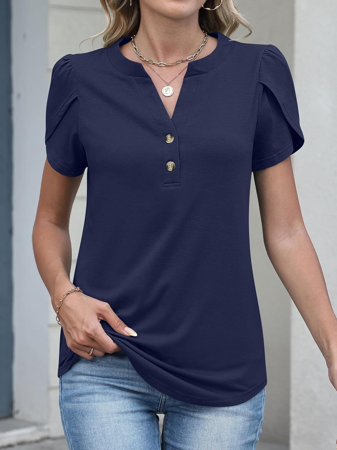 ANRABESS Womens Petal Short Sleeve Henley Shirts Summer 2026 V Neck Dressy Casual Blouses Spring Business Work Tunic Tops(Navy Blue)