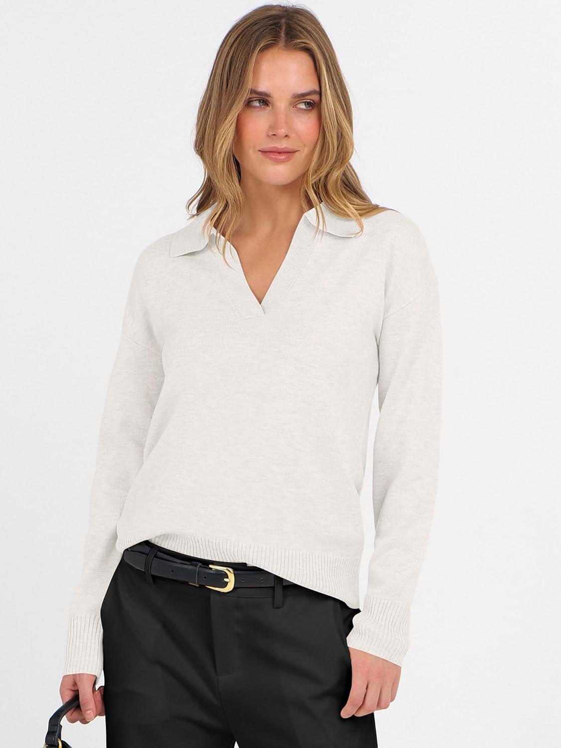 ANRABESS Womens Polo V Neck Long Sleeve Sweaters Lightweight Dressy Casual Business Basic Knit Pullover Top 2025 Fall Outfits(White)