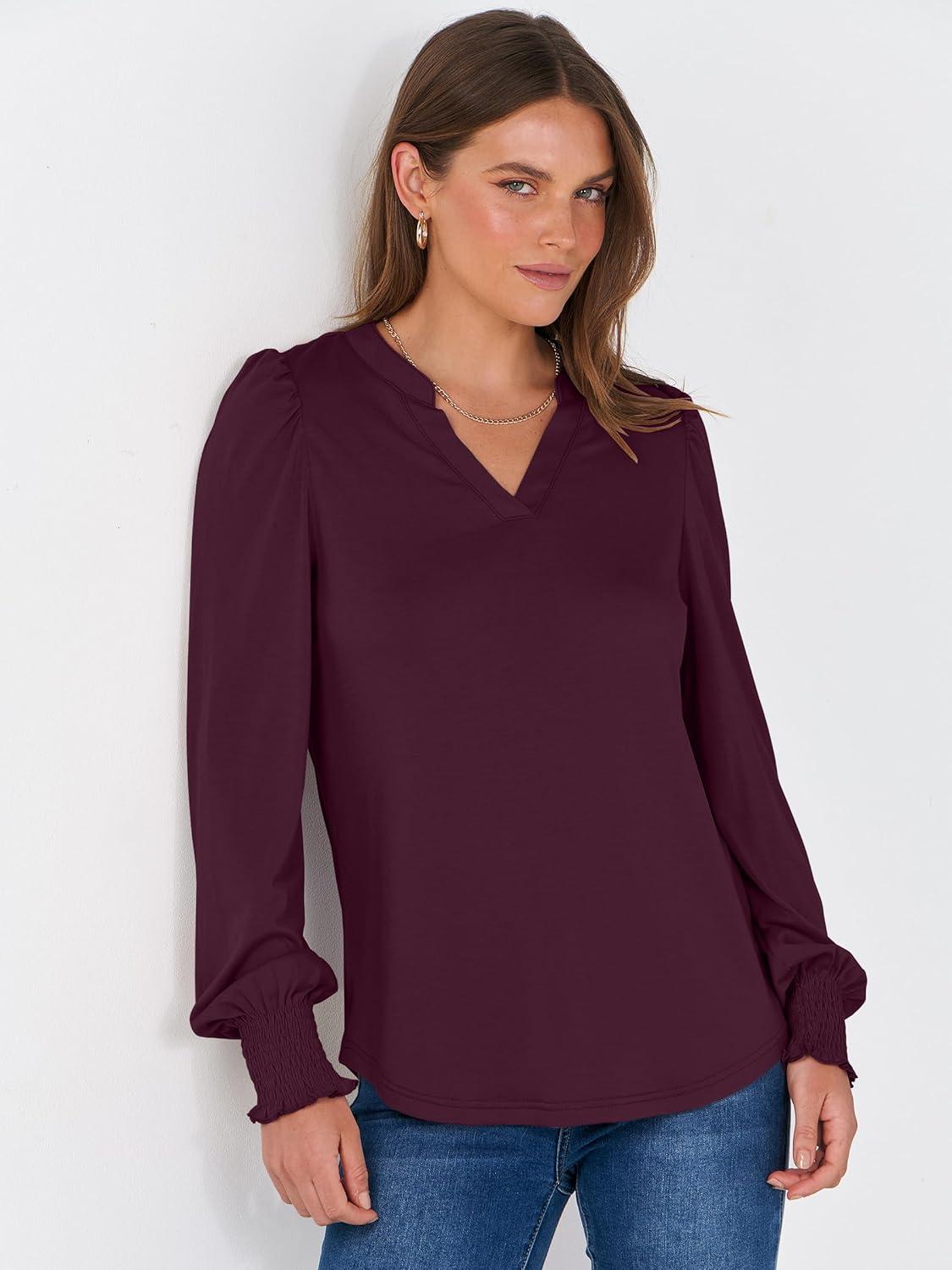 ANRABESS Women's Puff Long Sleeve Shirts V Neck Loose T-Shirts Dressy Casual Work Blouses 2025 Fall Tops Trendy Clothes(Burgundy)