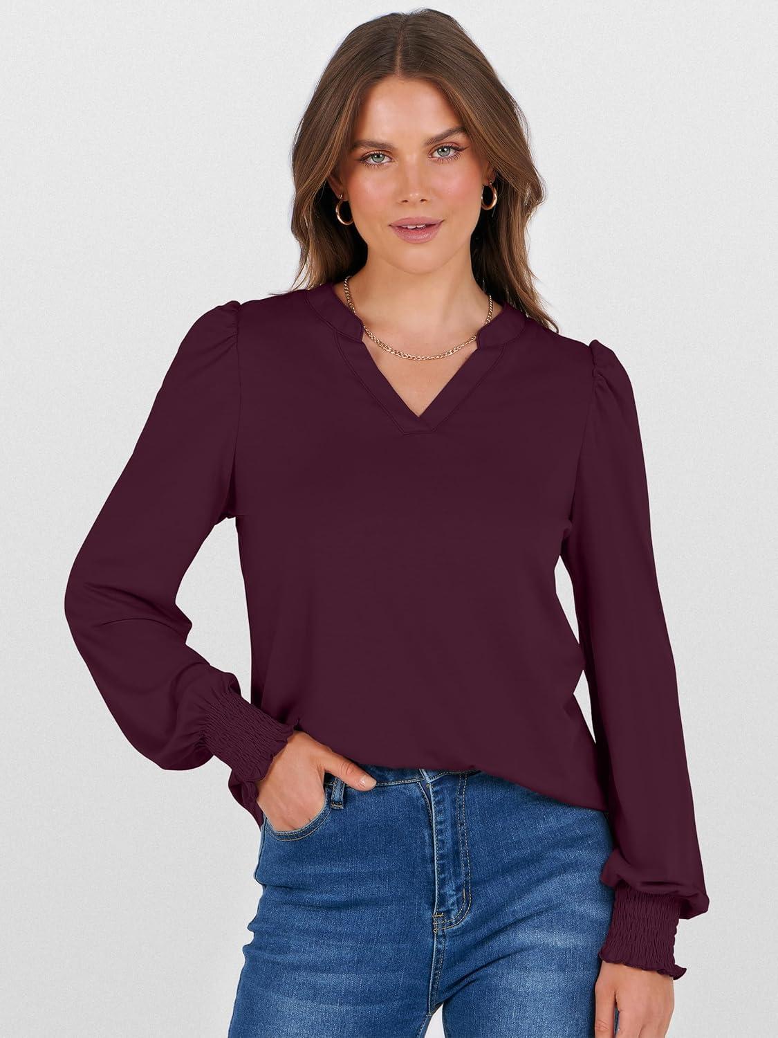 ANRABESS Women’s Puff Long Sleeve Shirts V Neck Loose T-Shirts Dressy Casual Work Blouses 2025 Fall Tops Trendy Clothes(Burgundy)