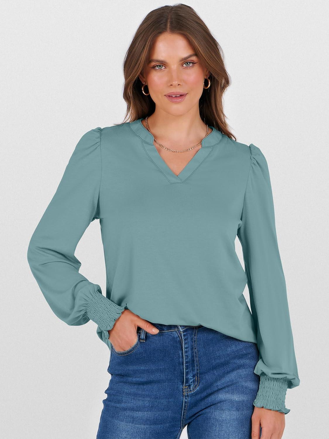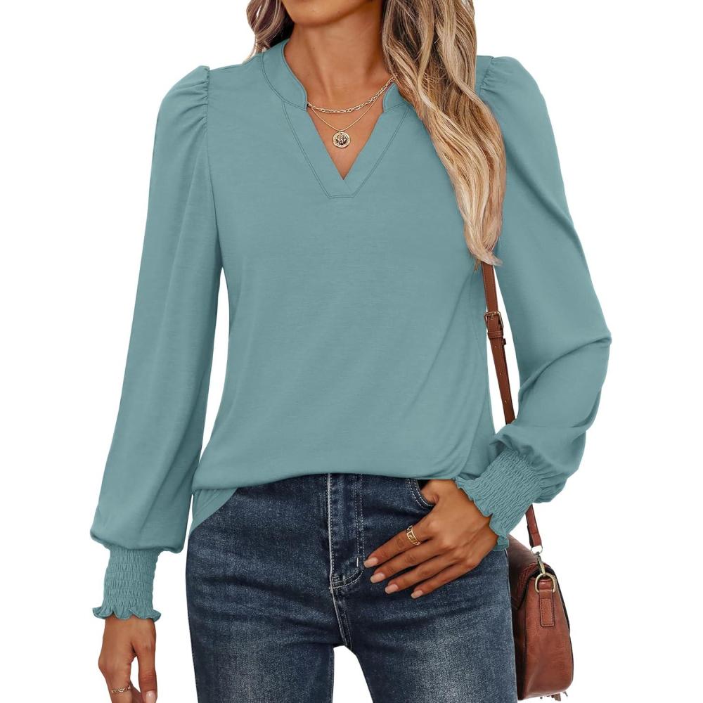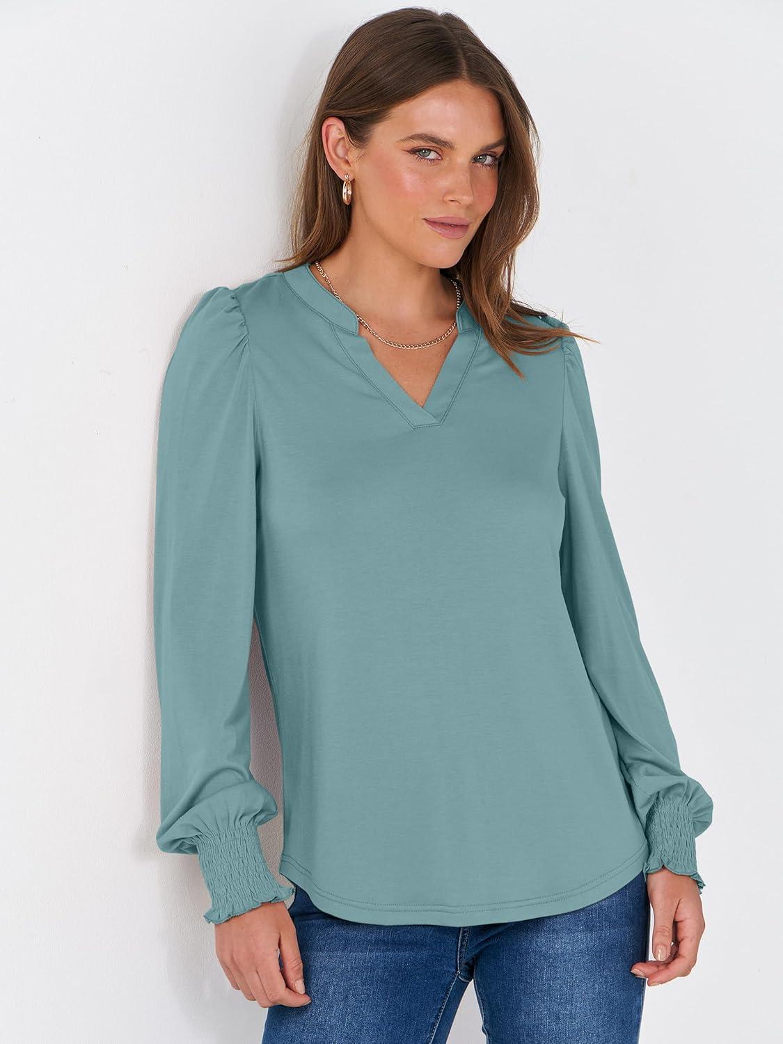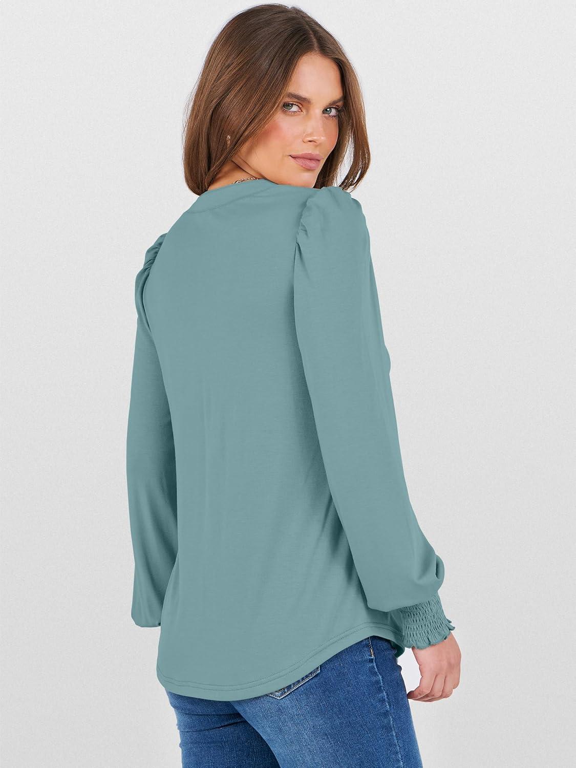 ANRABESS Women's Puff Long Sleeve Shirts V Neck Loose T-Shirts Dressy Casual Work Blouses 2025 Fall Tops Trendy Clothes(Cadet Blue)