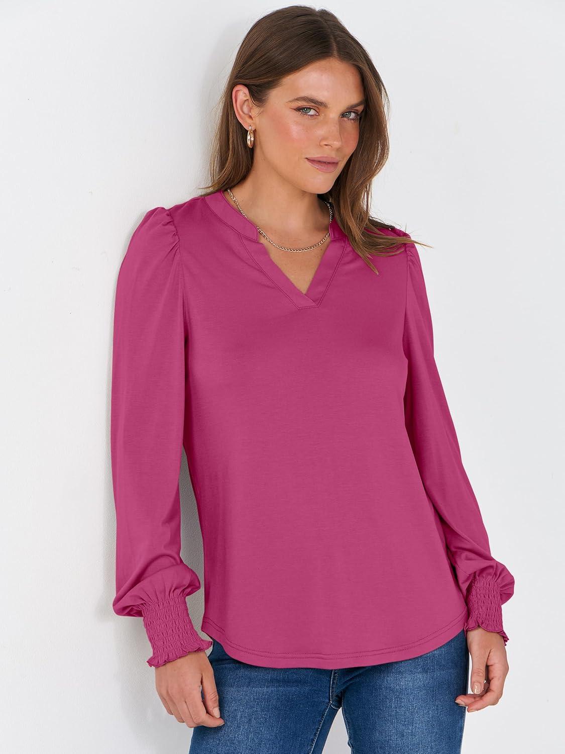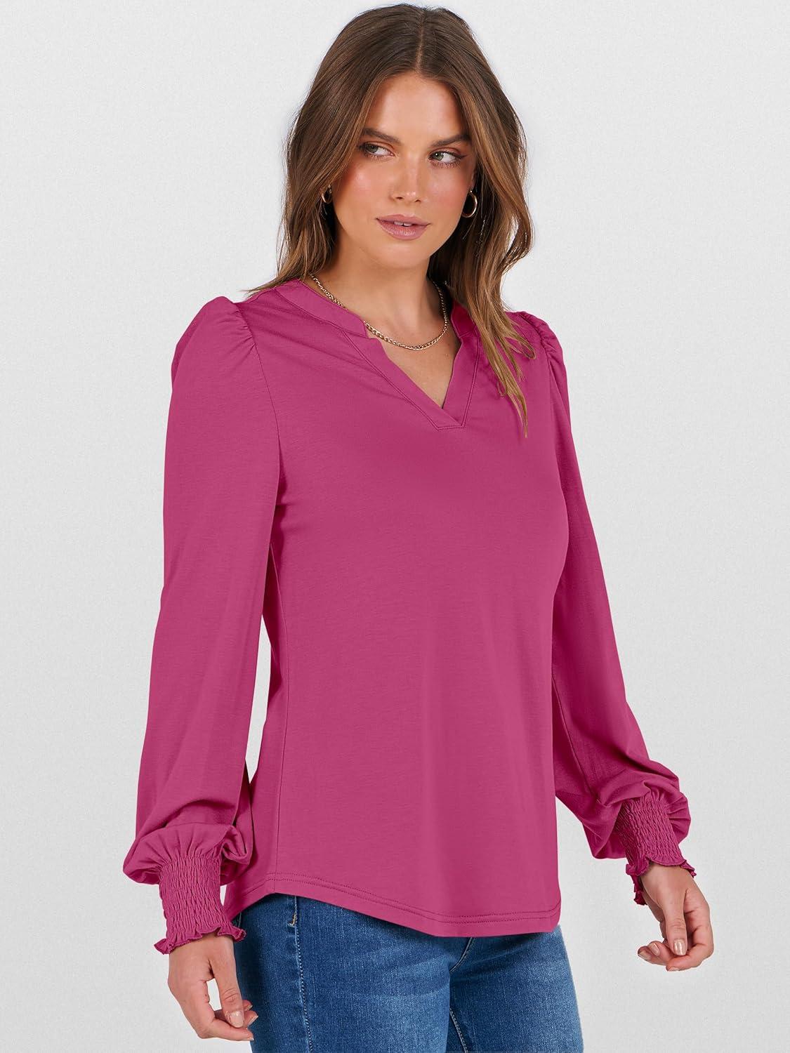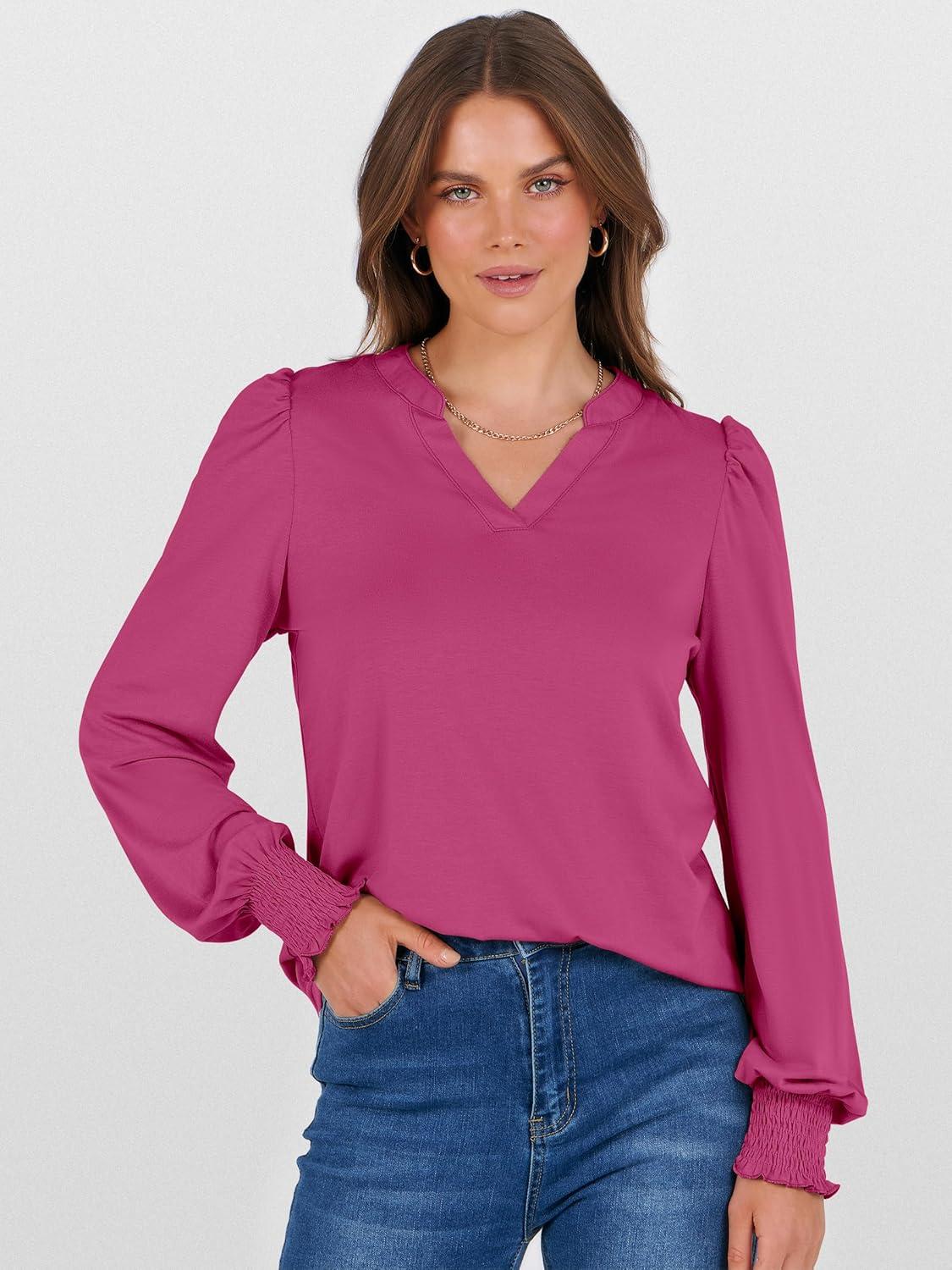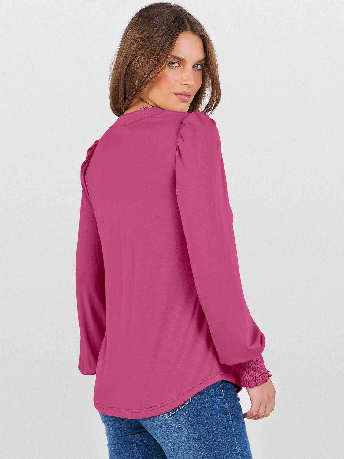ANRABESS Women's Puff Long Sleeve Shirts V Neck Loose T-Shirts Dressy Casual Work Blouses 2025 Fall Tops Trendy Clothes(Hot Pink)