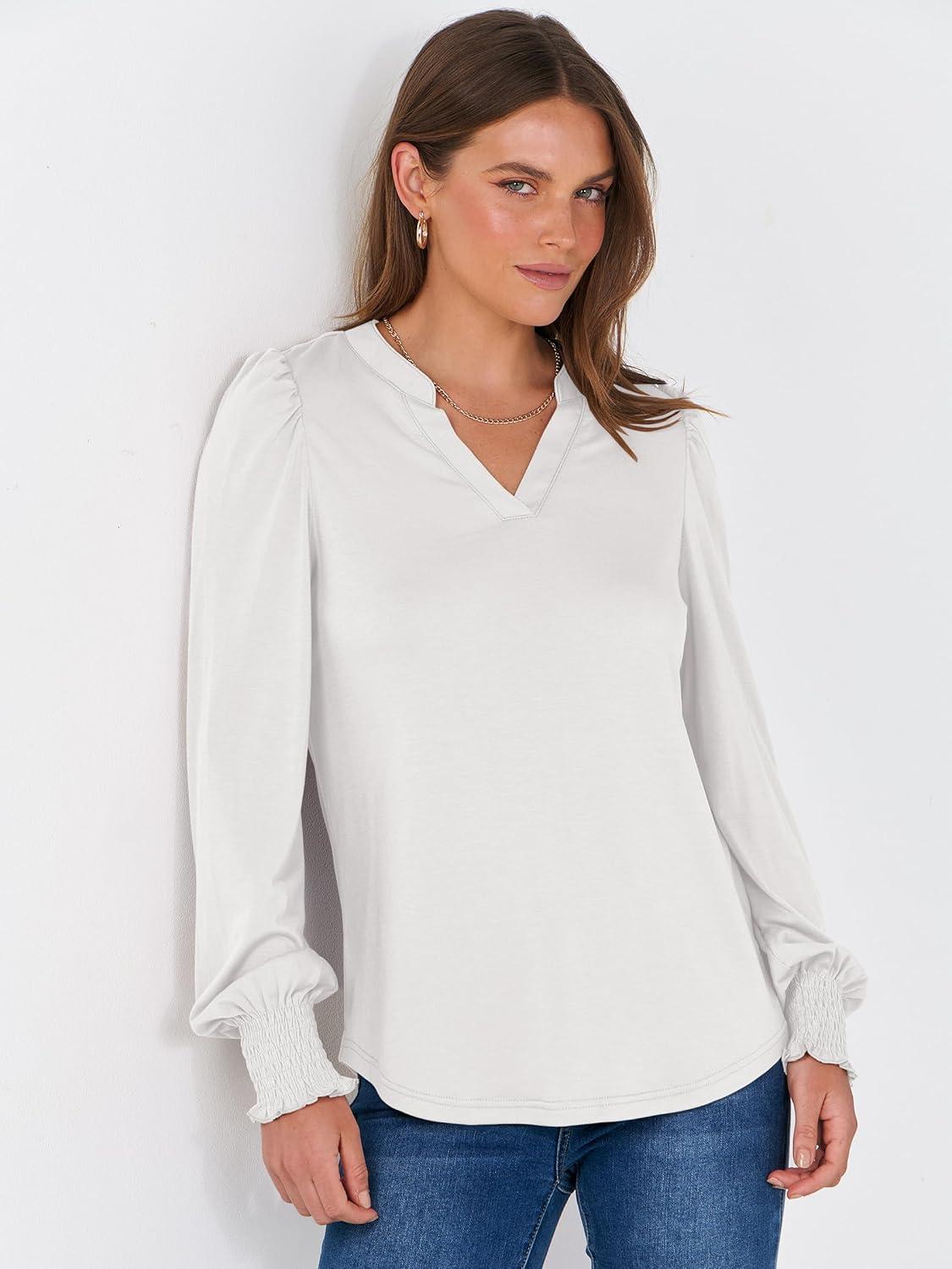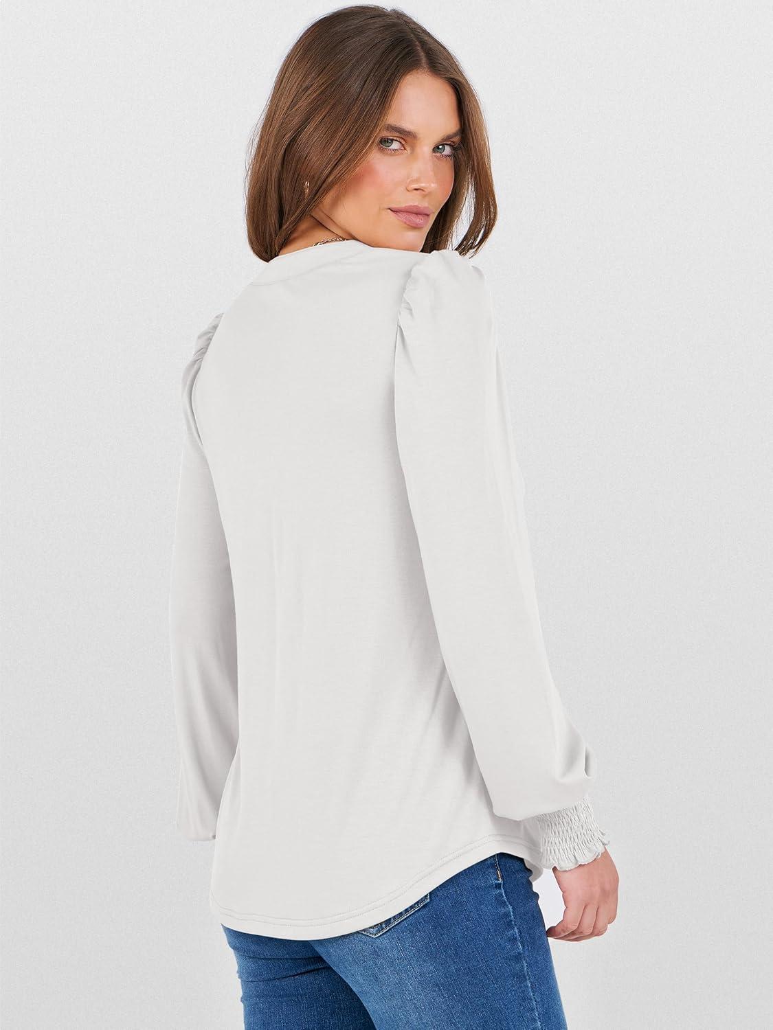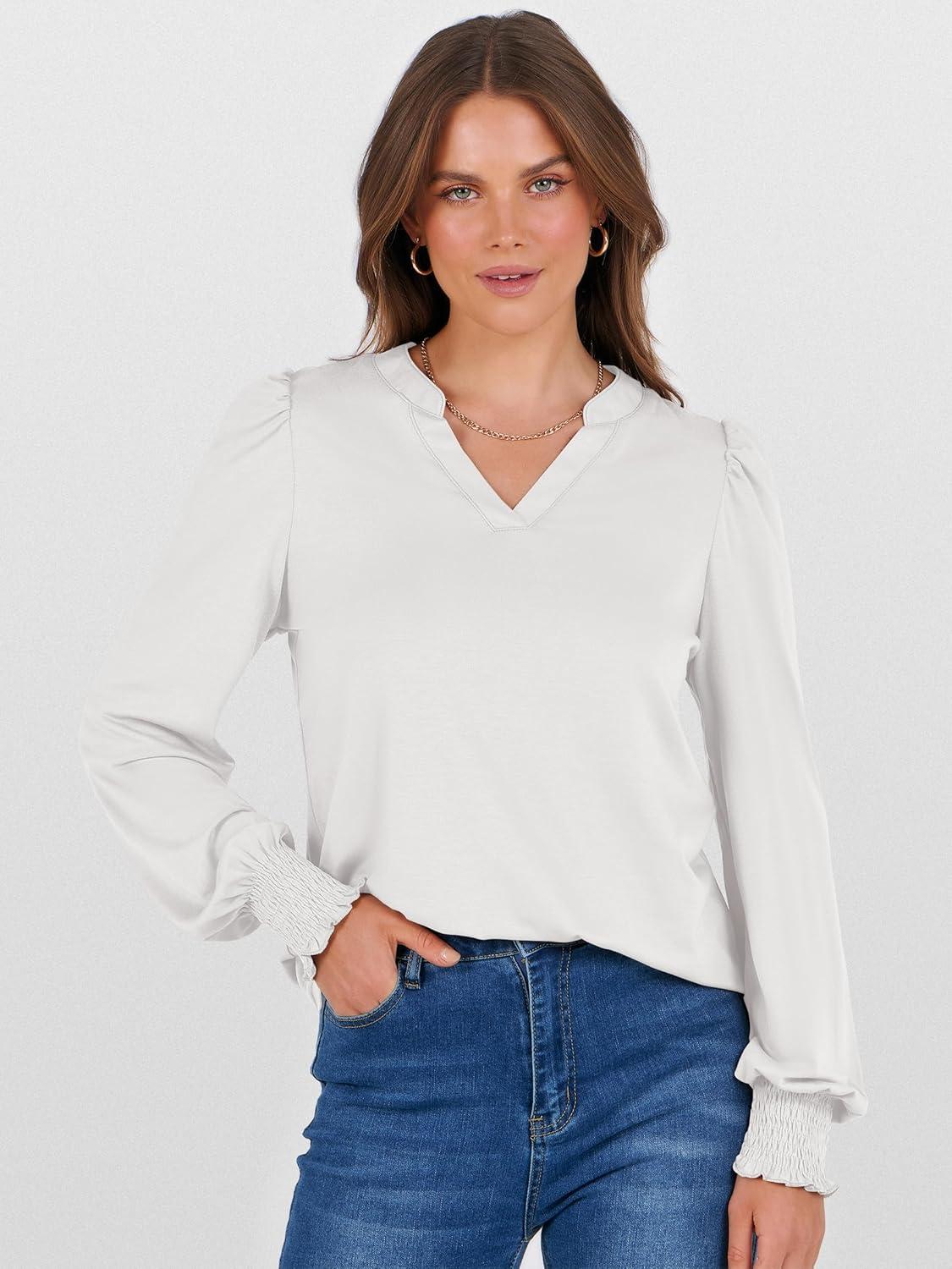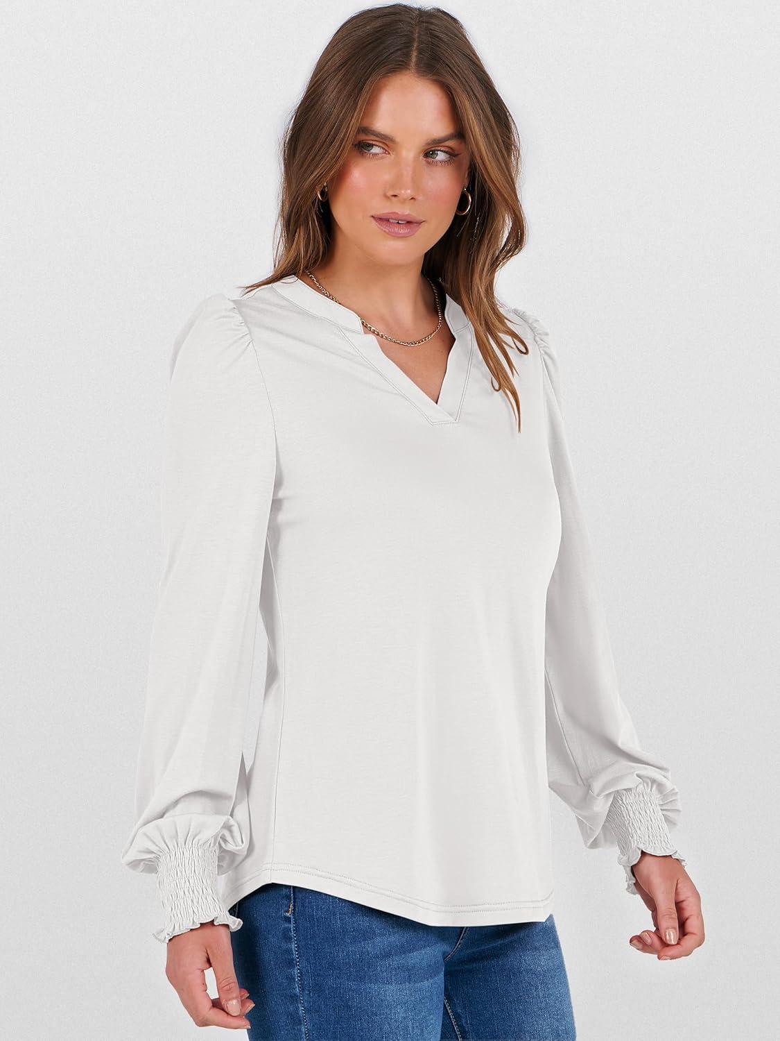 ANRABESS Women’s Puff Long Sleeve Shirts V Neck Loose T-Shirts Dressy Casual Work Blouses 2025 Fall Tops Trendy Clothes(White)