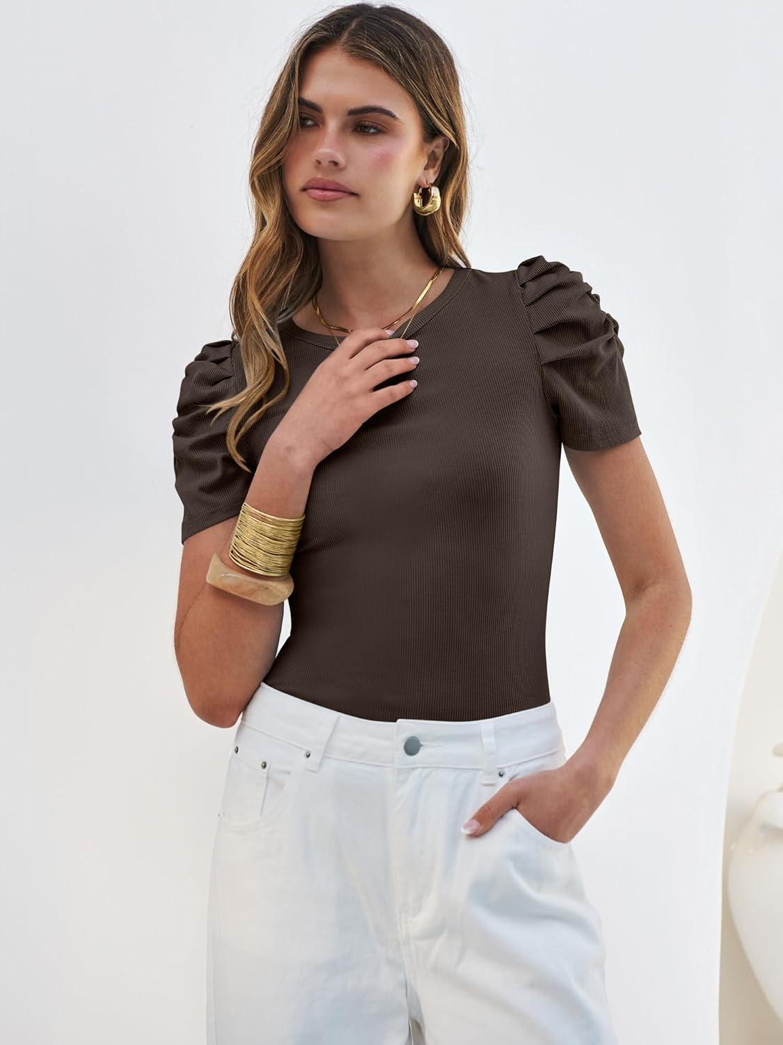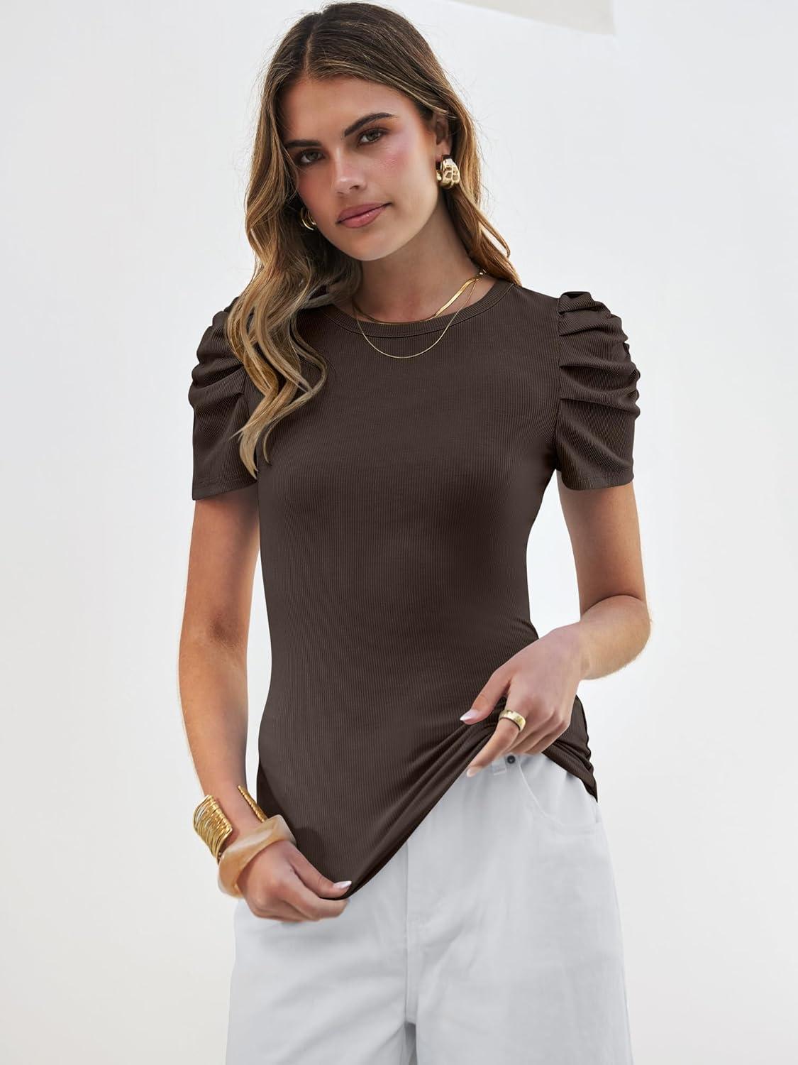ANRABESS Women’s Puff Sleeve Crewneck Dressy Casual Tops Summer Fitted Ribbed Knit Trendy Going Out T Shirts 2026 Spring(Coffee)