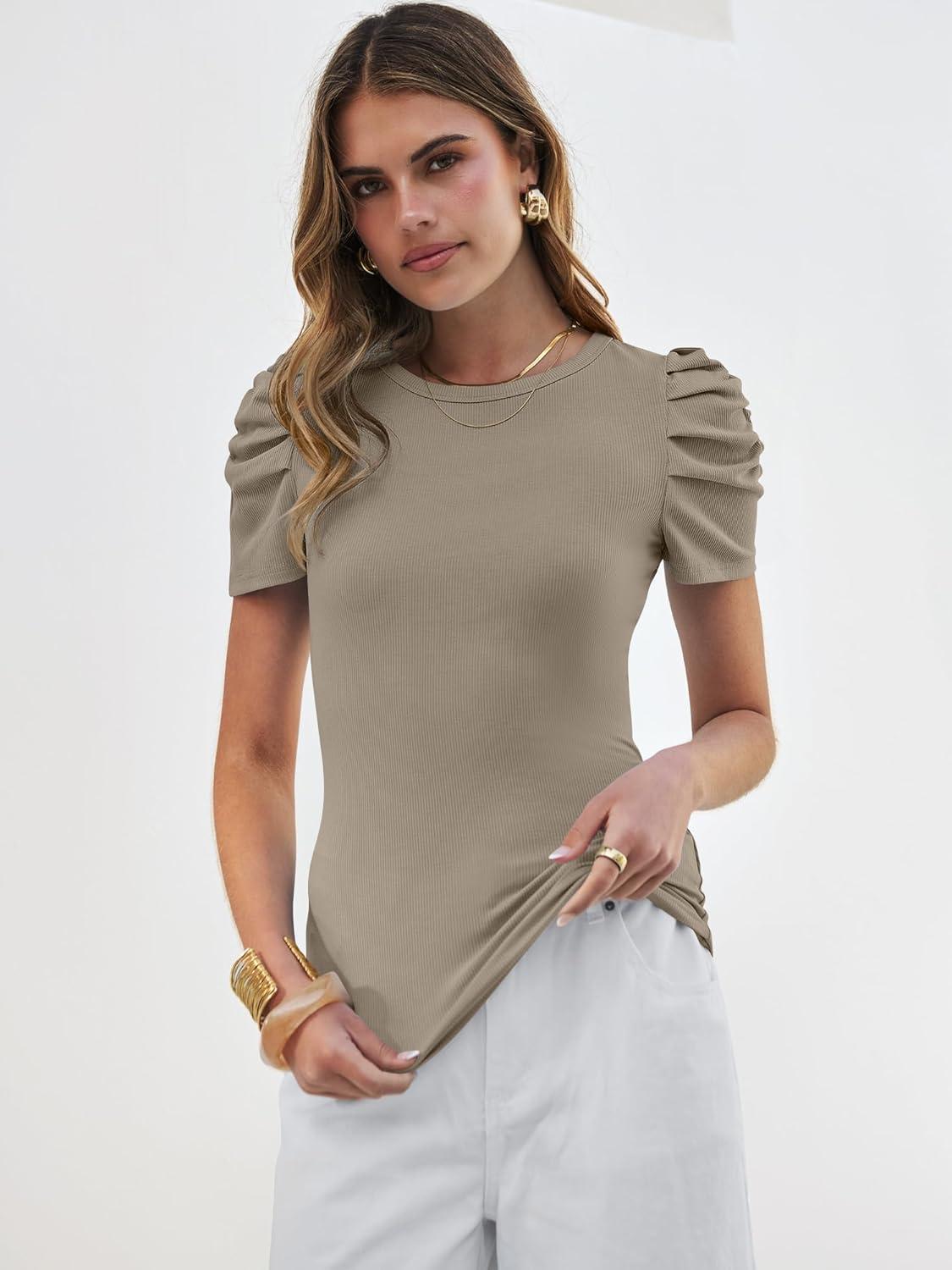 ANRABESS Women's Puff Sleeve Crewneck Dressy Casual Tops Summer Fitted Ribbed Knit Trendy Going Out T Shirts 2026 Spring(Light Khaki)