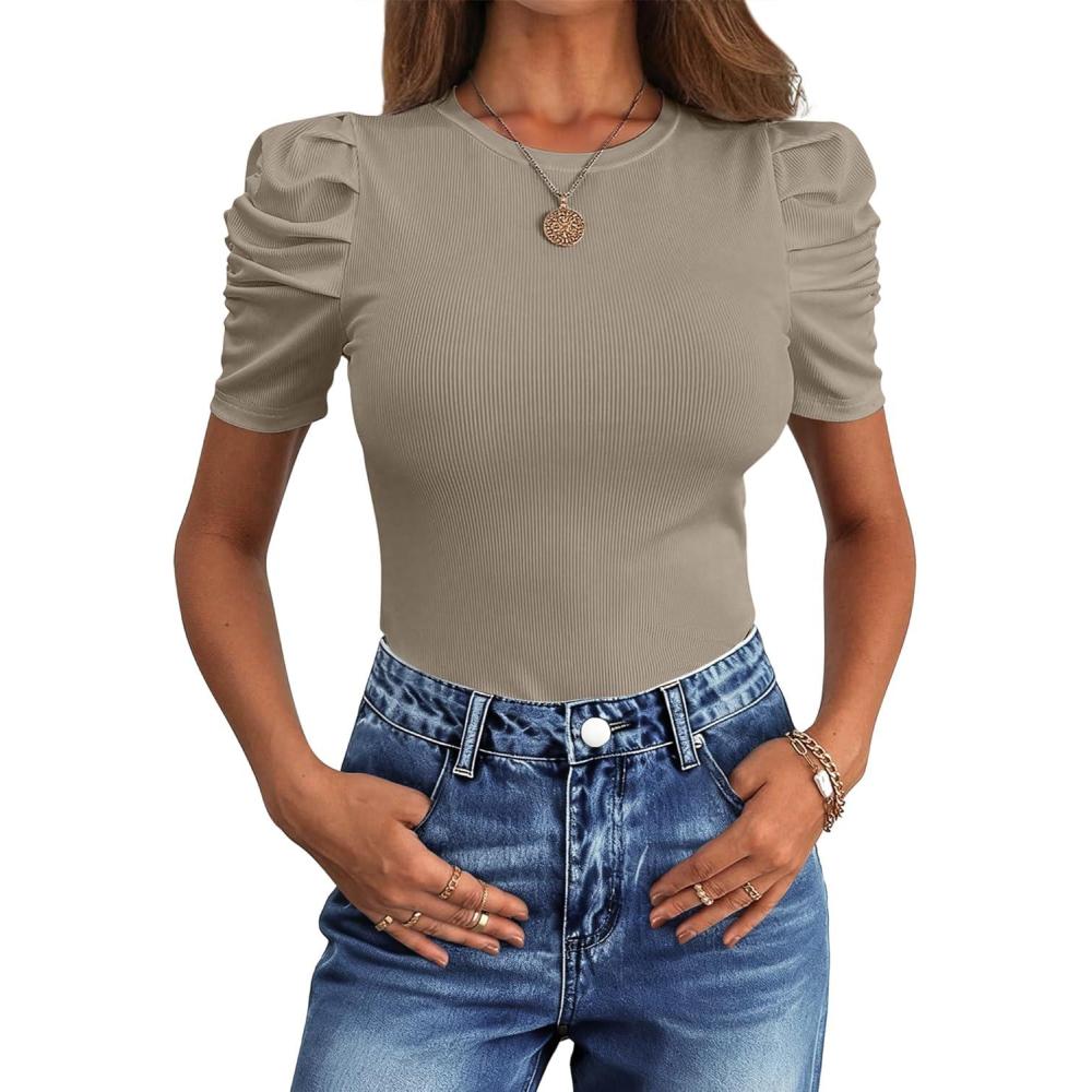 ANRABESS Women’s Puff Sleeve Crewneck Dressy Casual Tops Summer Fitted Ribbed Knit Trendy Going Out T Shirts 2026 Spring(Light Khaki)