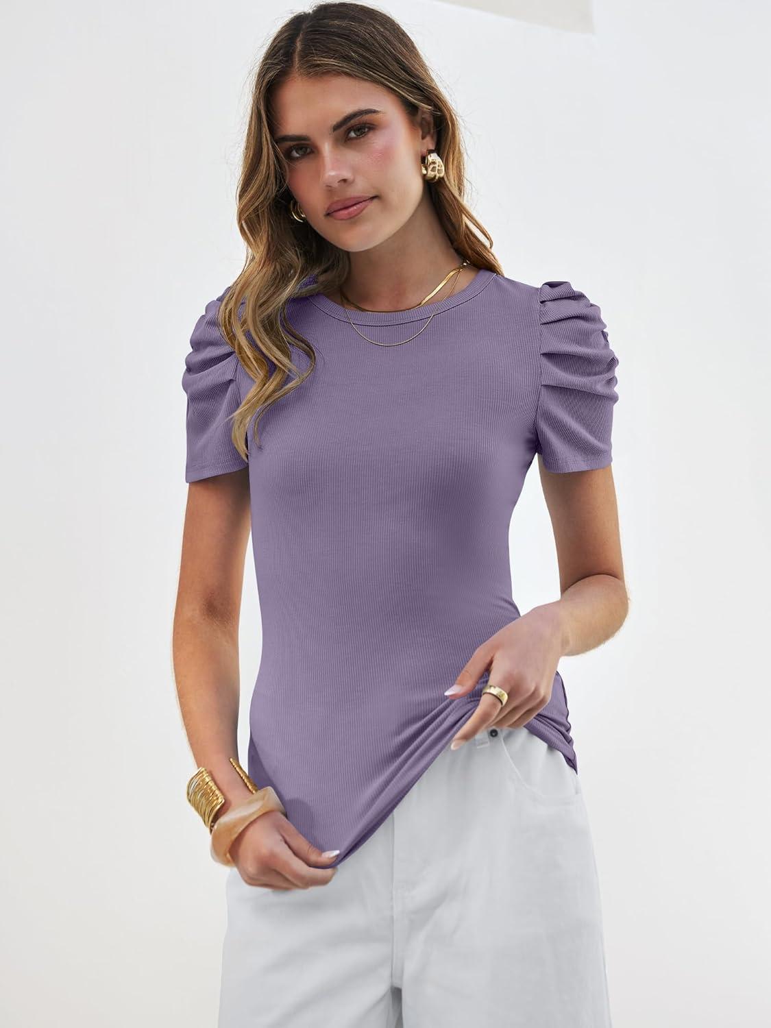ANRABESS Women’s Puff Sleeve Crewneck Dressy Casual Tops Summer Fitted Ribbed Knit Trendy Going Out T Shirts 2026 Spring(Purple)