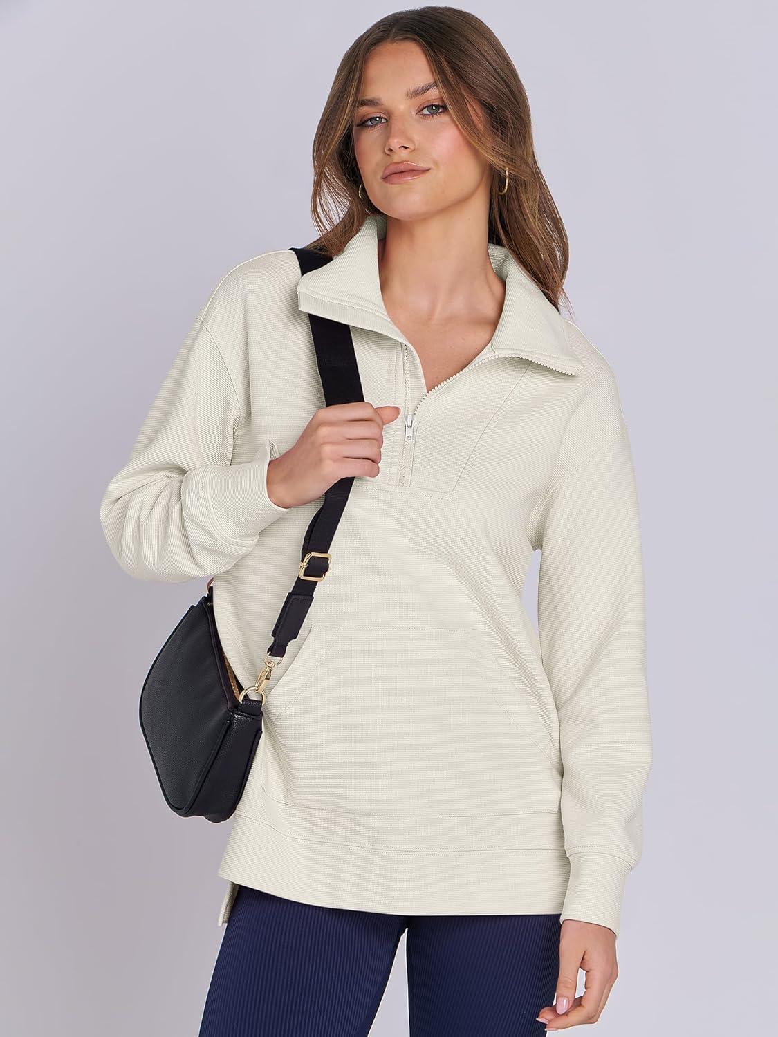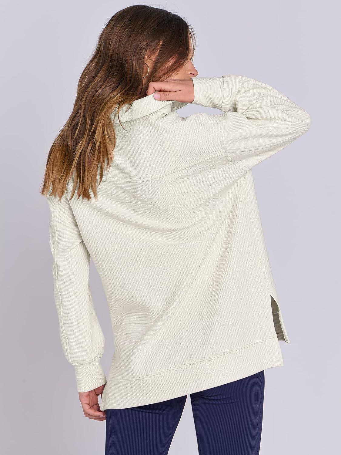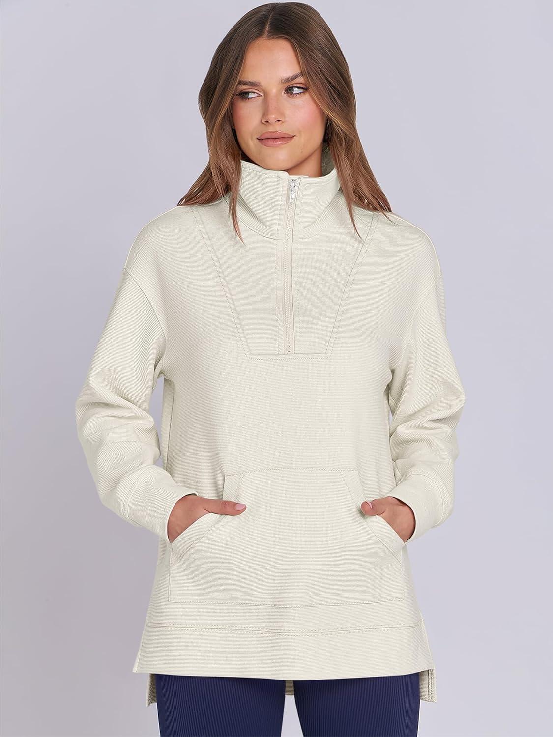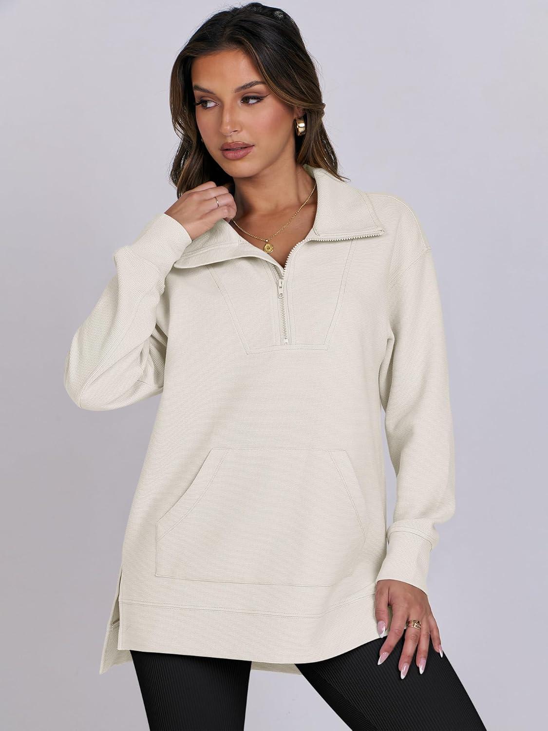 imageANRABESS Womens Quarter Zip Oversized Long Sleeve Ribbed Knit Tunic SweatshirtsBeige