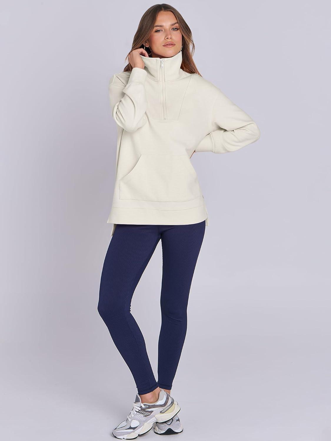 ANRABESS Womens Quarter Zip Oversized Long Sleeve Ribbed Knit Tunic Sweatshirts(Beige)