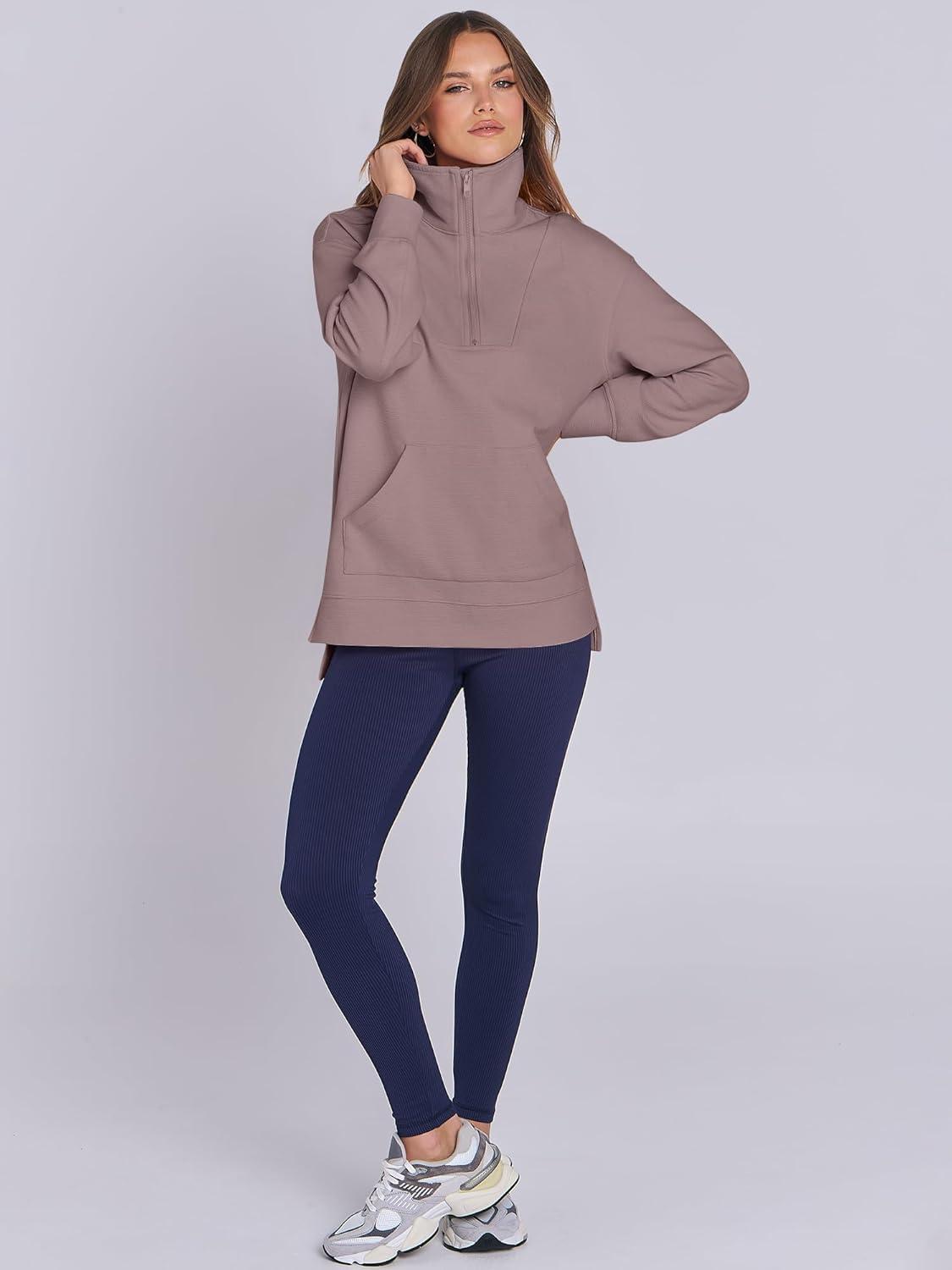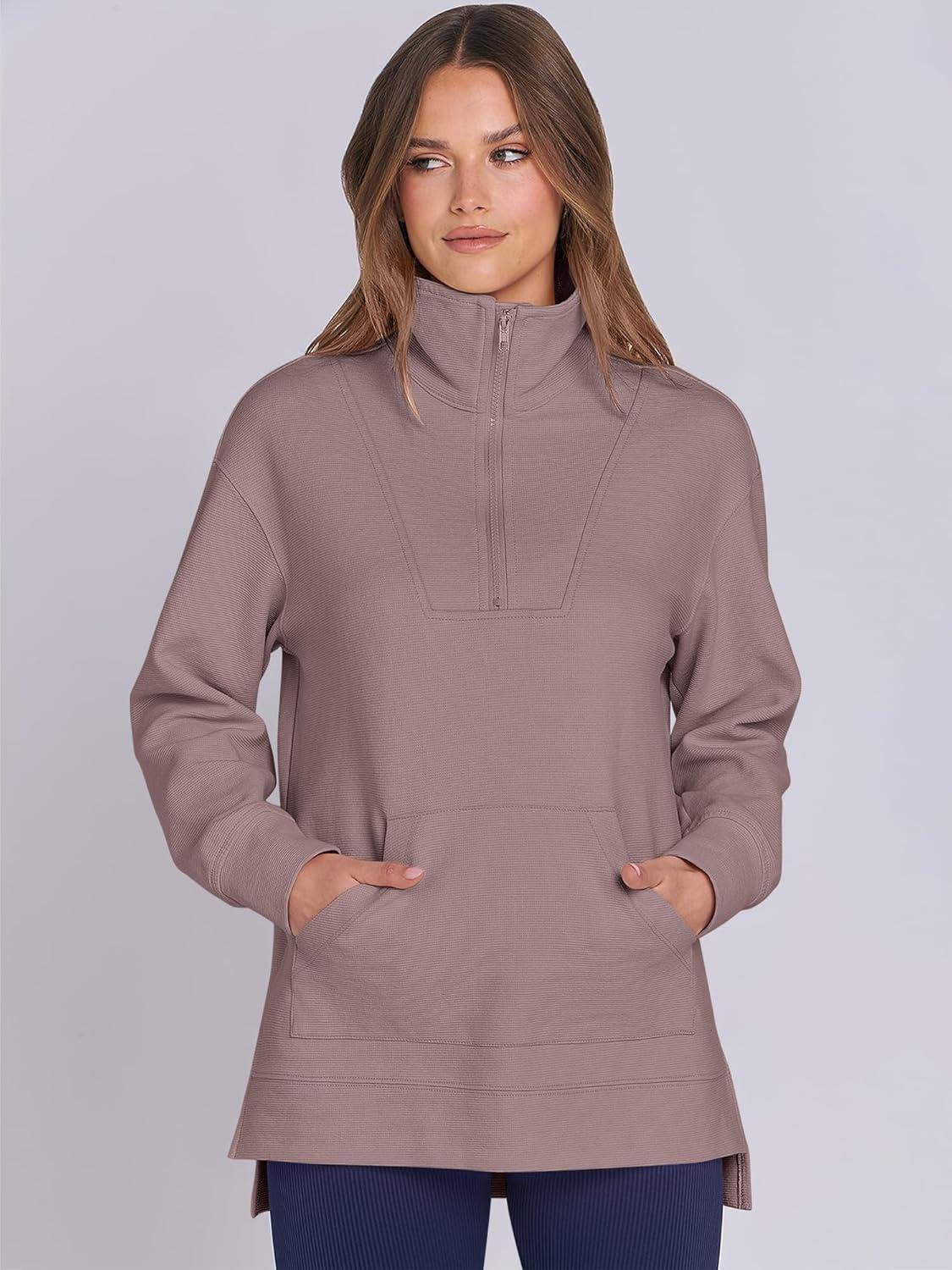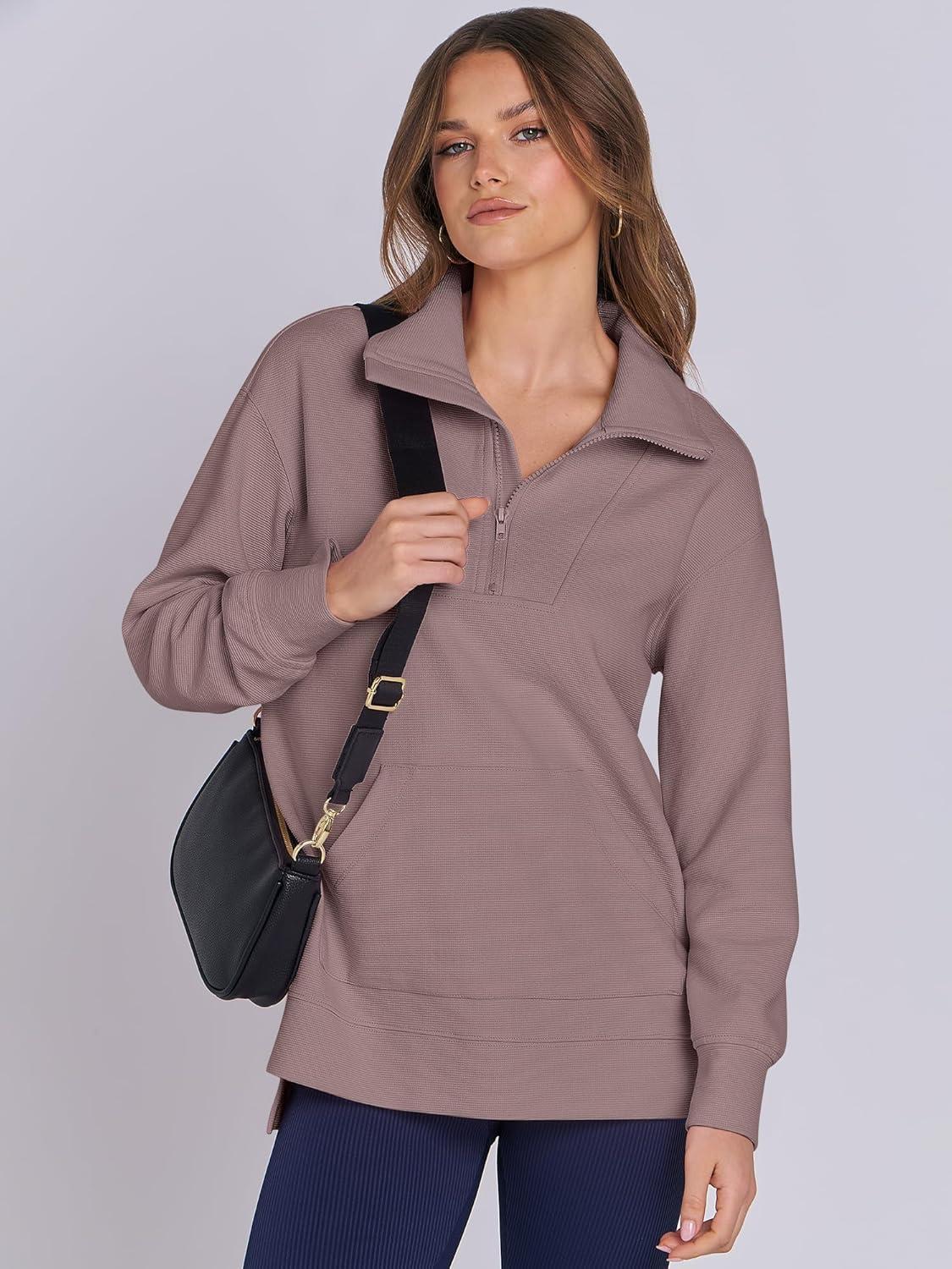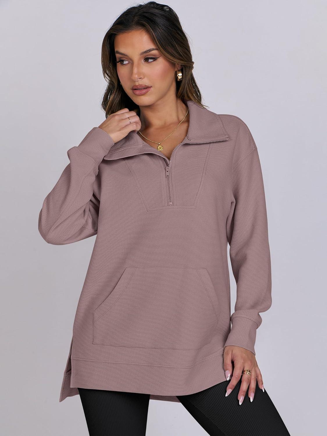 imageANRABESS Womens Quarter Zip Oversized Long Sleeve Ribbed Knit Tunic SweatshirtsCoffee