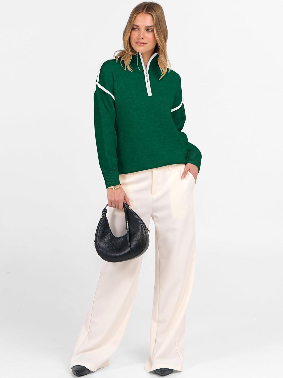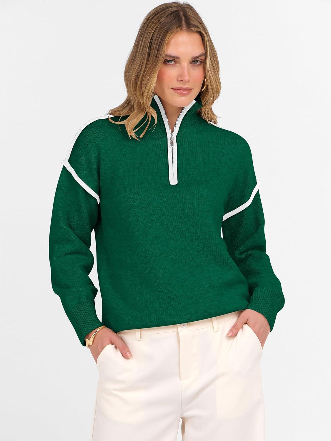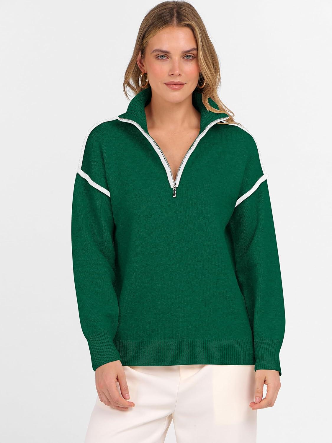 ANRABESS Womens Quarter Zip Sweaters Fall Long Sleeve V Neck Shirts Collared Business Casual Tops Knit Pullover Sweatshirts(Forest Green)