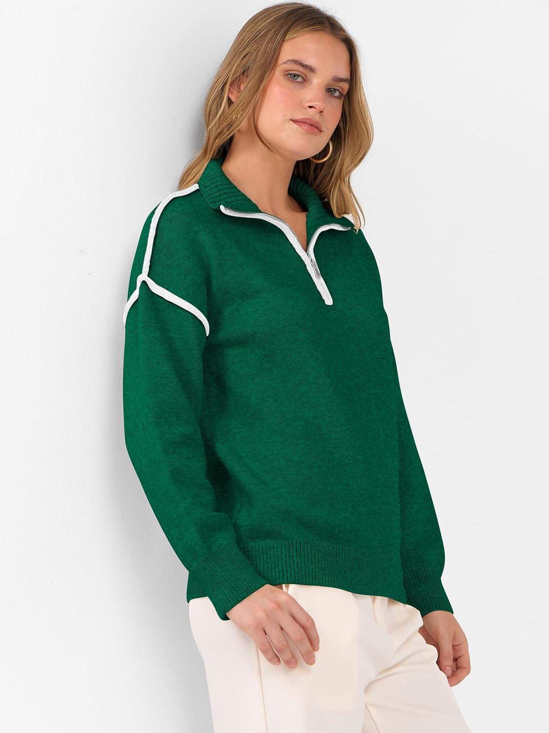 imageANRABESS Womens Quarter Zip Sweaters Fall Long Sleeve V Neck Shirts Collared Business Casual Tops Knit Pullover SweatshirtsForest Green