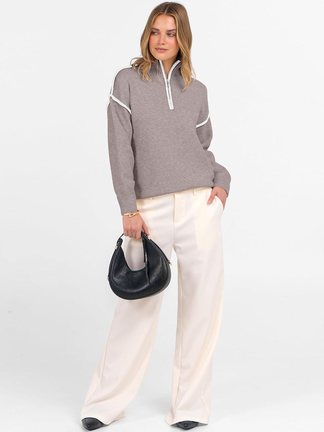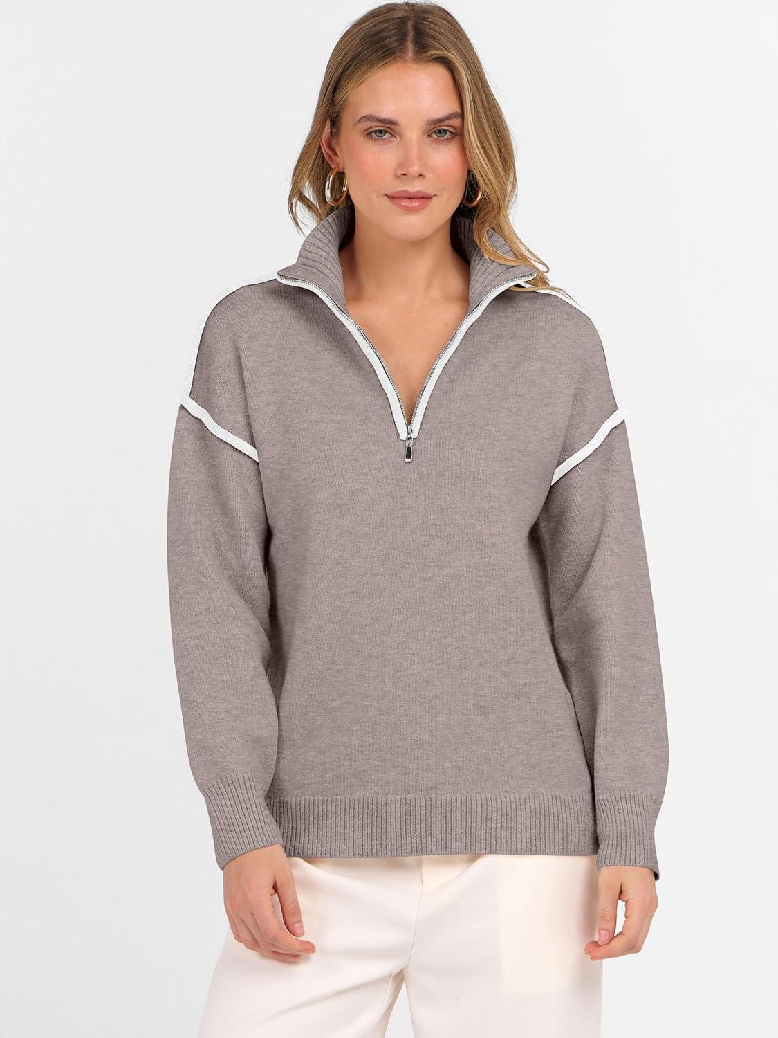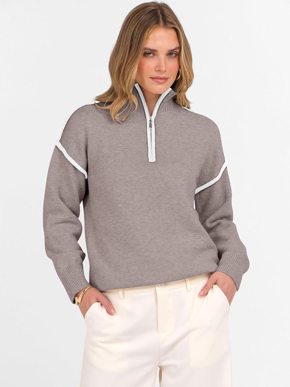 ANRABESS Womens Quarter Zip Sweaters Fall Long Sleeve V Neck Shirts Collared Business Casual Tops Knit Pullover Sweatshirts(Grey Khaki)