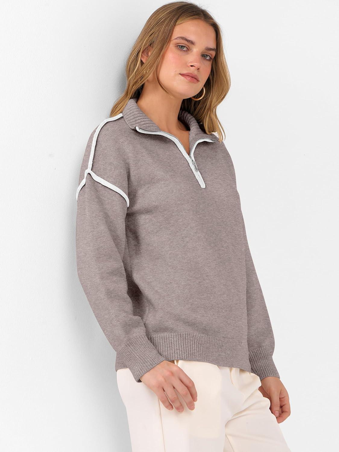 imageANRABESS Womens Quarter Zip Sweaters Fall Long Sleeve V Neck Shirts Collared Business Casual Tops Knit Pullover SweatshirtsGrey Khaki
