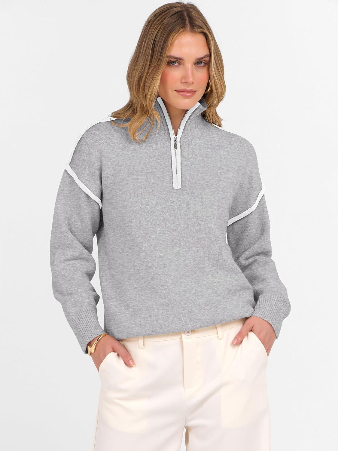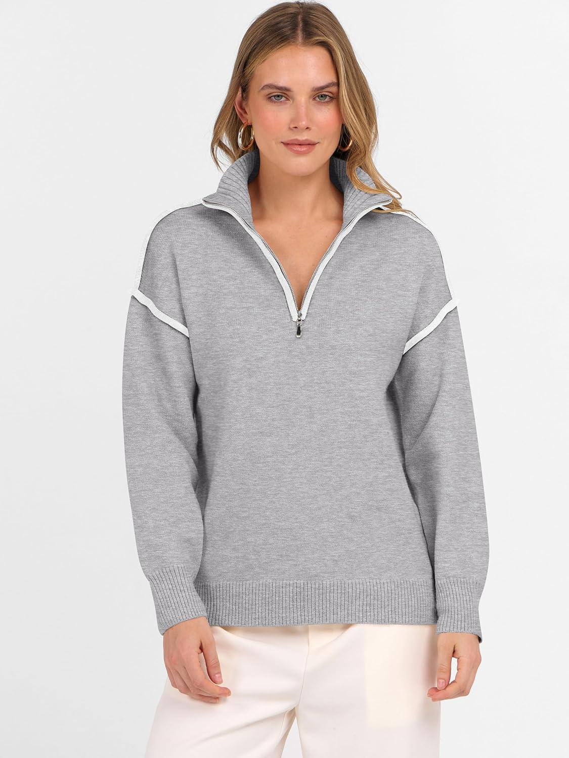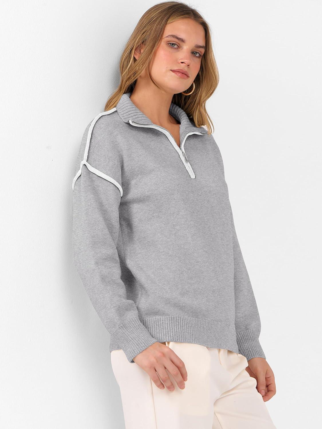 ANRABESS Womens Quarter Zip Sweaters Fall Long Sleeve V Neck Shirts Collared Business Casual Tops Knit Pullover Sweatshirts(Grey)