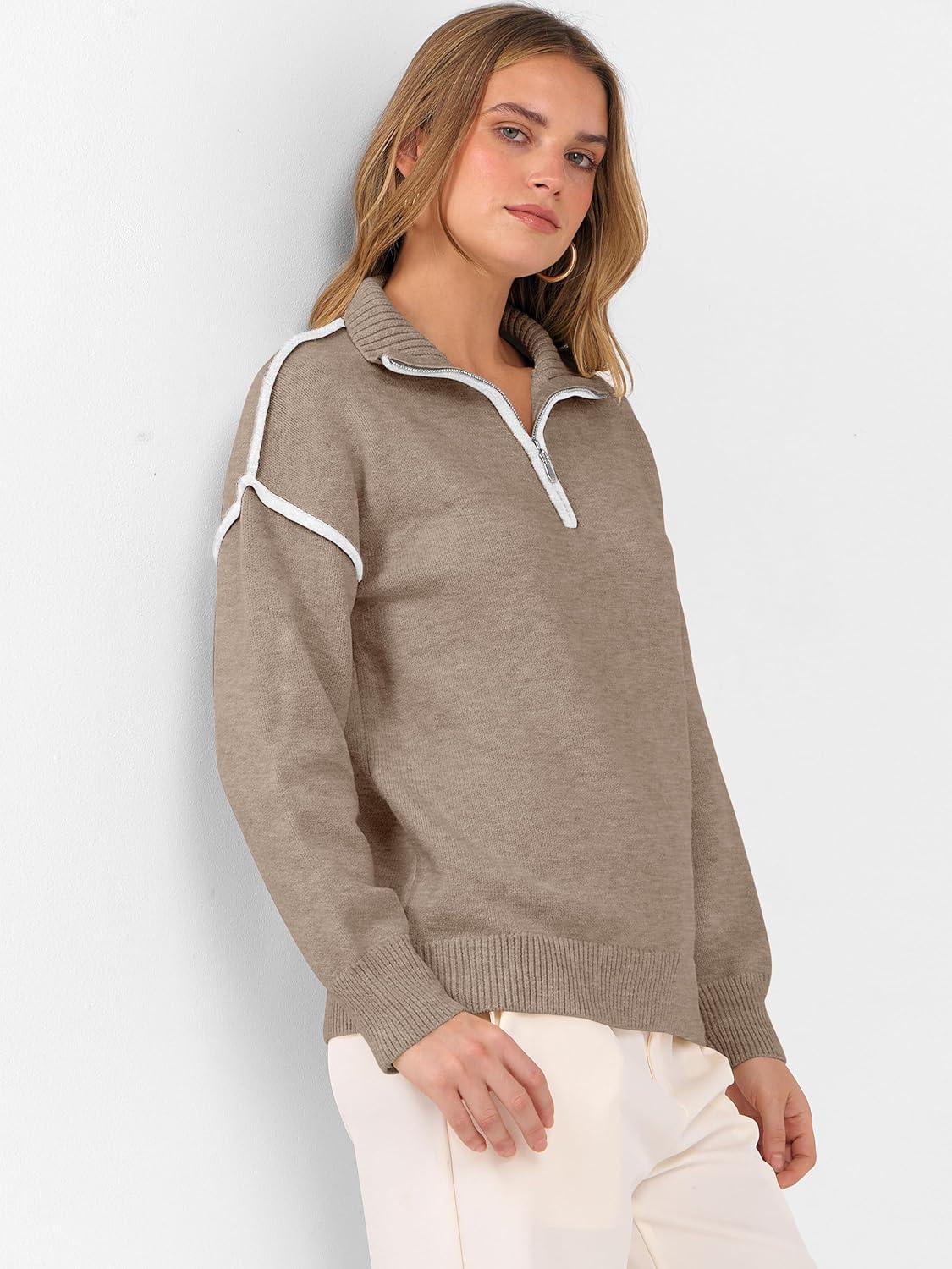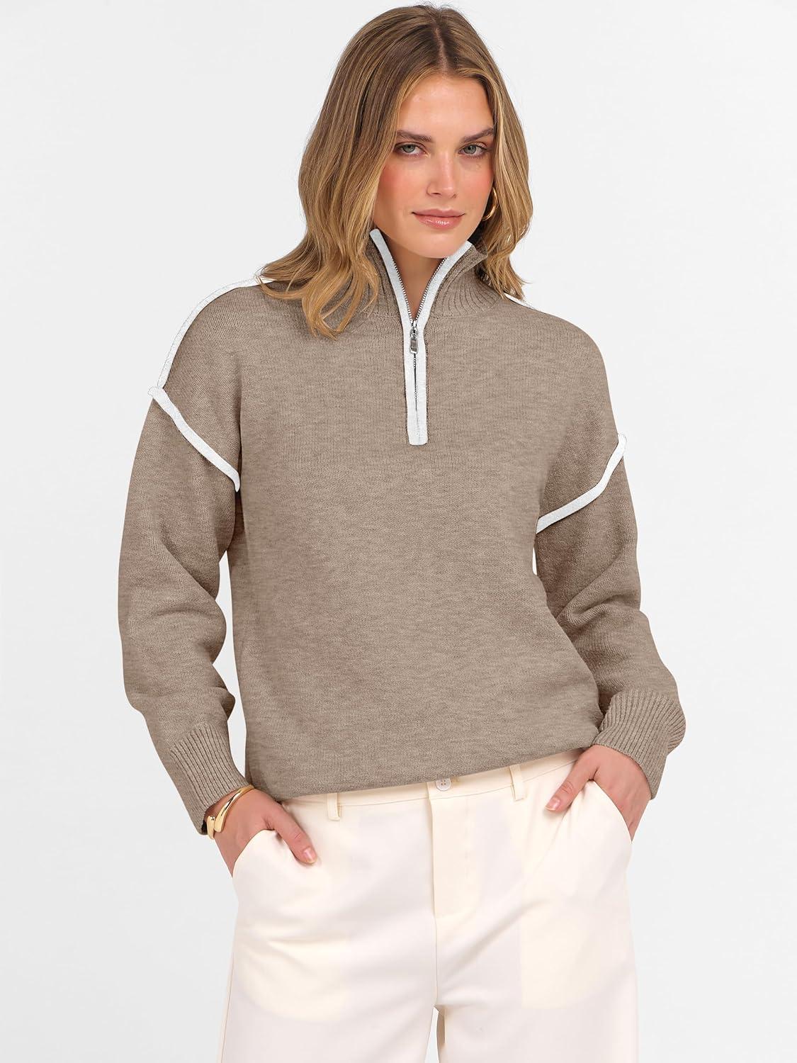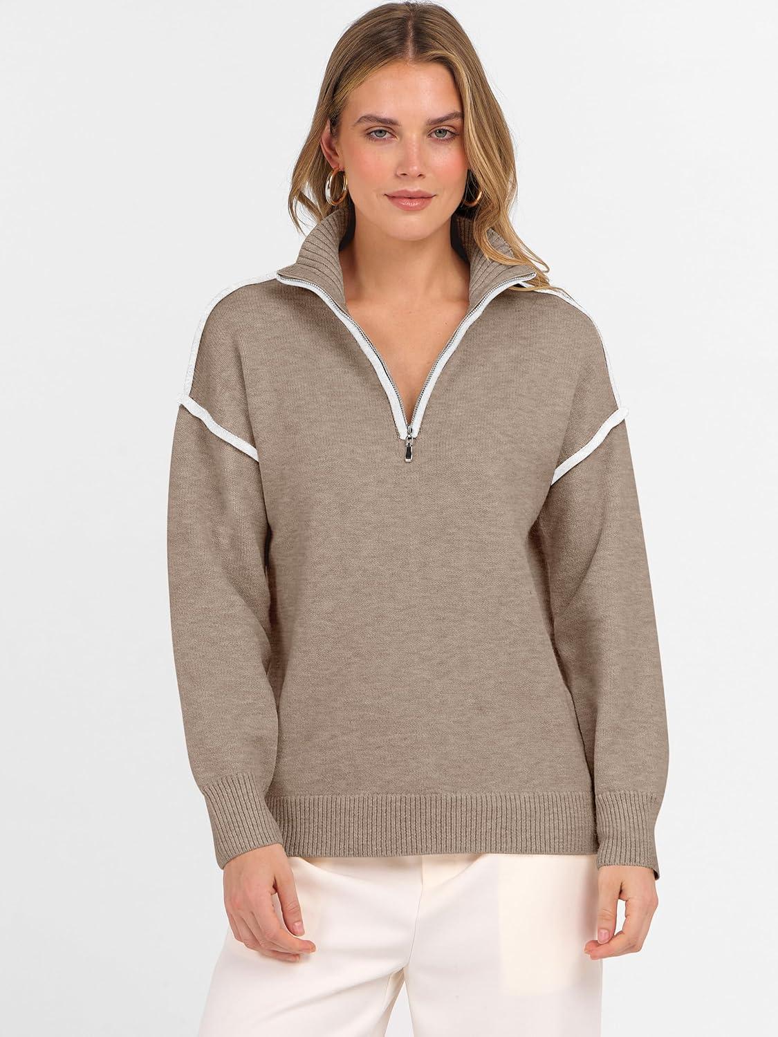 ANRABESS Womens Quarter Zip Sweaters Fall Long Sleeve V Neck Shirts Collared Business Casual Tops Knit Pullover Sweatshirts(Tan)