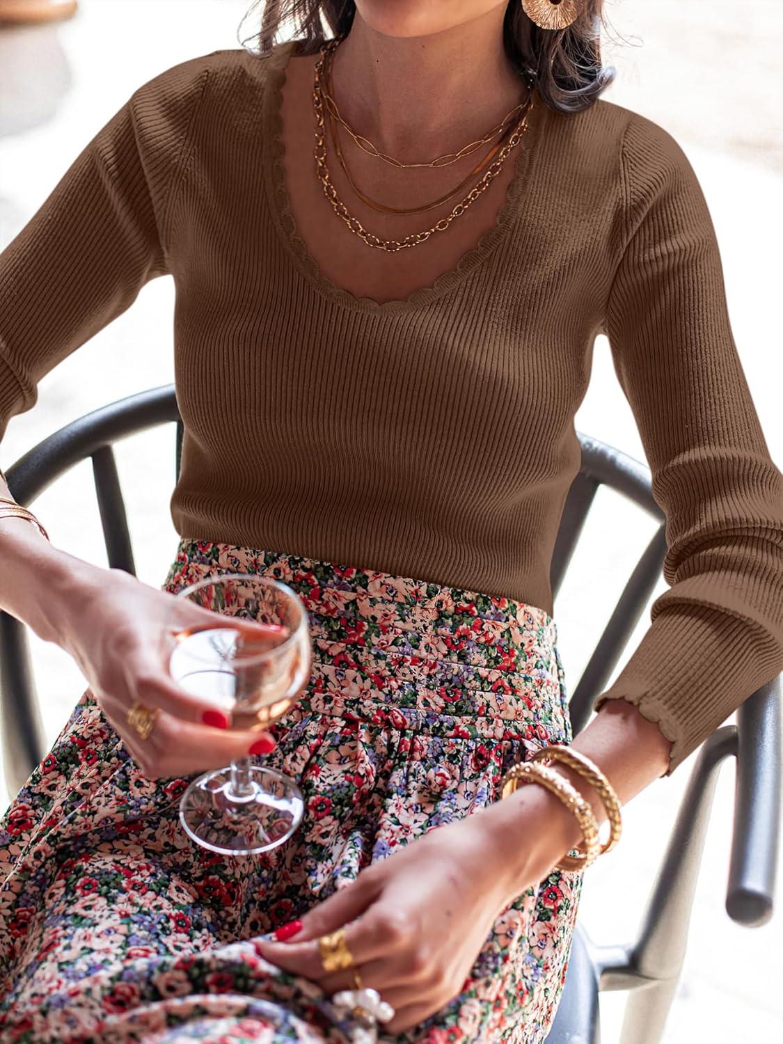 ANRABESS Womens Ribbed Fitted Sweater Long Sleeve Shirts Scoop Neck Lightweight Casual Knit Slim Tops 2025 Fall Outfits(Brown)