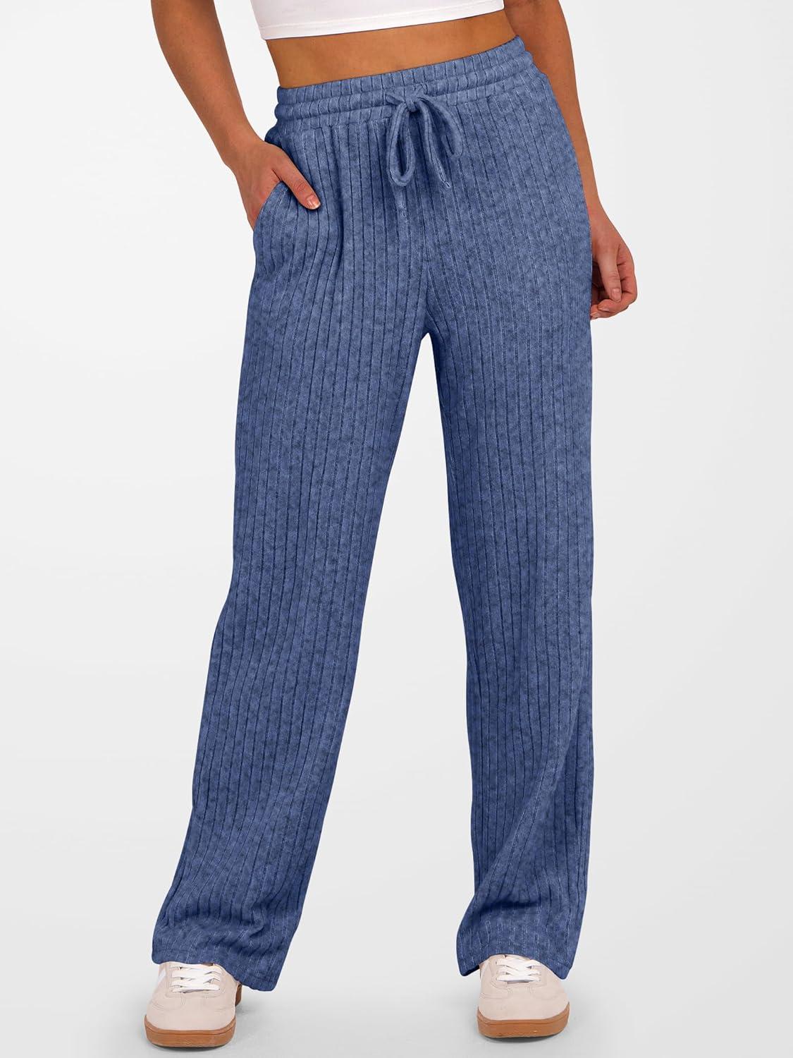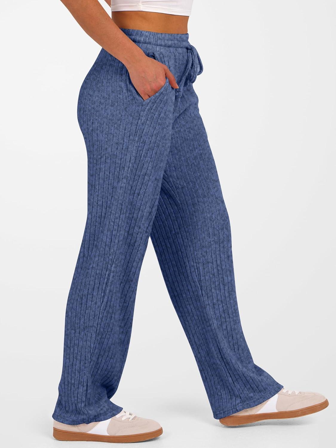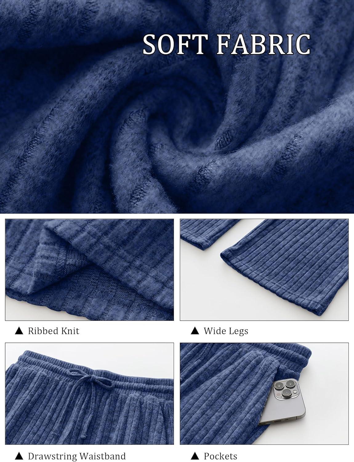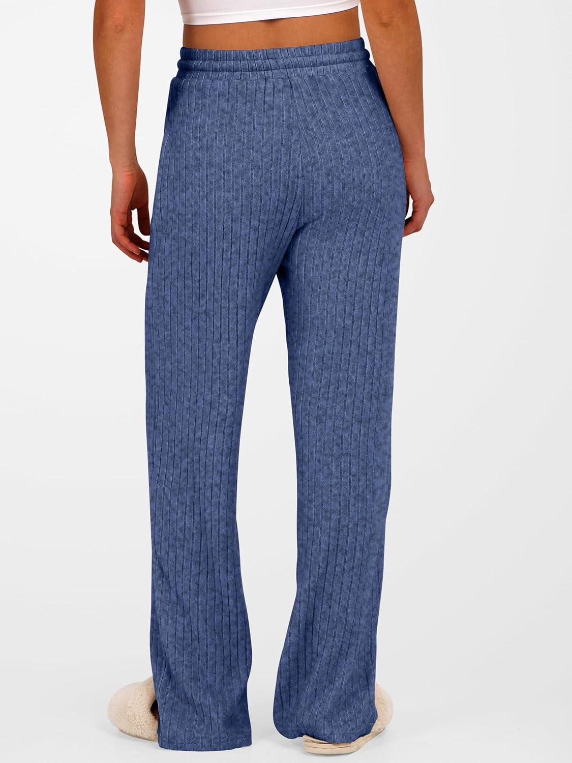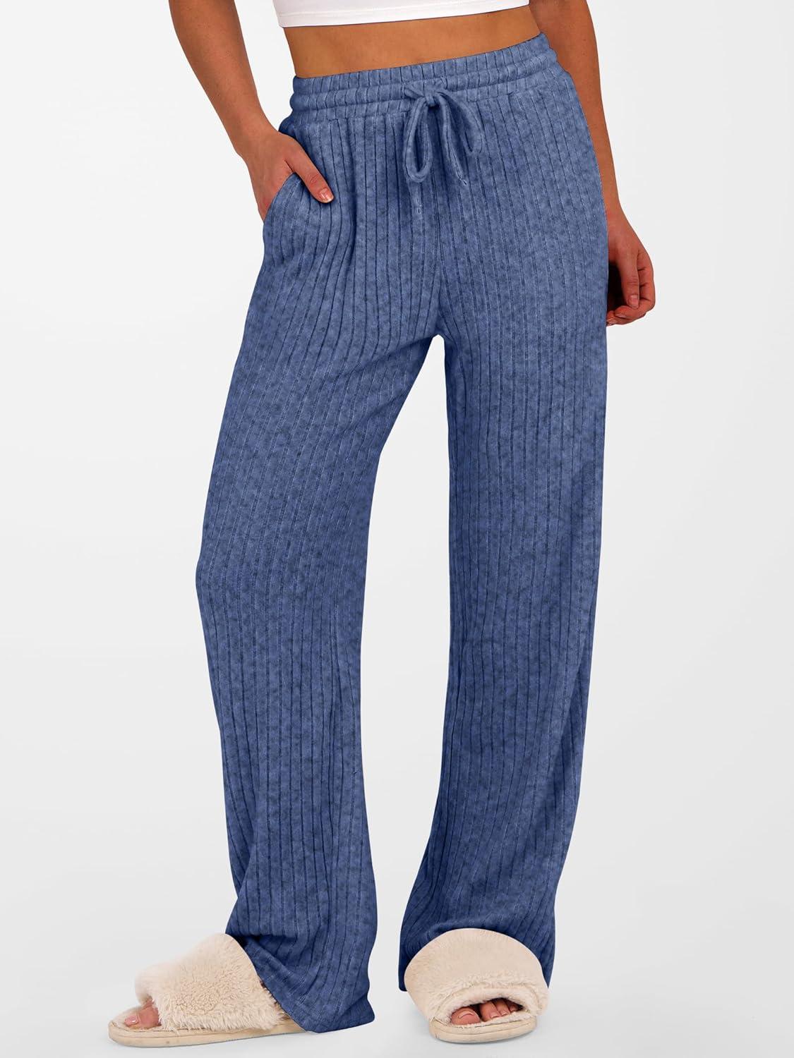 ANRABESS Womens Ribbed Knit Lounge Pajama Pants Soft Fuzzy Comfy Straight Leg Drawstring Fall Loose Pj Bottoms with Pockets(Dark Blue)