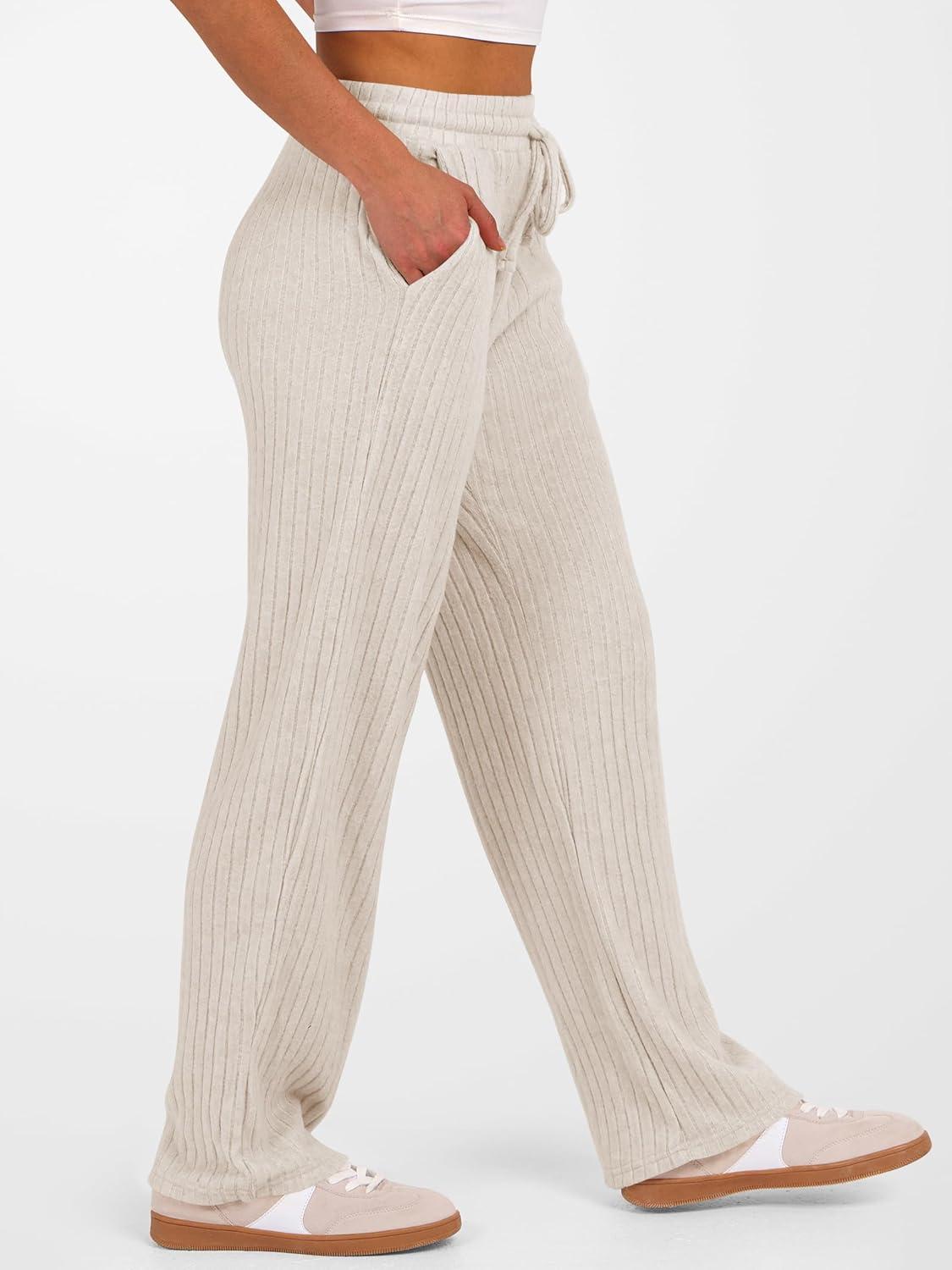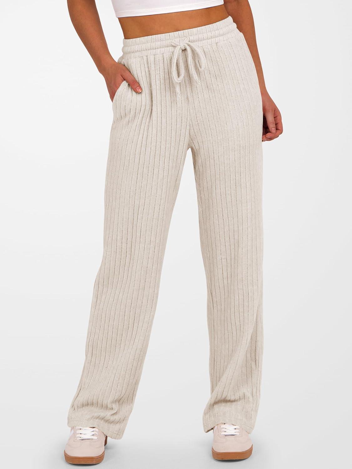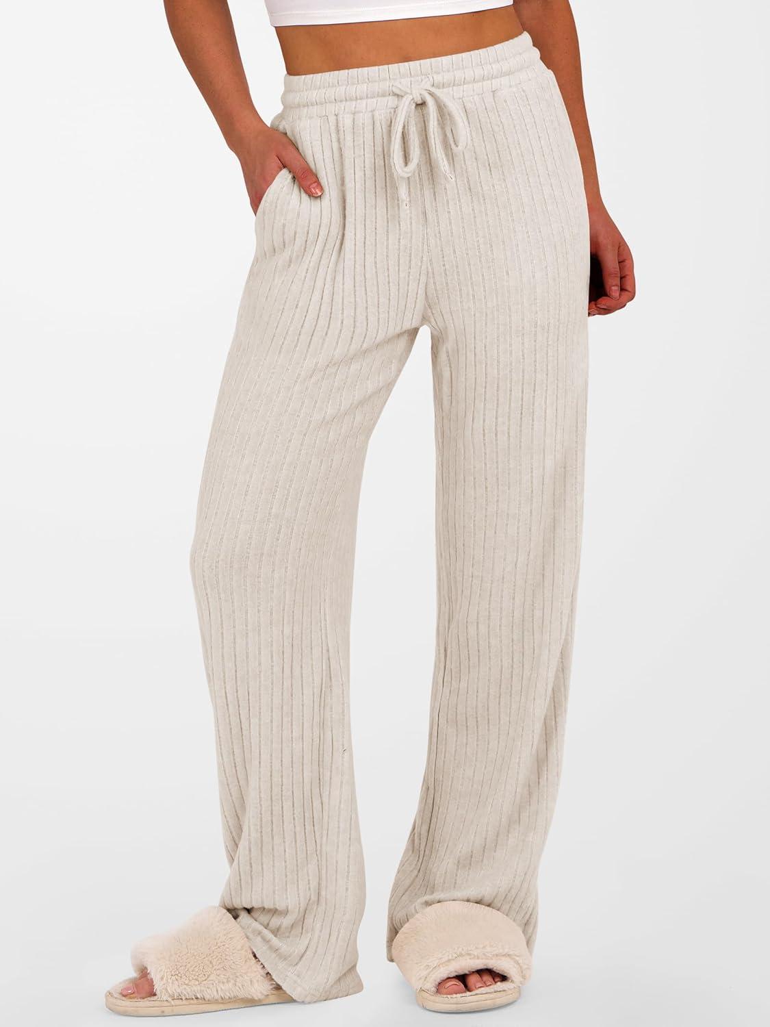 ANRABESS Womens Ribbed Knit Lounge Pajama Pants Soft Fuzzy Comfy Straight Leg Drawstring Fall Loose Pj Bottoms with Pockets(Light Khaki)