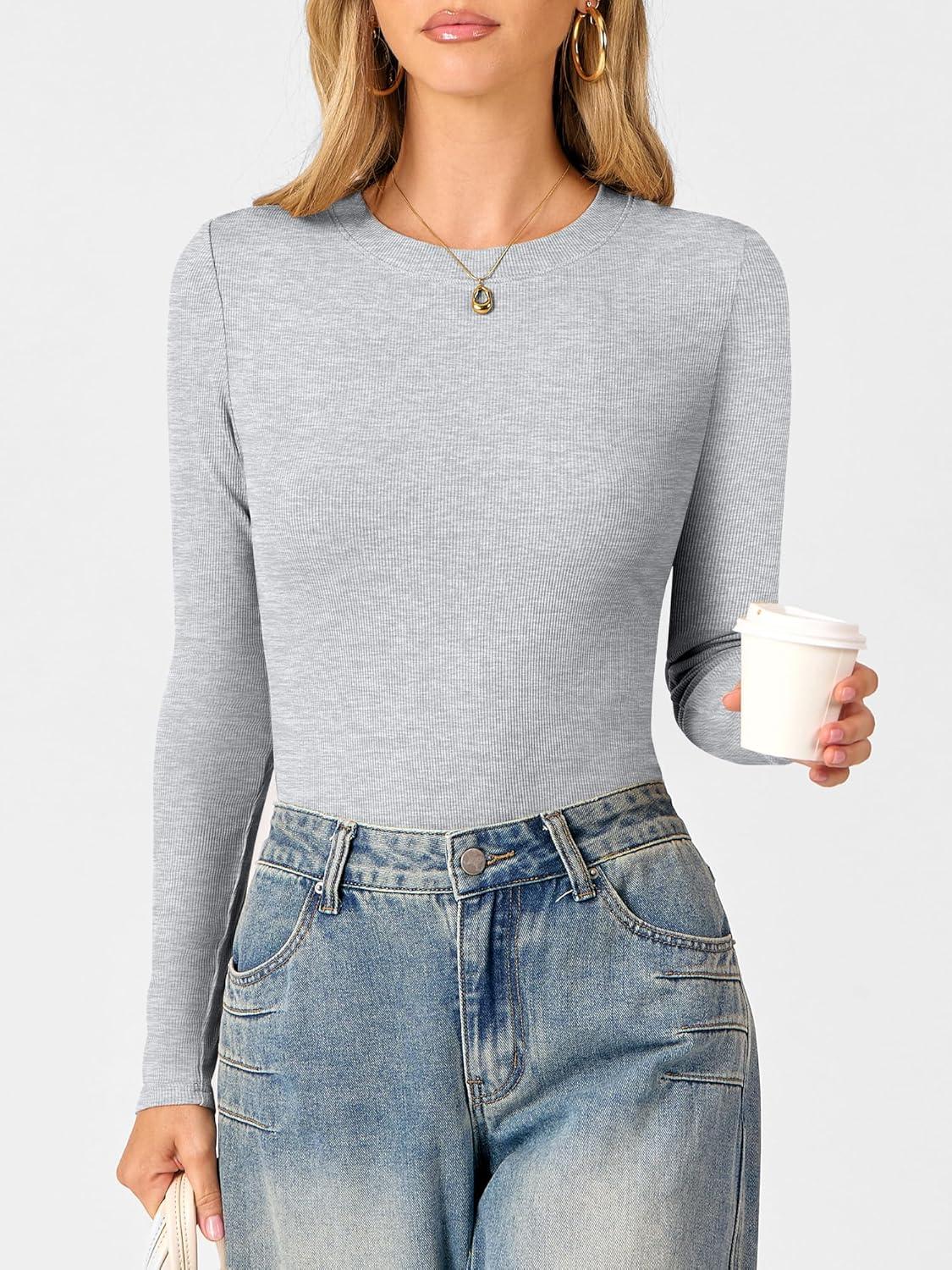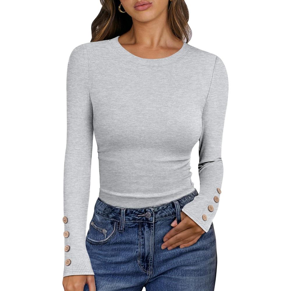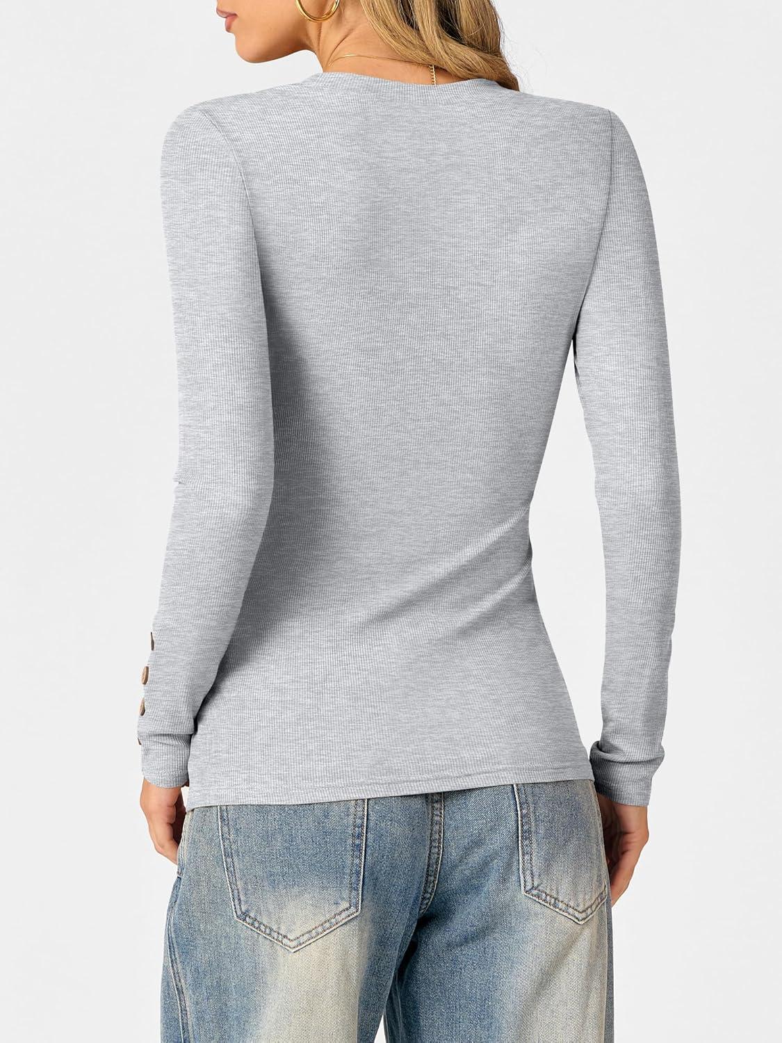 ANRABESS Womens Ribbed Long Sleeve Tops Slim Fitted Dressy Shirts Basic Tee Tshirts 2025 Fall Fasion Outfits with Buttons(Bright Grey)