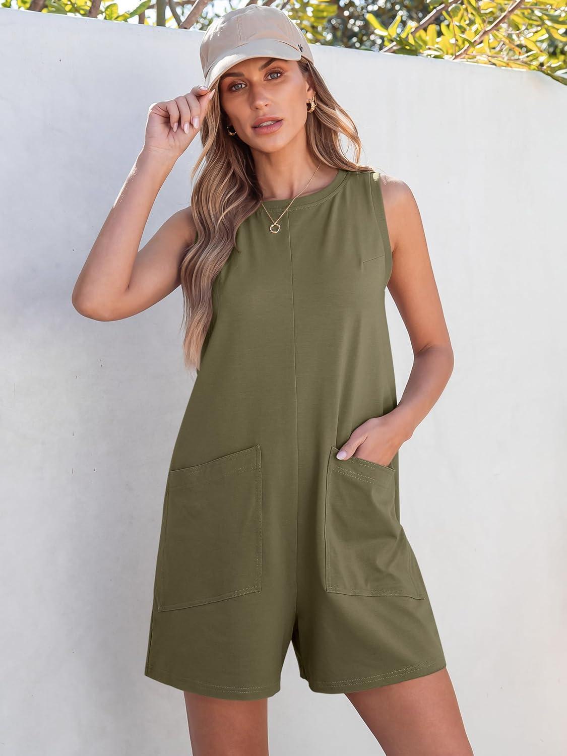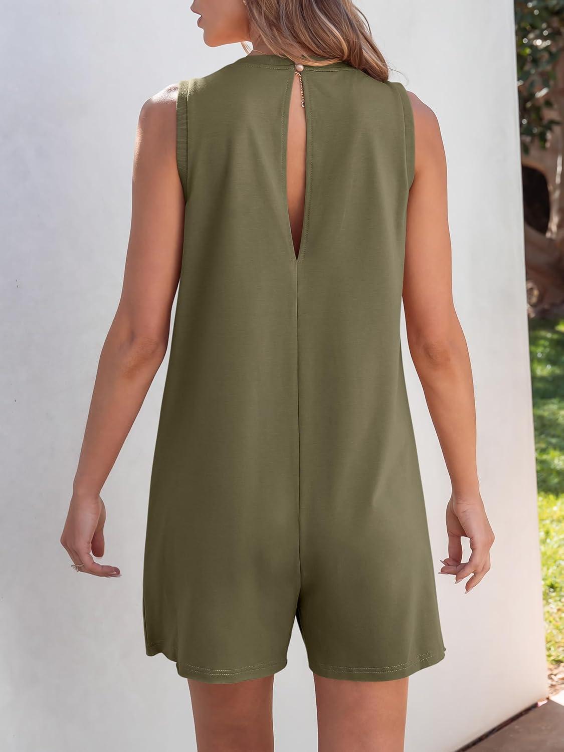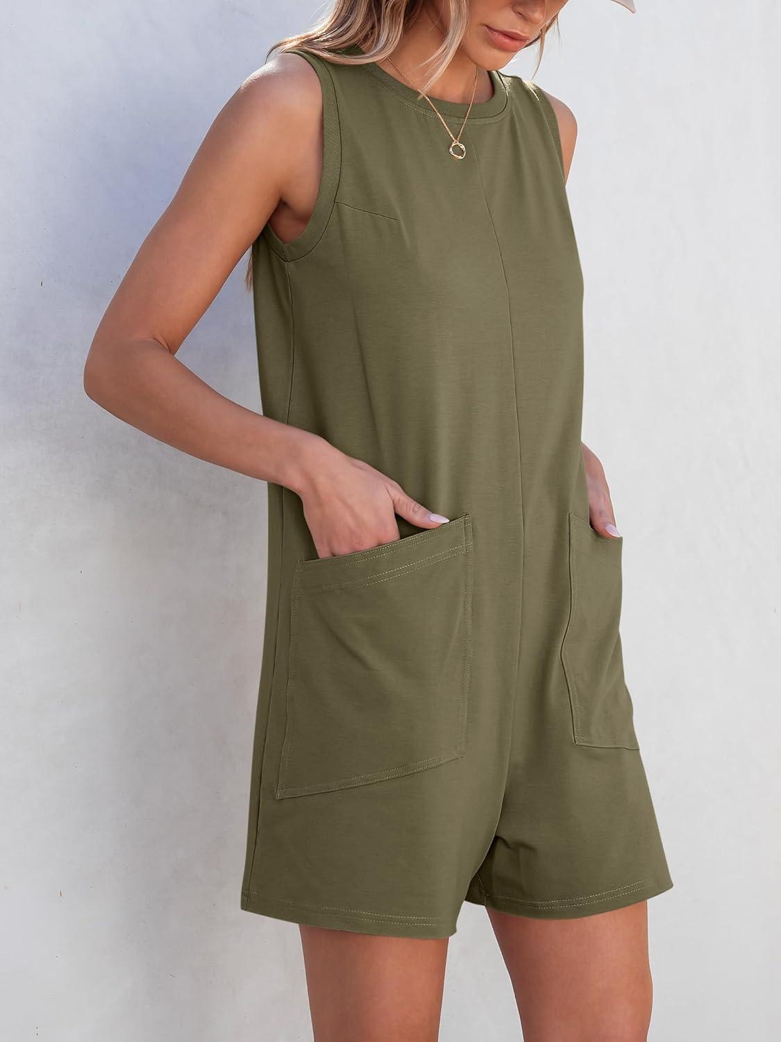 ANRABESS Womens Romper Casual Loose Sleeveless 2025 Summer One Piece Outfit Crewneck Short Jumpsuit Overall Outfits & Pockets(Army Green)